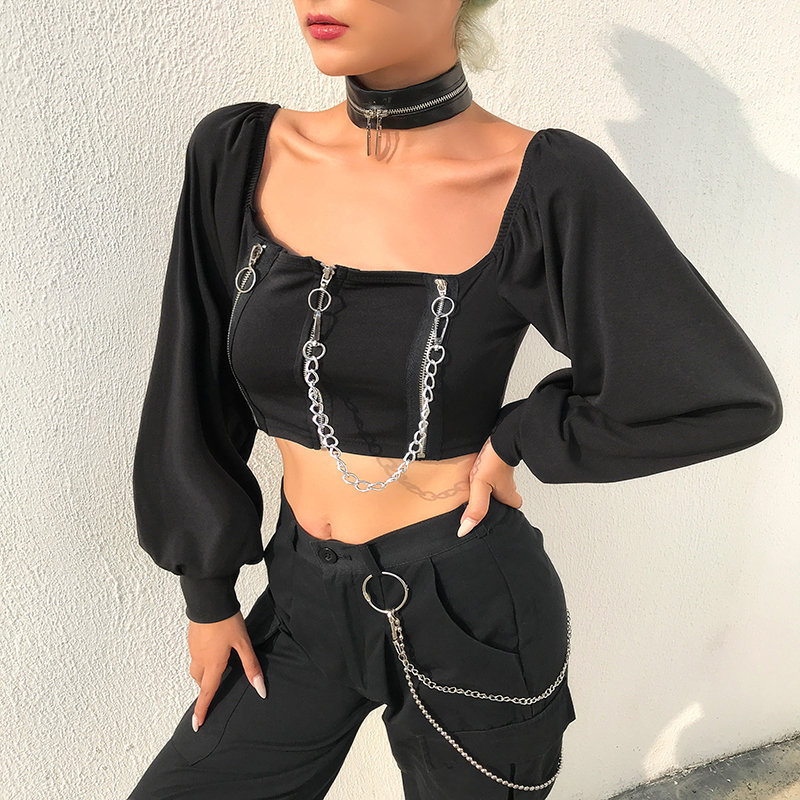 Retro Streetwear Chain Zipper Square Neckline Long Sleeve Sexy Crop Top