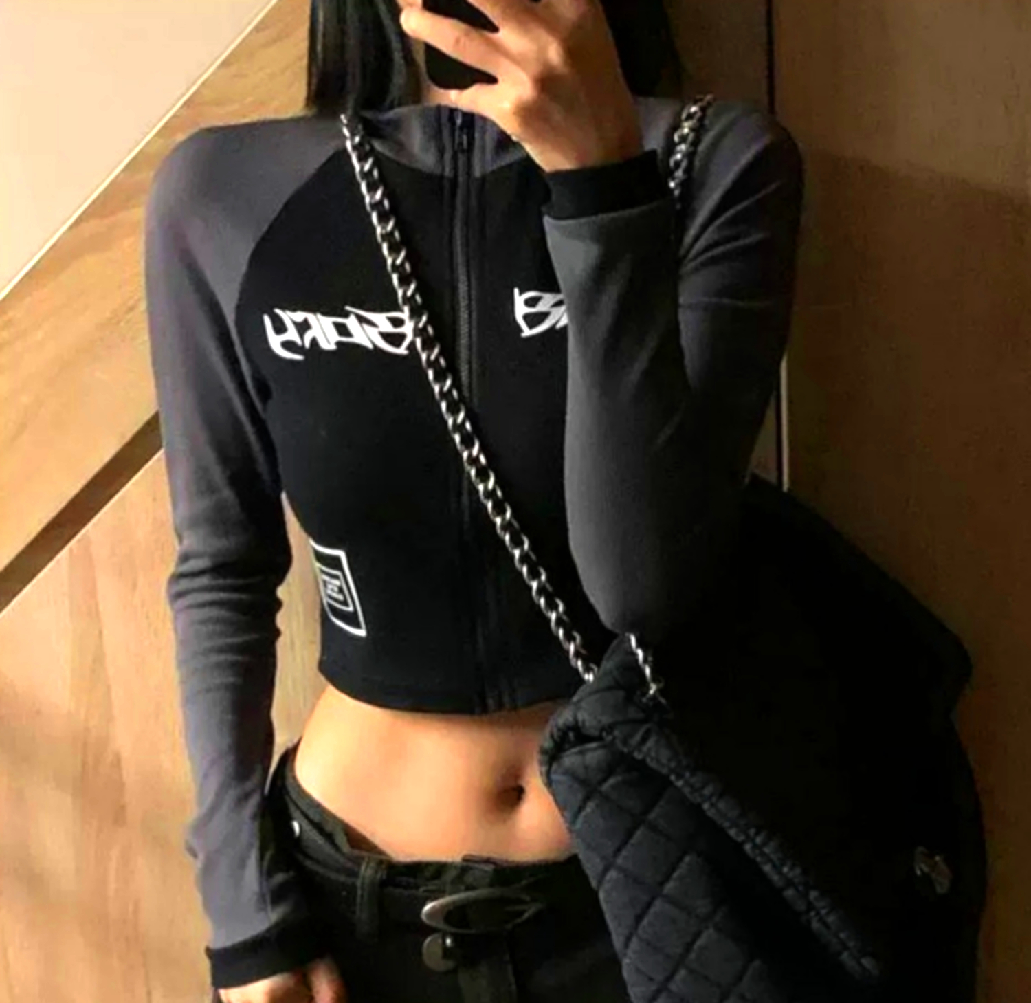 Stunning Punk Bike Patchwork Zipper Long Sleeve Slinky Crop Top Streetwear Dance Yoga Y2K Amazing