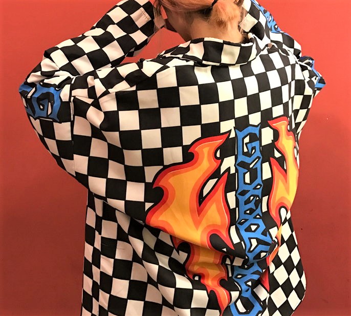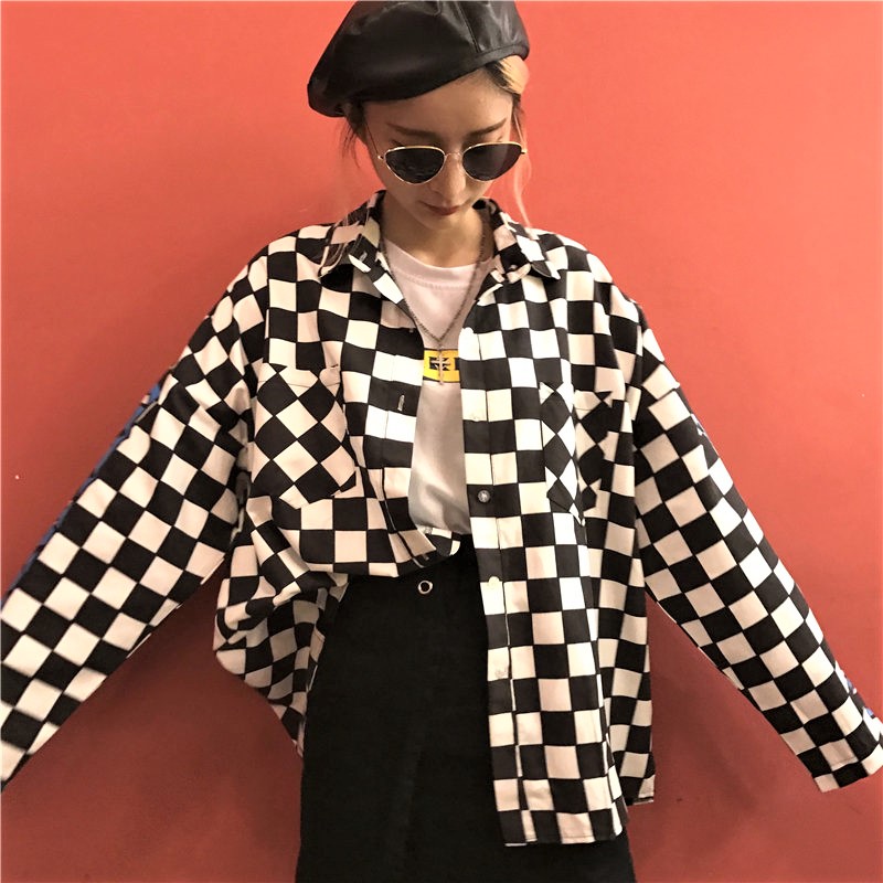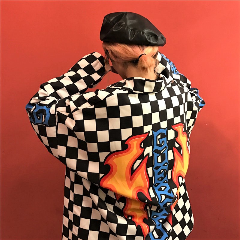 Retro Hip Hop Punk Square Black White Fire Flame Prints Long Sleeve Loose Blouse