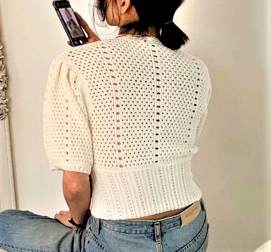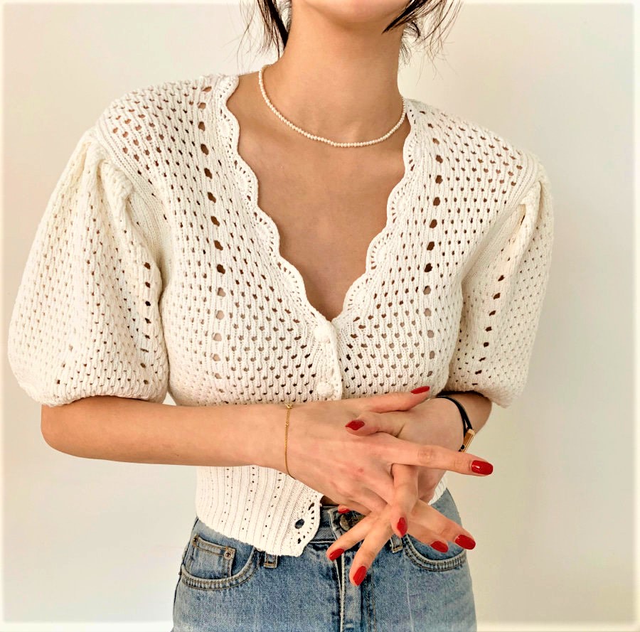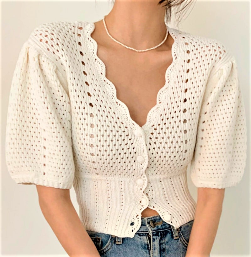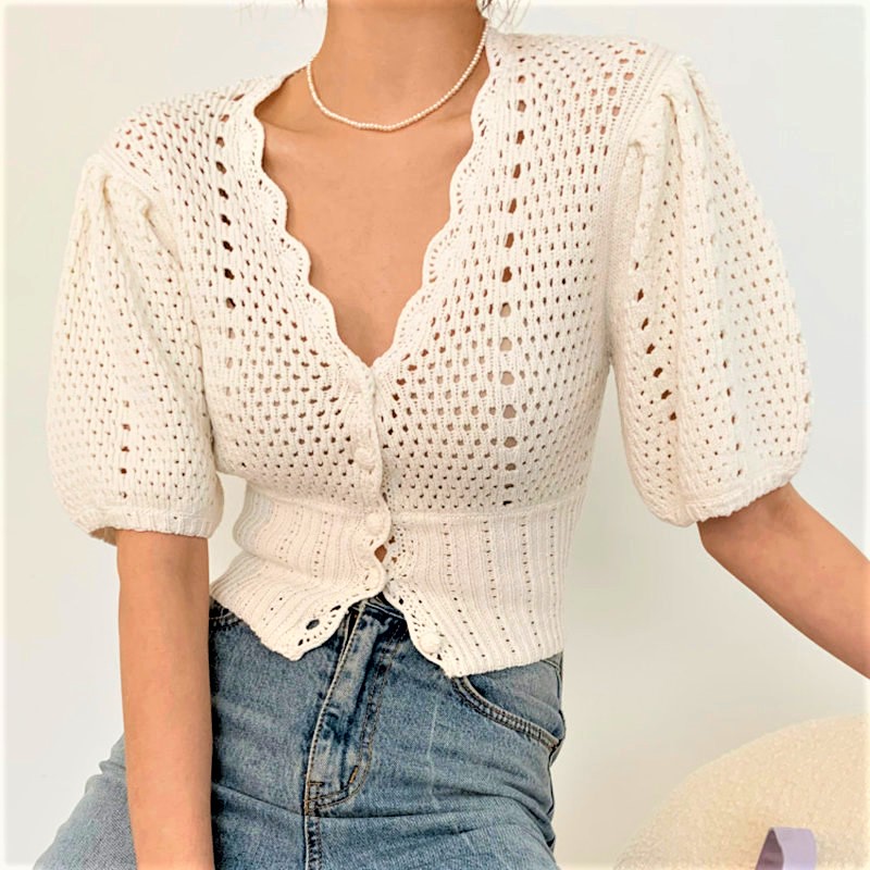 Sexy Streetwear Ruffle Deep V-Neck Puffy Half Sleeve Crocheted Crop Cardigan 90s Y2K Party Nightclub Dating Occasion Amazing