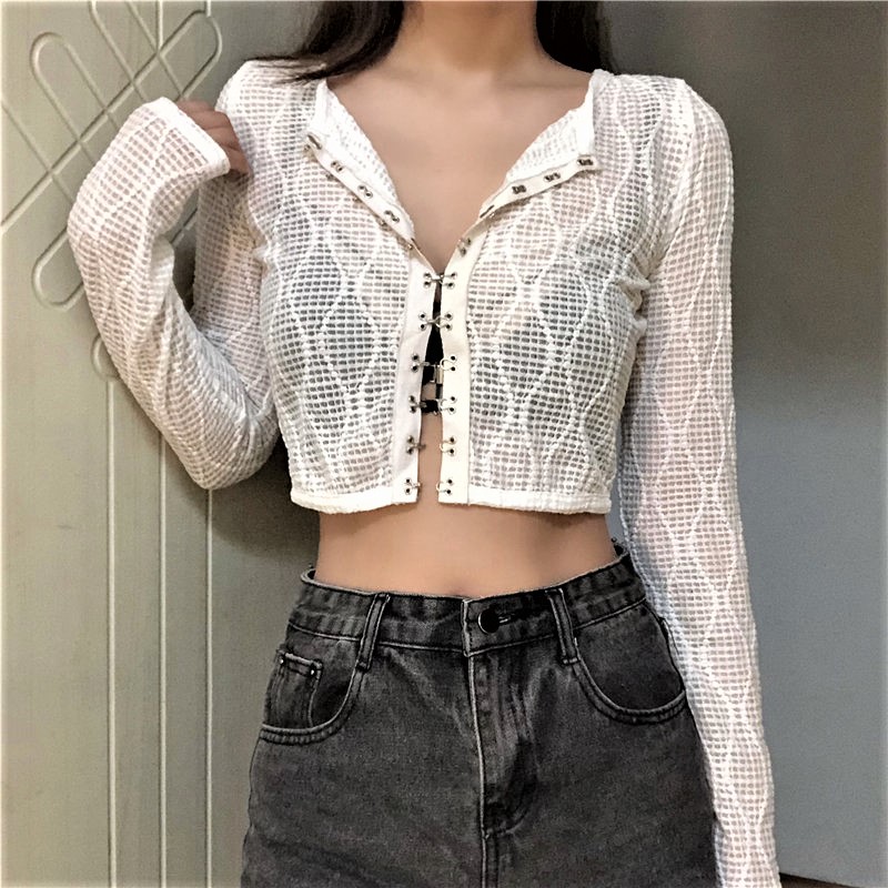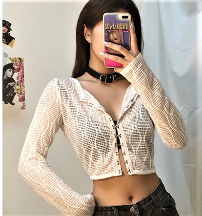 Punk Sexy Blouse Hollow Buckle Metal Eyelet Front Strap Waist Back Long Sleeve High Street Crop Tops Outerwear 90s Y2K Party Nightclub Event Amazing