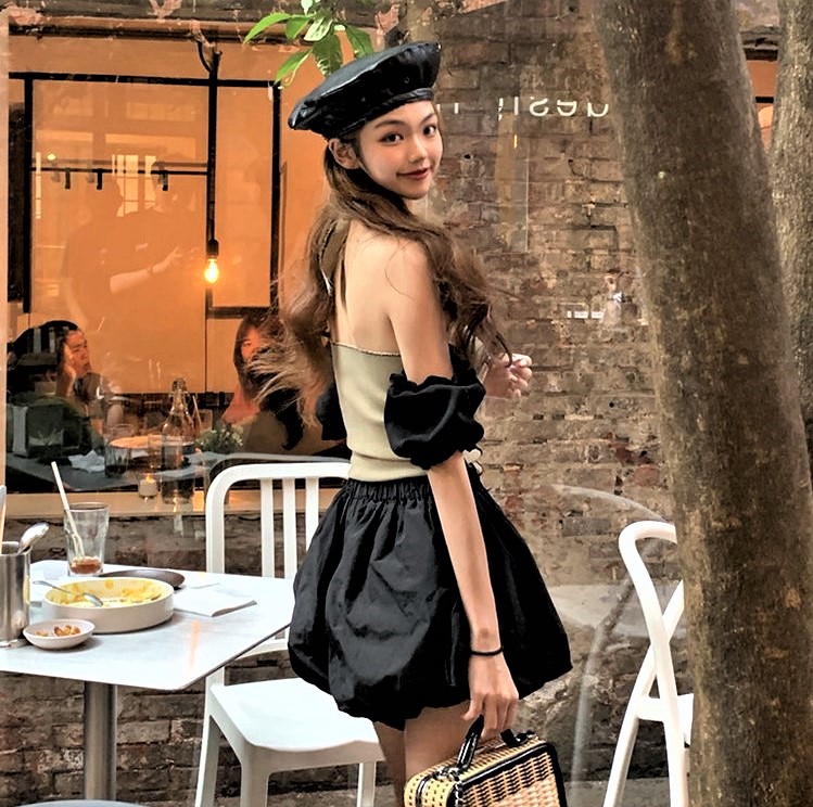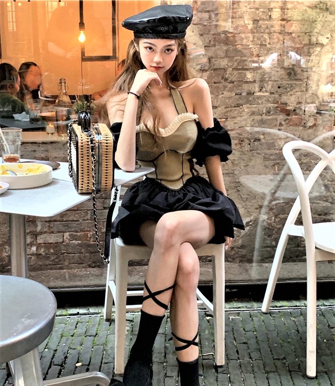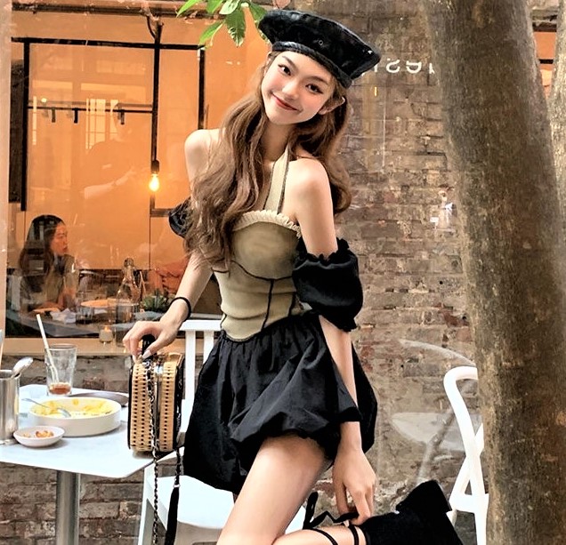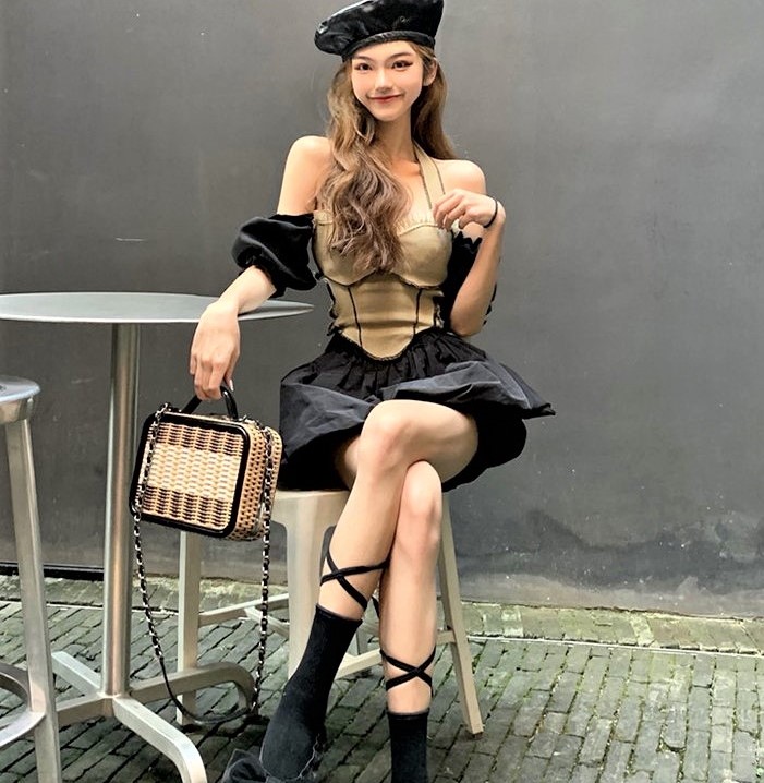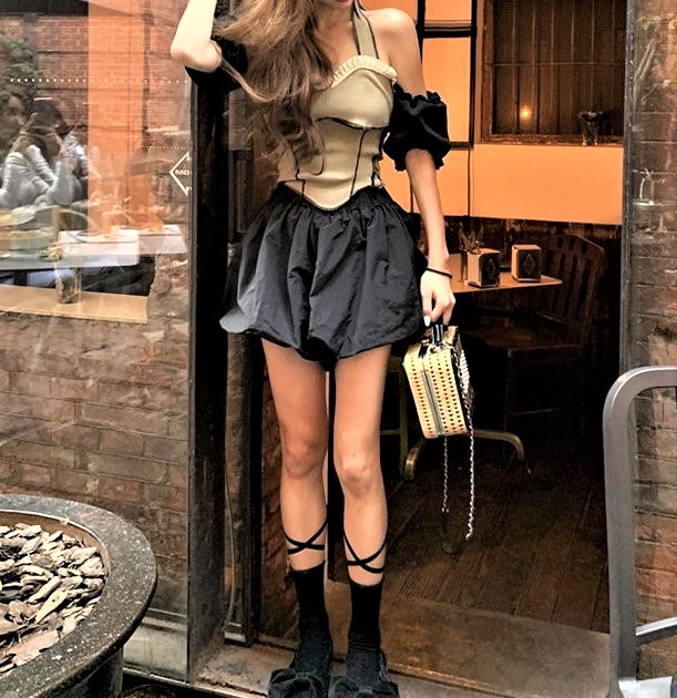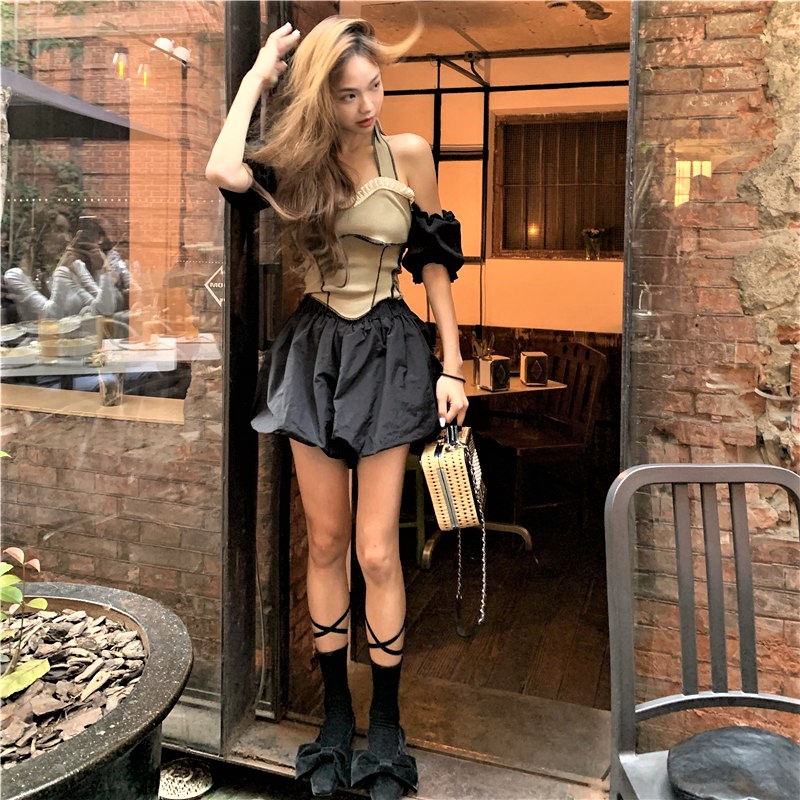 Vintage Punk Black Constrast Stitching Lettuce Detailing Rara Ruffle Wide Shoulder Belts Corset Cami Top With Ruched Baggy Loose Shorts Dress