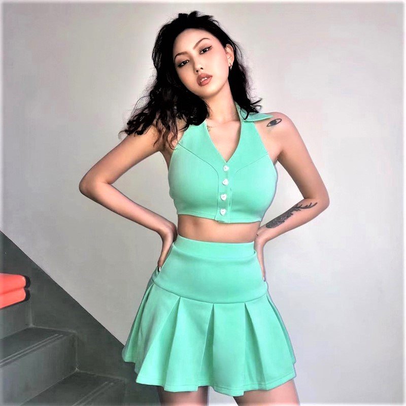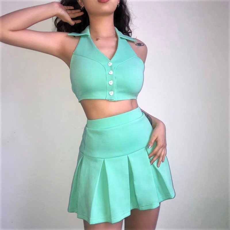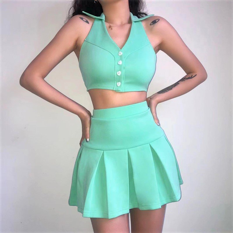 Perfect Vintage Halter Strapy Across Tie Up Back Push Up Crop Tops With Vogue Mini Pleated Dress 90s Y2K Cocktail Party Occasion Anniversary Event~Wow~Sooo Bling