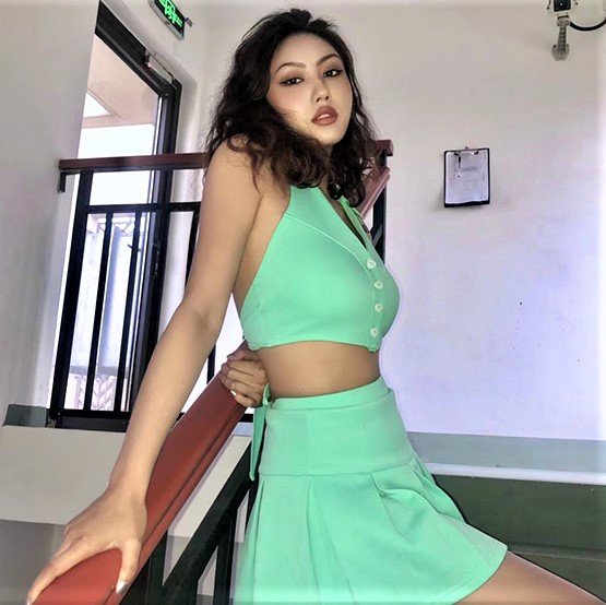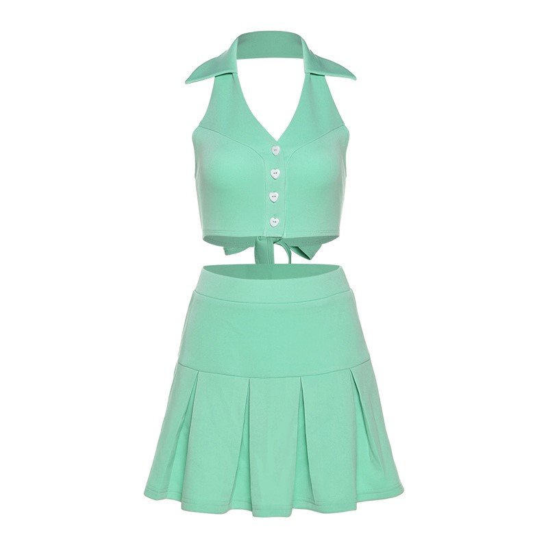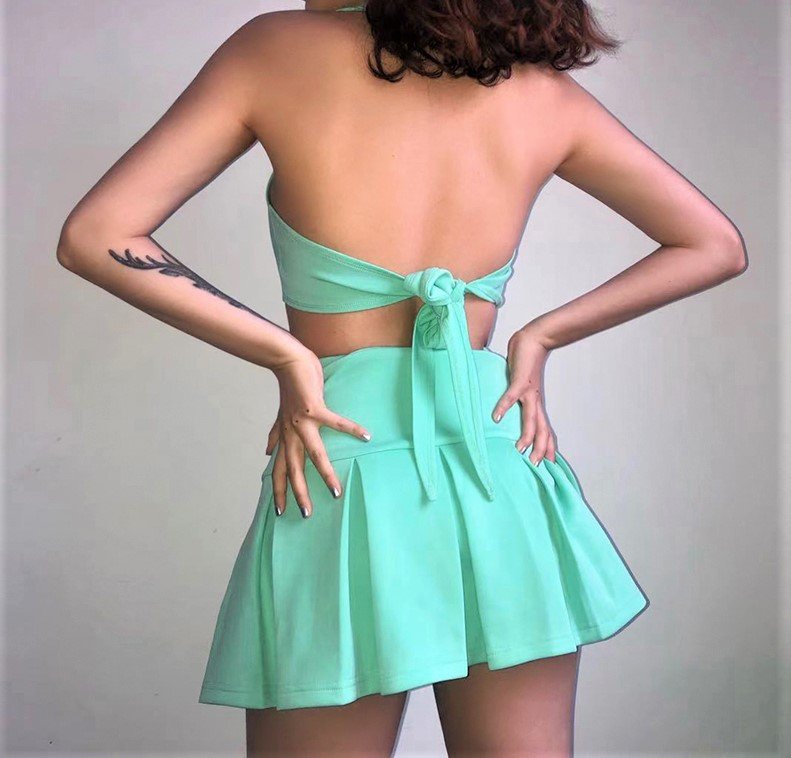 Perfect Vintage Halter Strapy Across Tie Up Back Push Up Crop Tops With Vogue Mini Pleated Dress