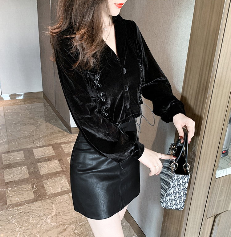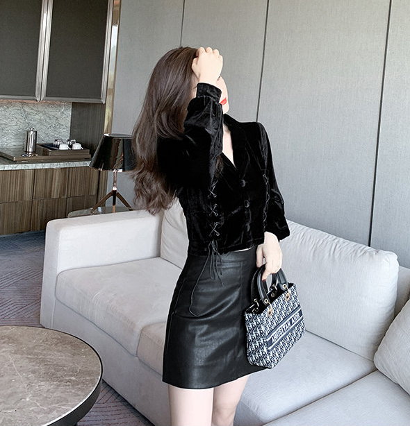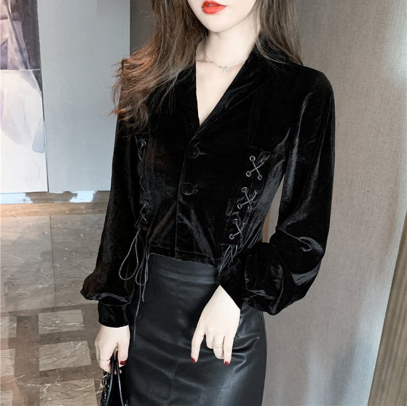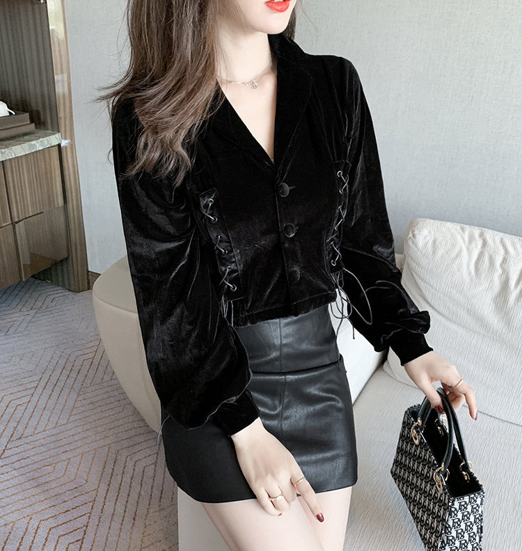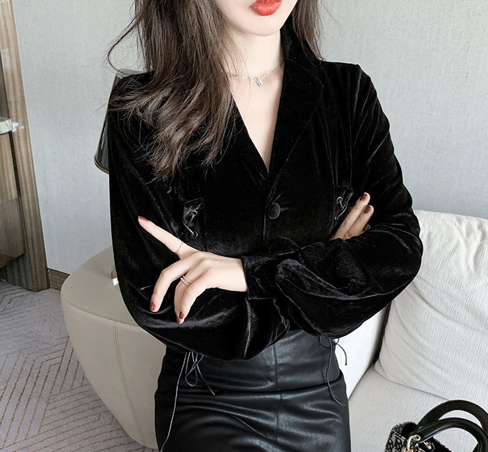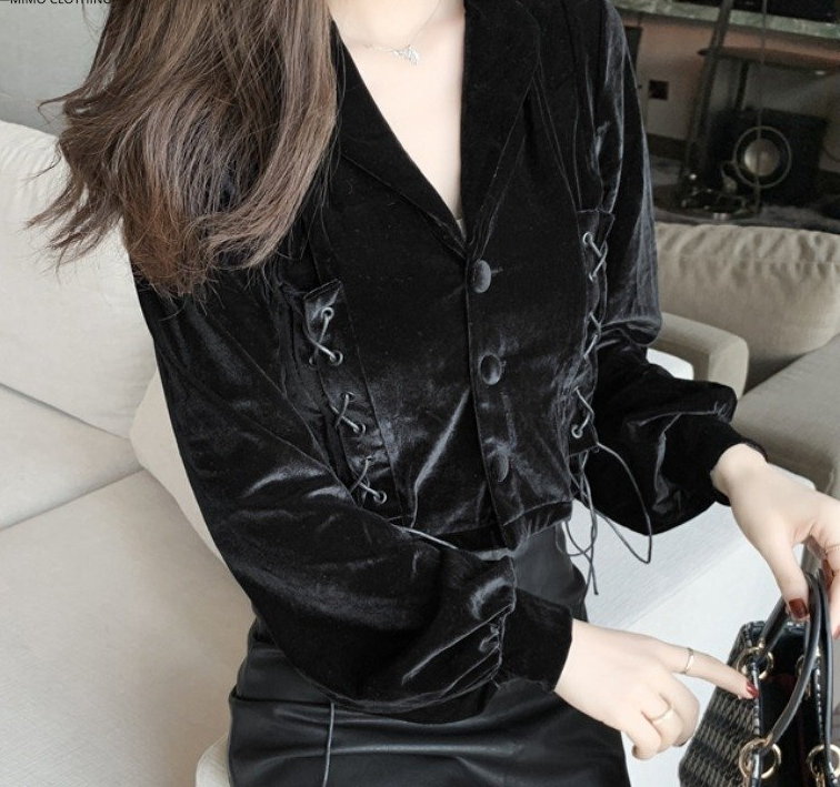 Gorgeous Classic Velvet Lapel Neck Drawstring Across Front Detail Puffy Lantern Sleeves Crop Jacket Blouse 90s Y2K 2000s Amazing