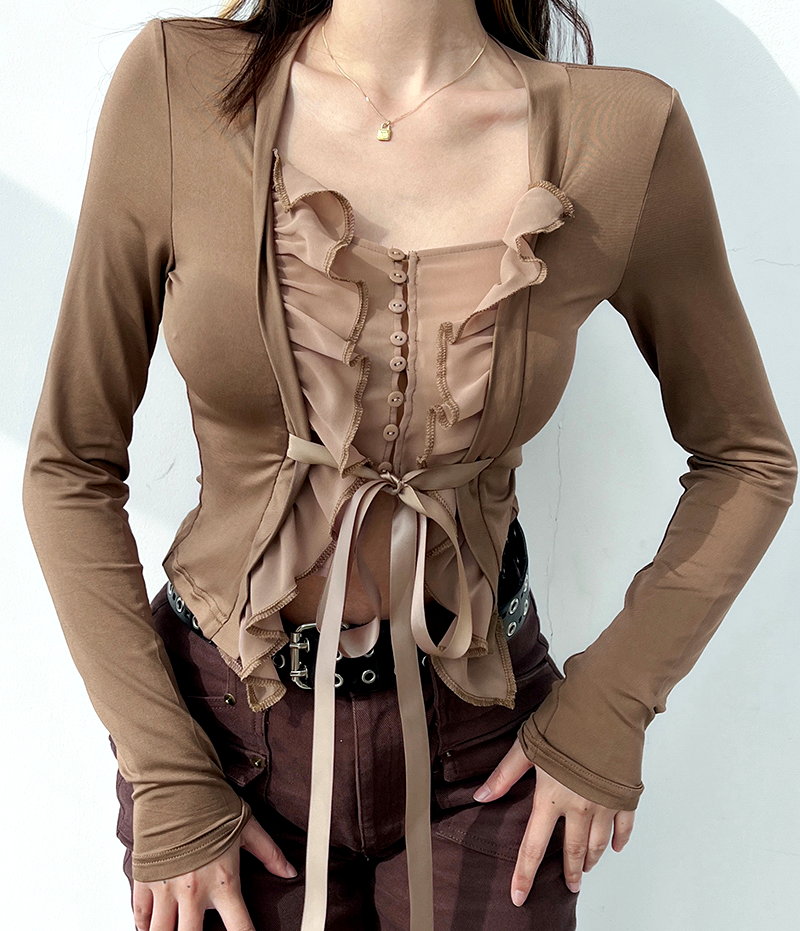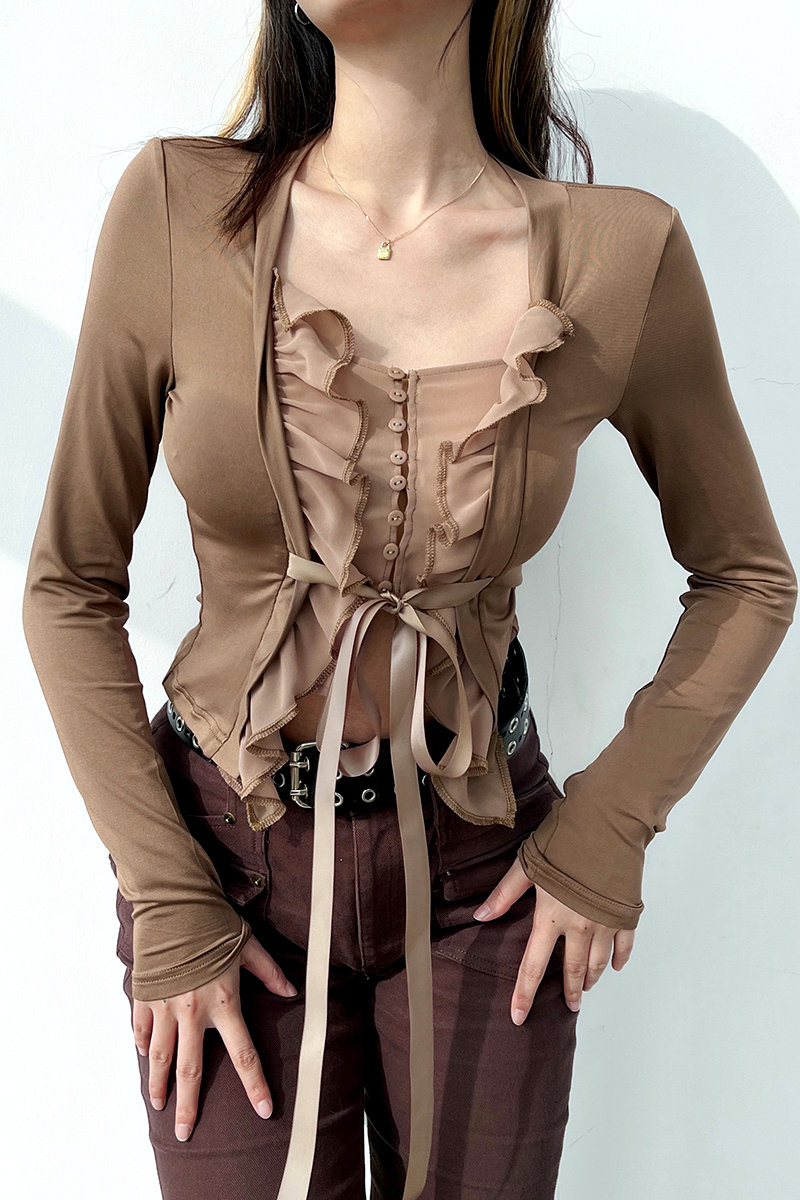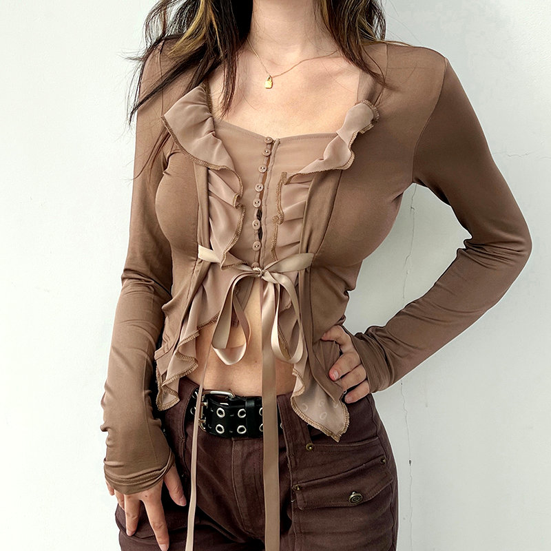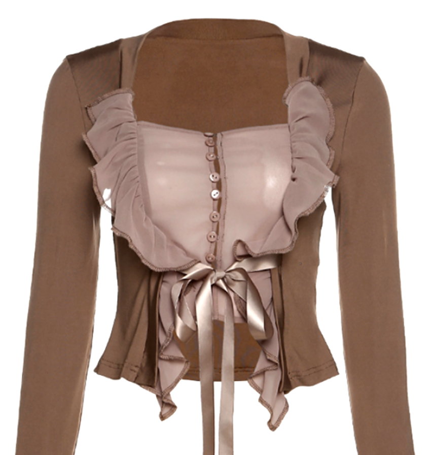 Vintage French Ruffle Lettuce Hem Strap Tie Bow Square Flattering Ruched Blouse 90s Y2K Party Barclub Dance Streetwear Amazing