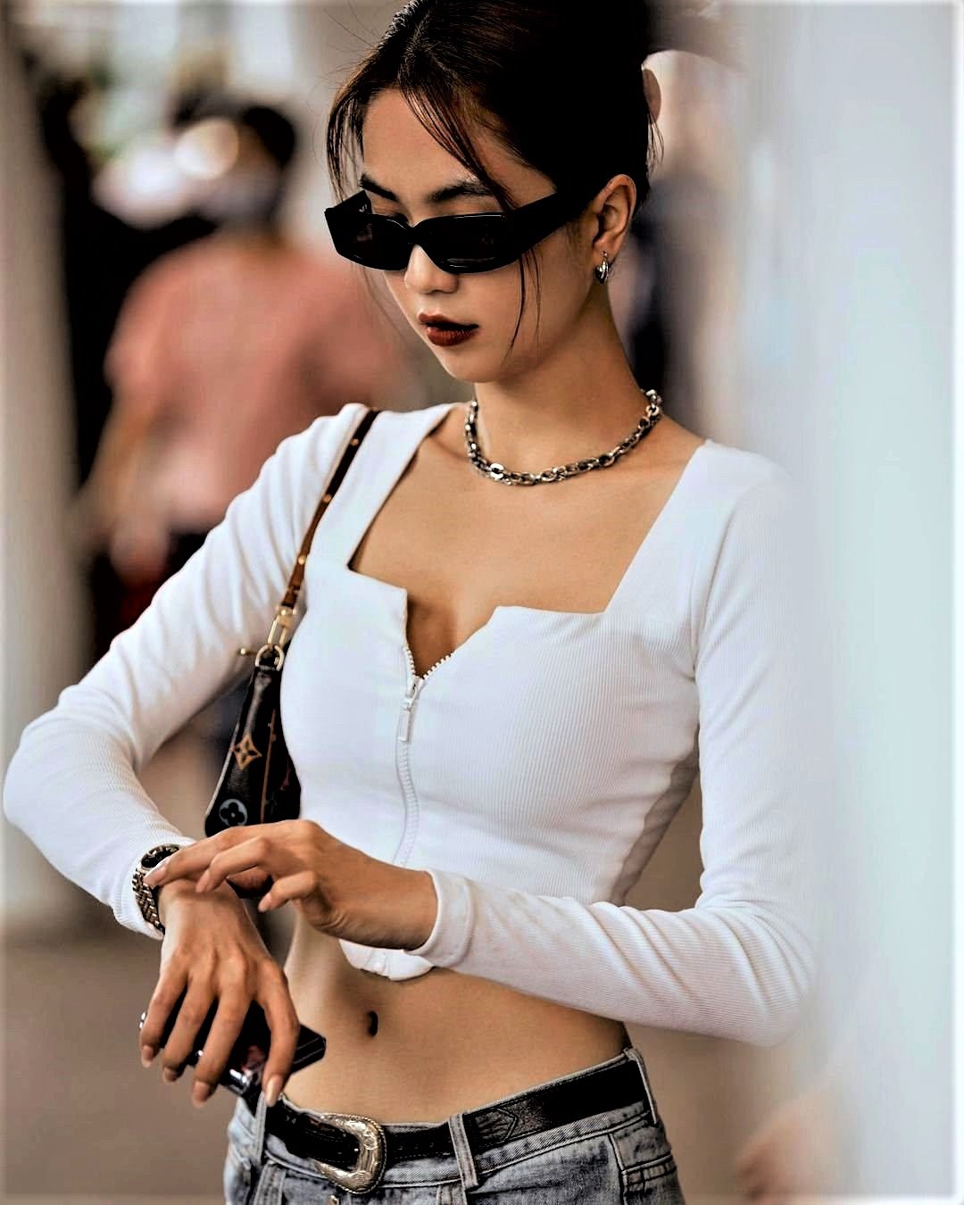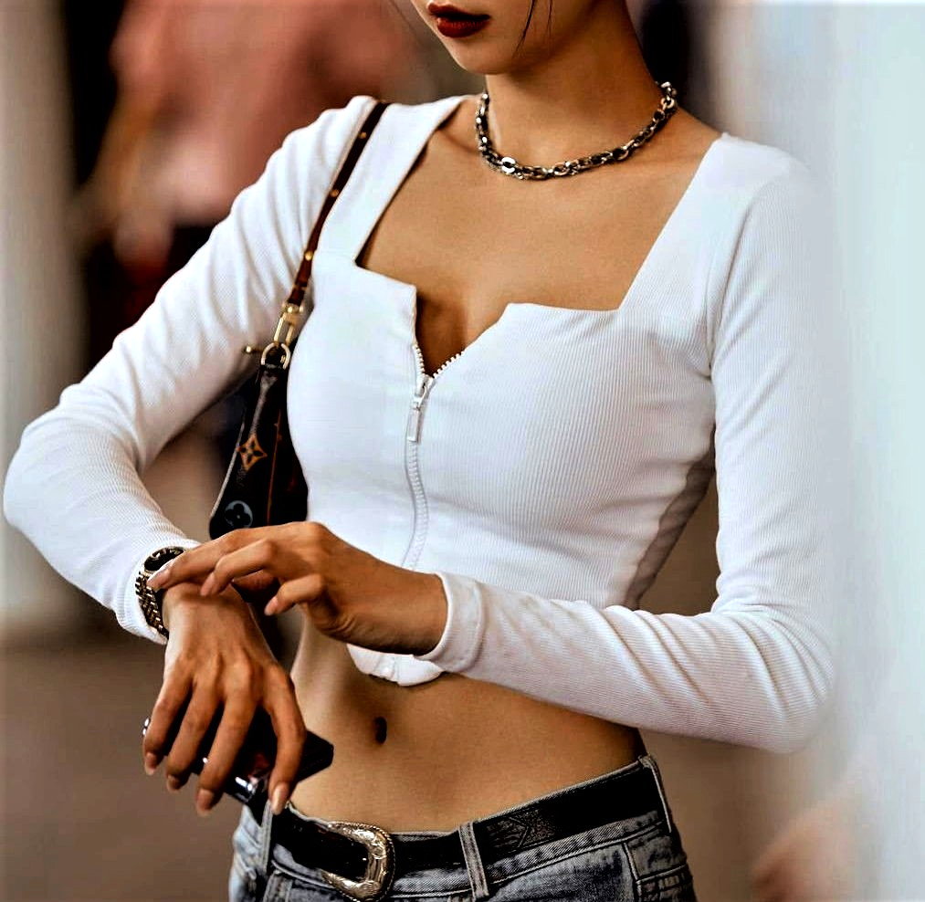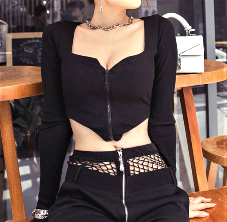 Vintage Asymmetric Square Neckline Zipper Closure Crop Top Streetwear.