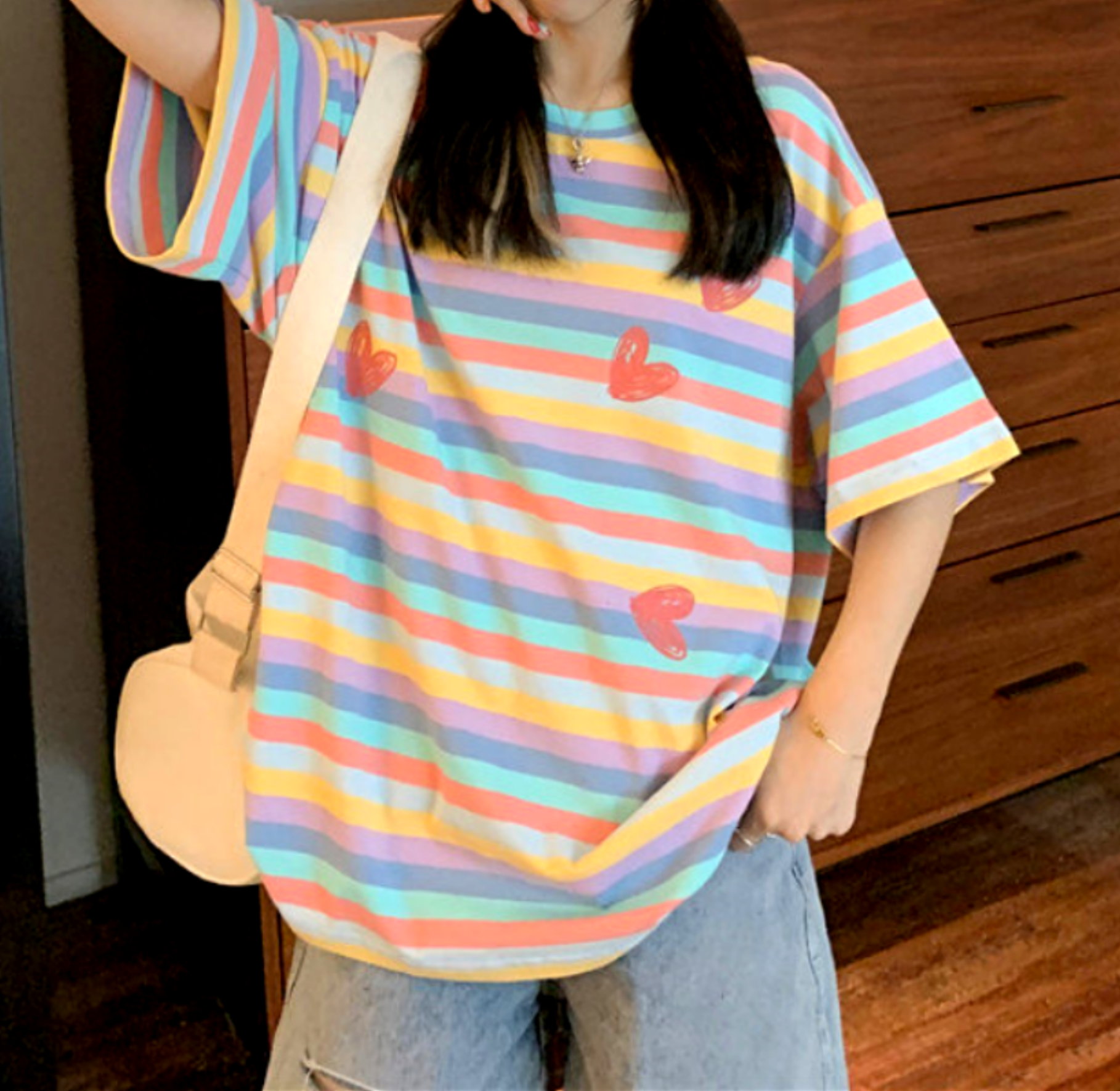 Stunning Vintage Rainbow Stripes Abstract Hearts Graphic Print Loose Fit Harajuku Hippie Tee Tops Y2K Streetwear Party Dance Hot Style Amazing
