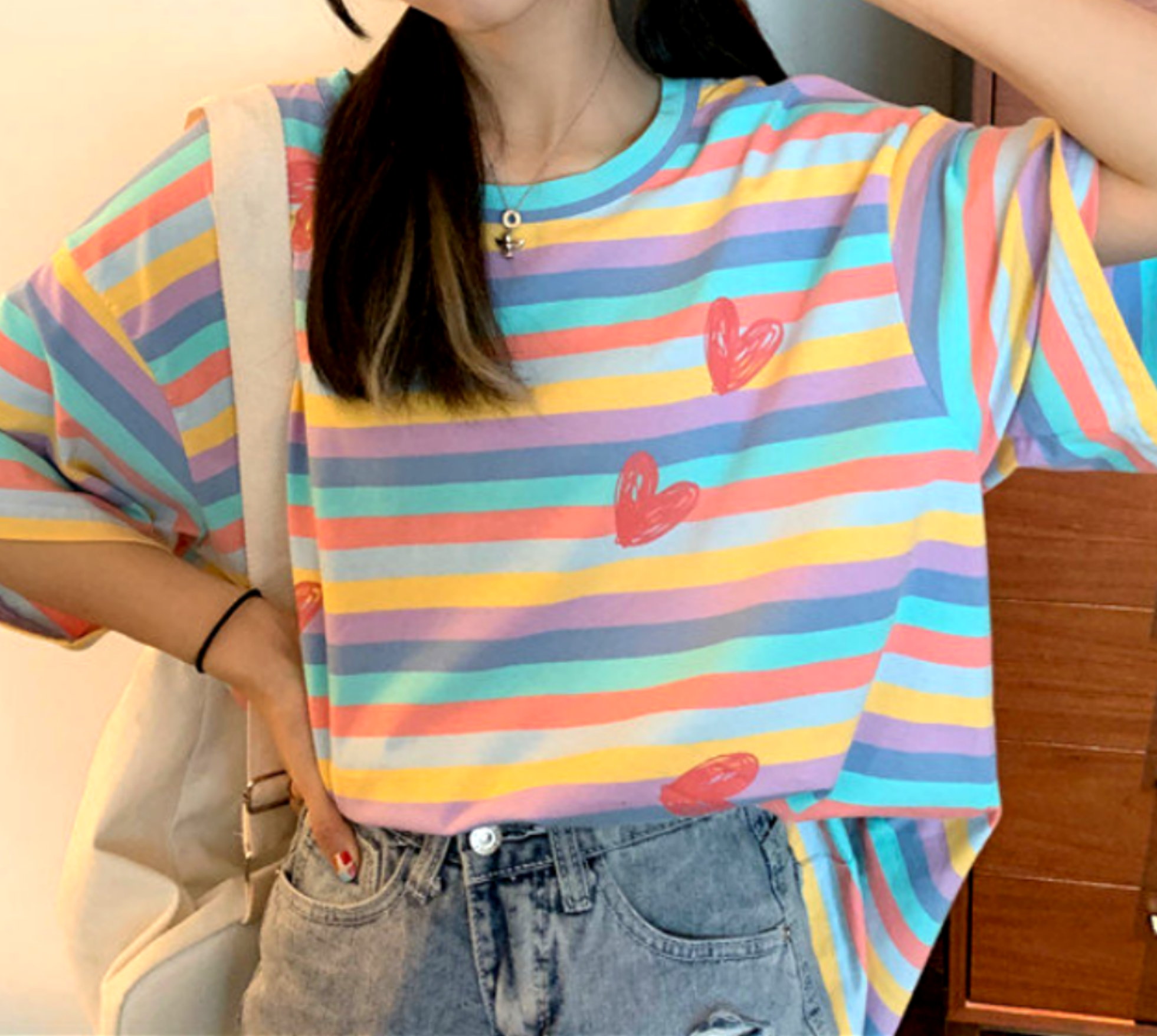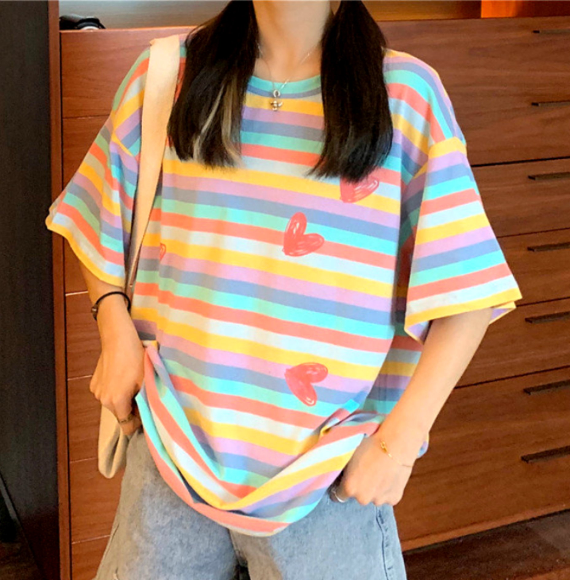 Stunning Vintage Rainbow Stripes Abstract Hearts Graphic Print Loose Fit Harajuku Hippie Tee Tops