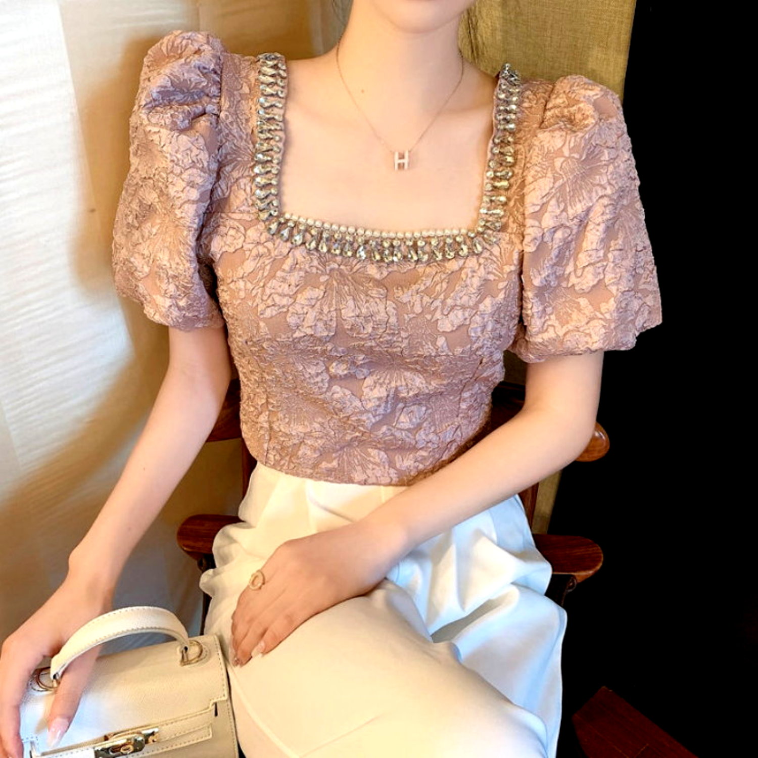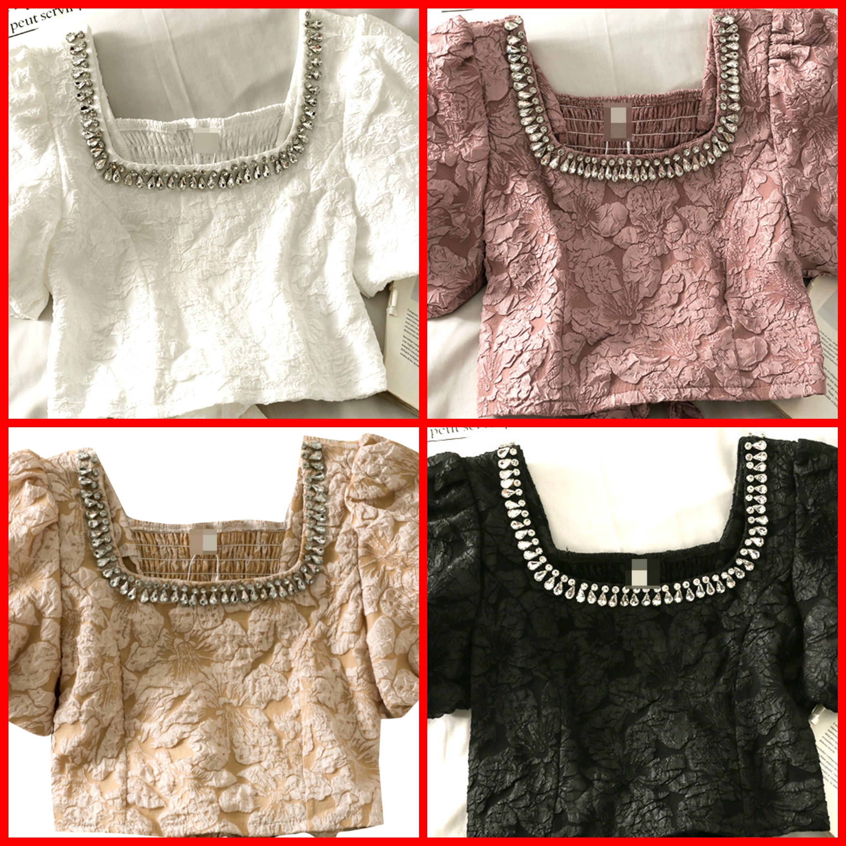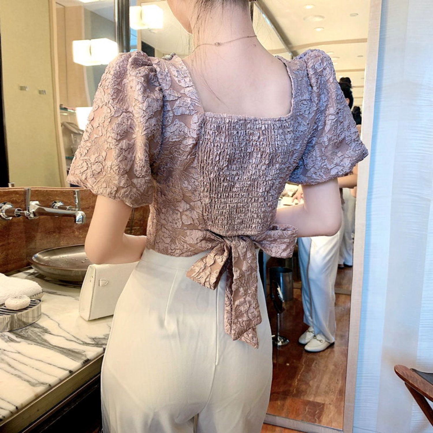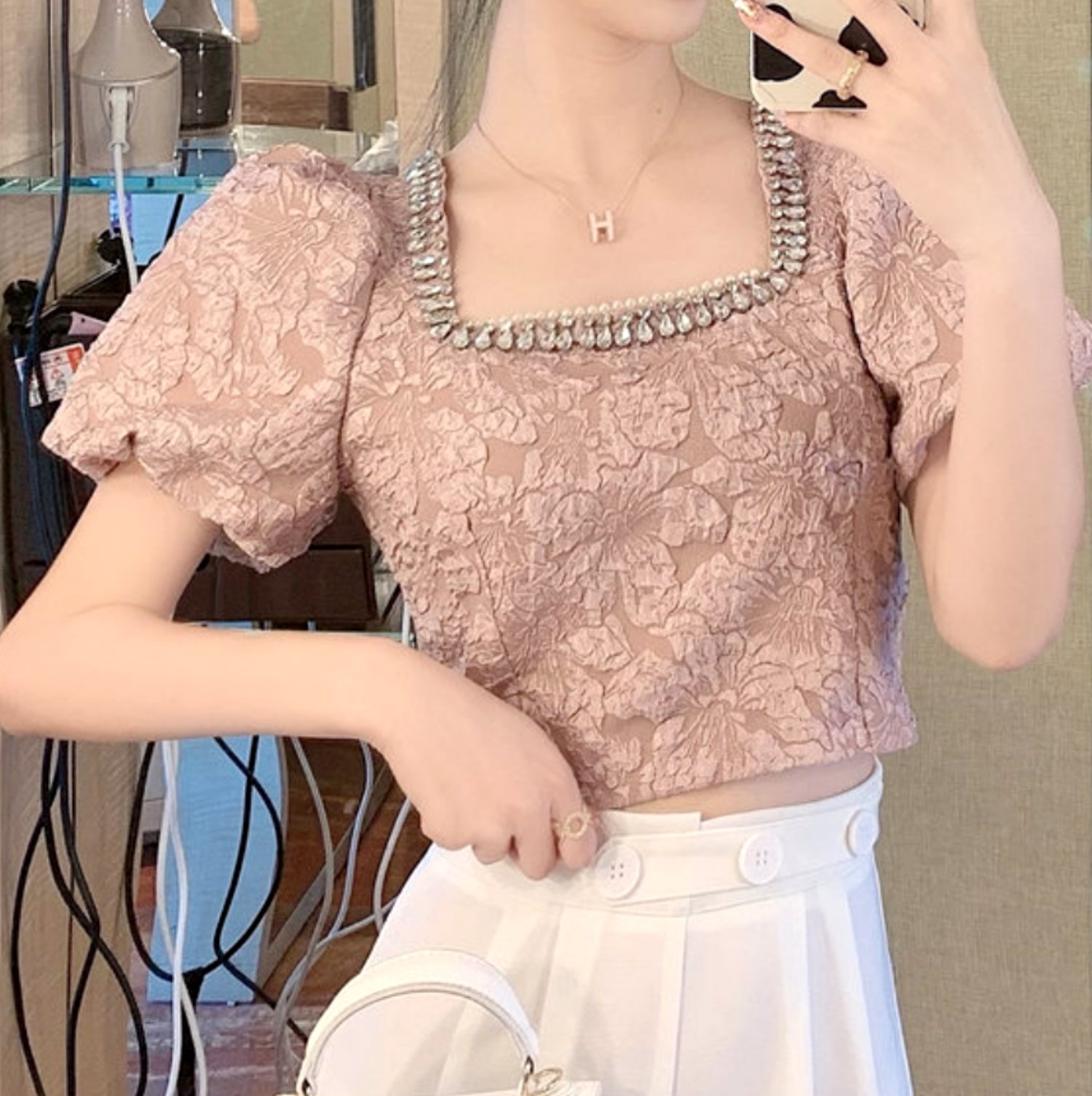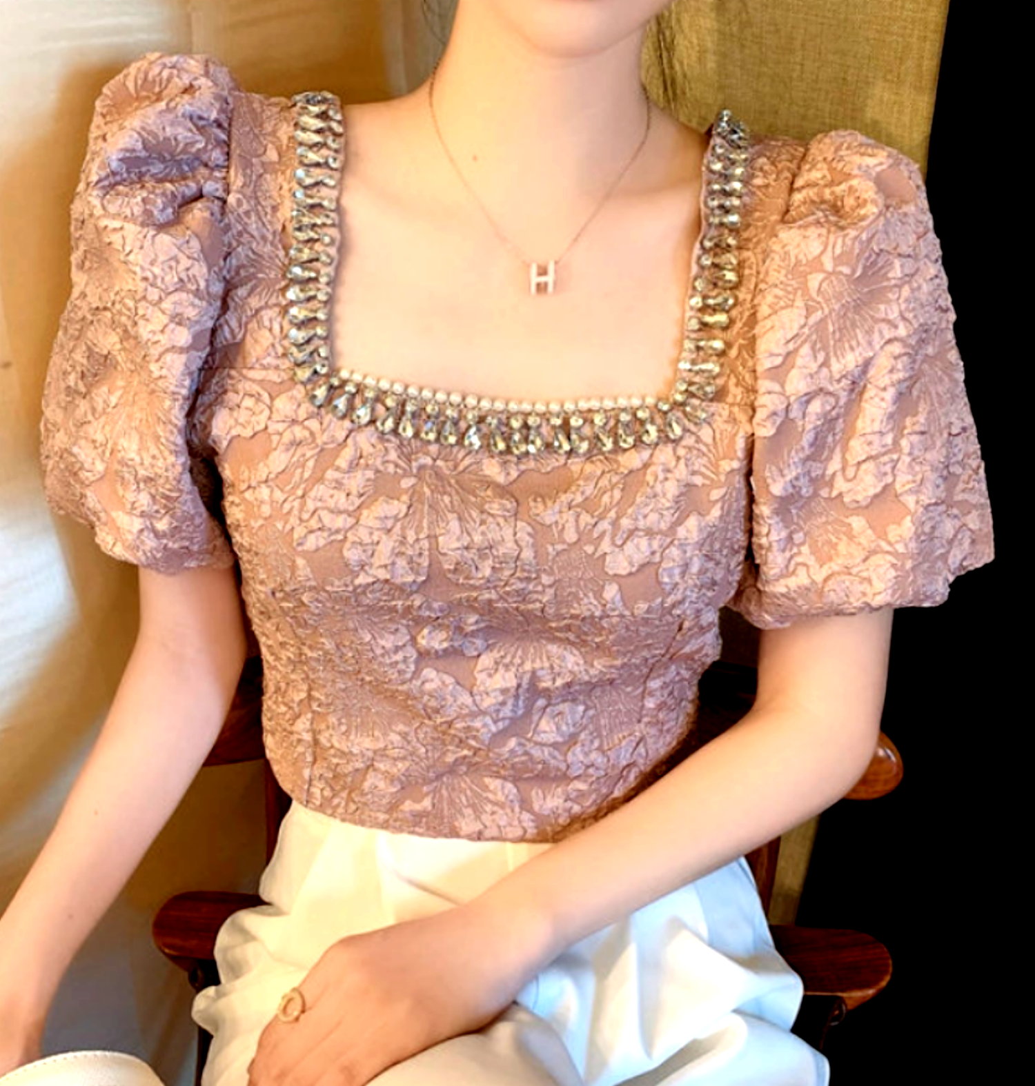 Unique Pearls Crystals Studs Embellished Square Neckline Embossed Embroidery Pattern Ruffle Bow Strap Back Puffy Sleeves Gorgeous Tops