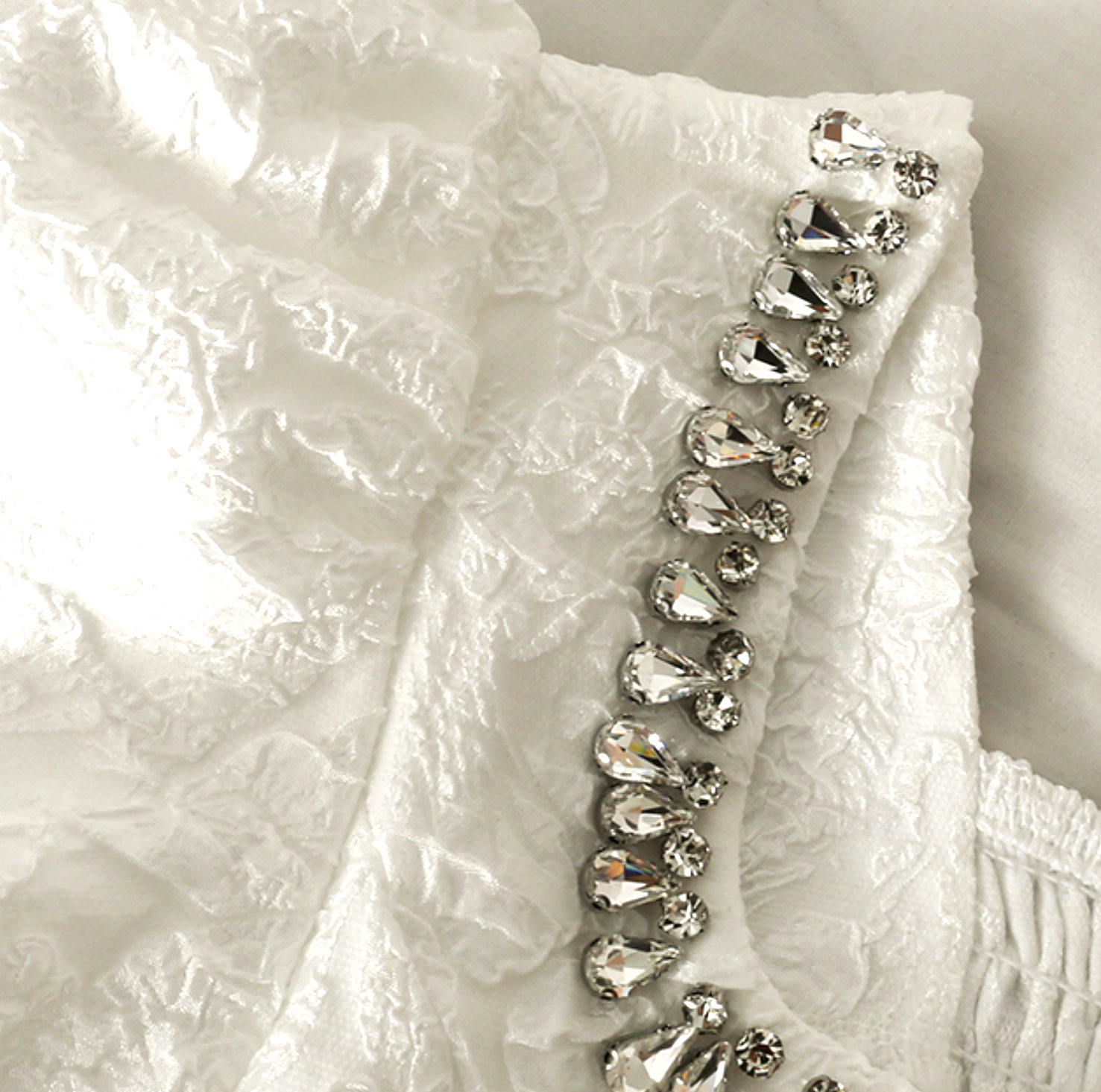 Unique Pearls Crystals Studs Embellished Square Neckline Embossed Embroidery Pattern Ruffle Bow Strap Back Puffy Sleeves Gorgeous Tops Y2K 90s Highstreet Party Dance Amazing