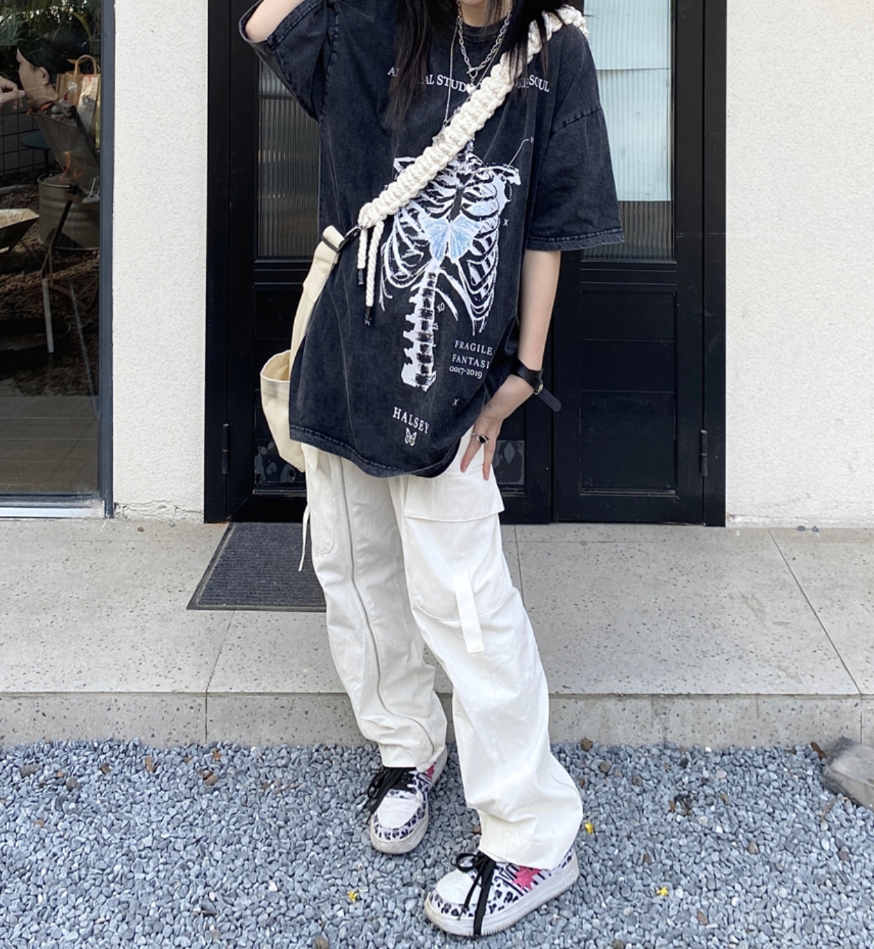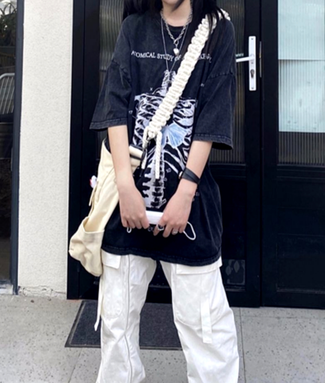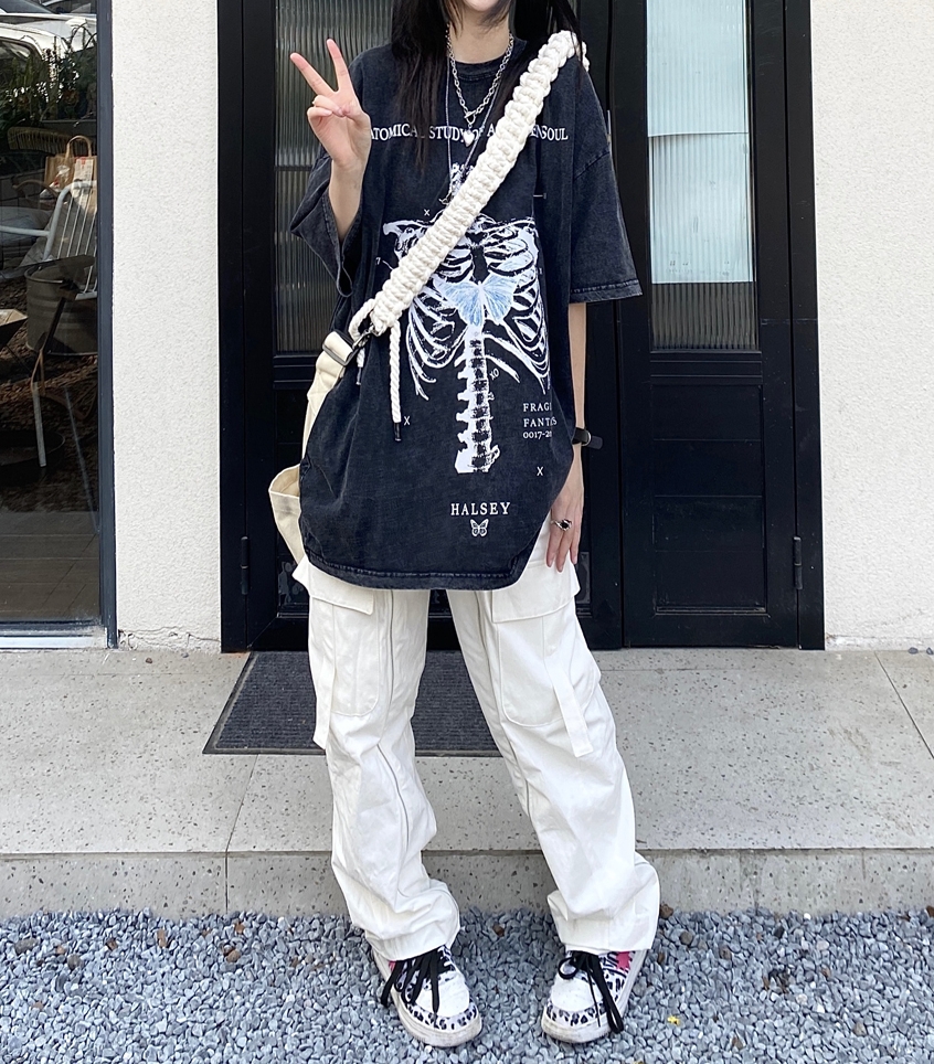 Stunning Punk Gothic Skeleton Print Oversize Washed Tee Tops Streetwear Unique Rave