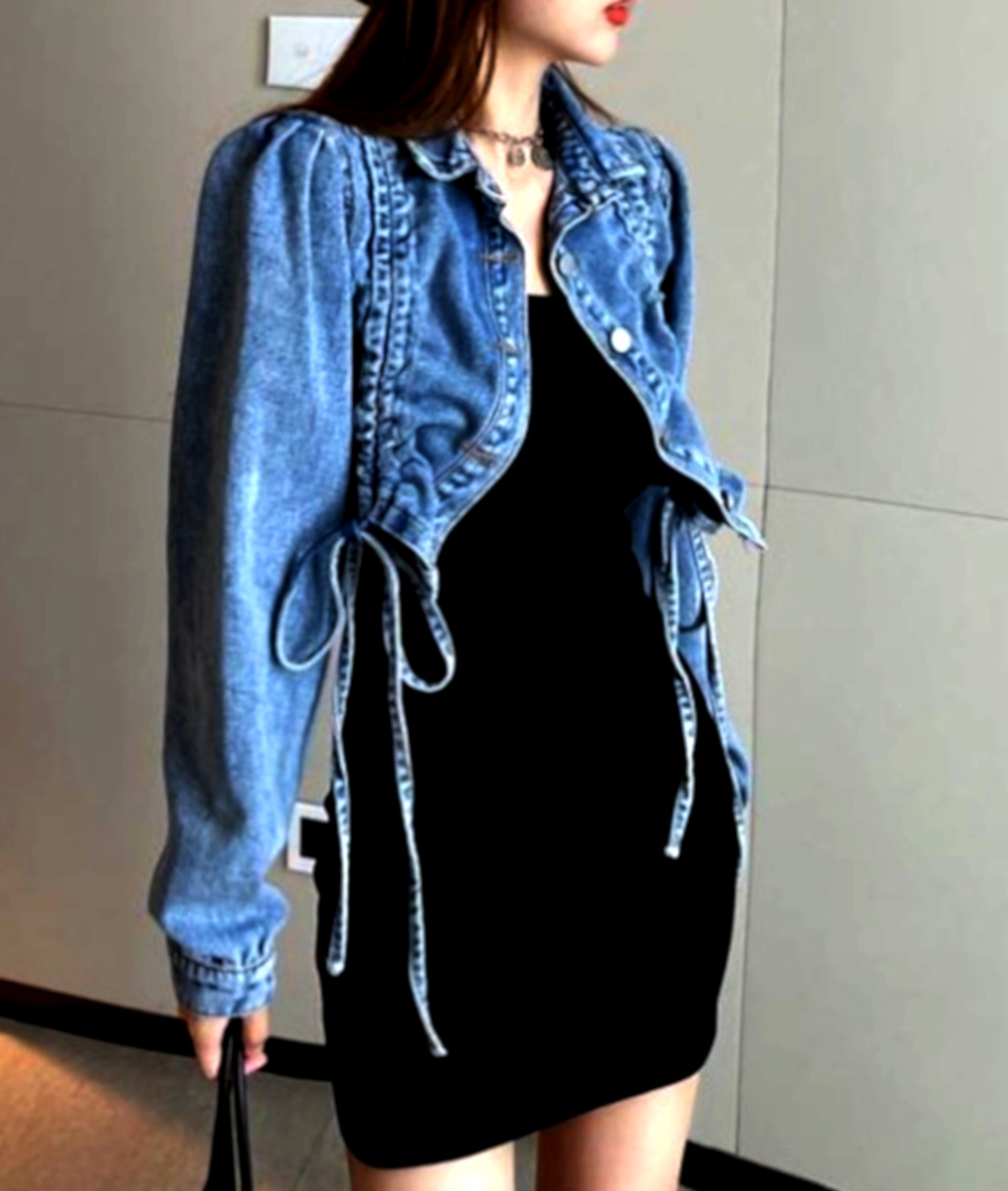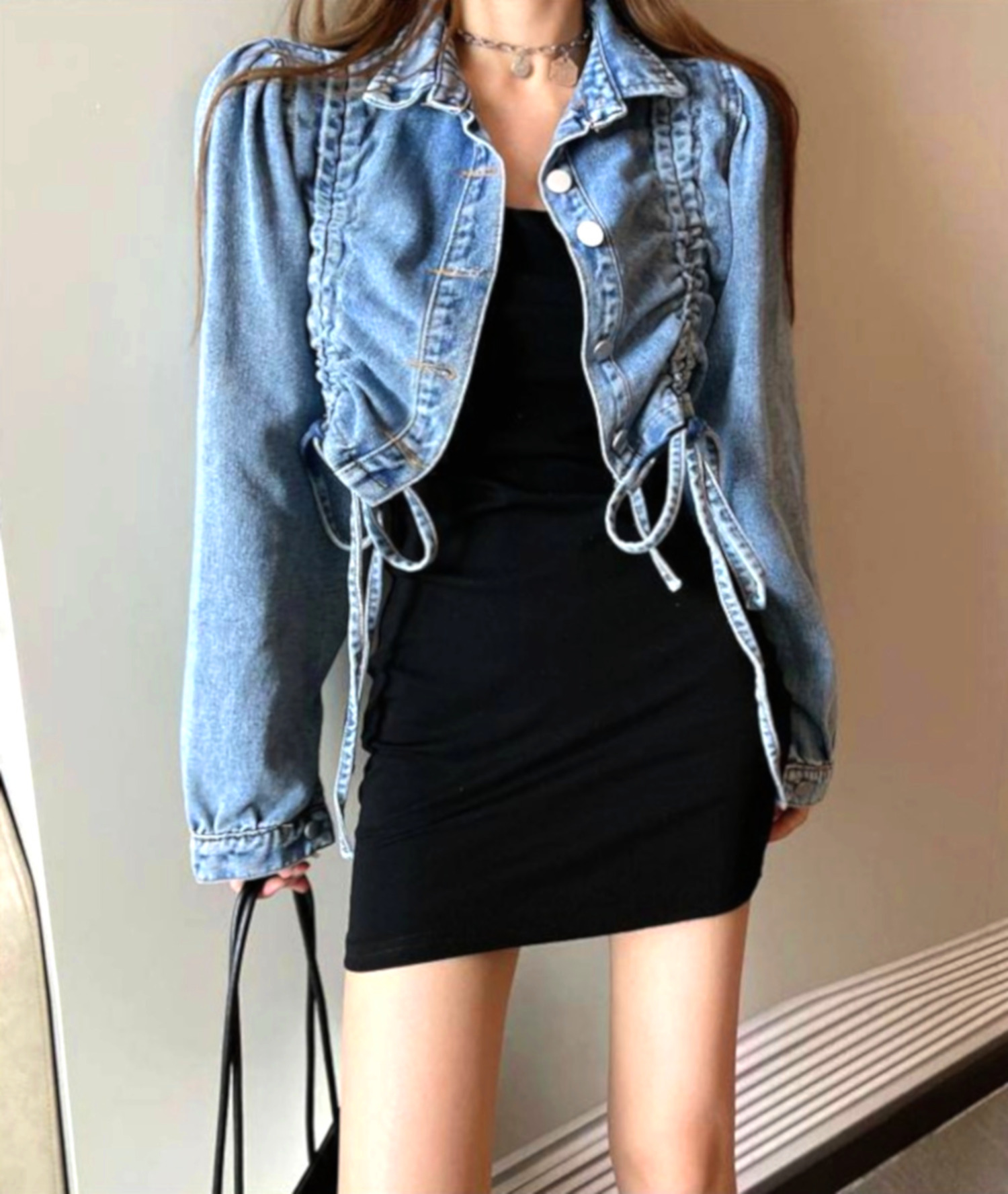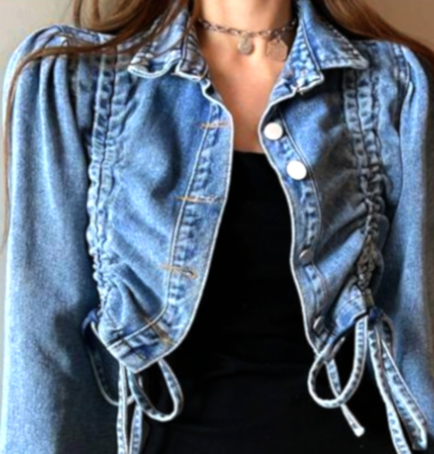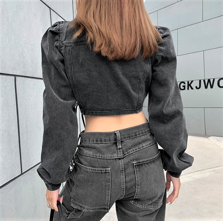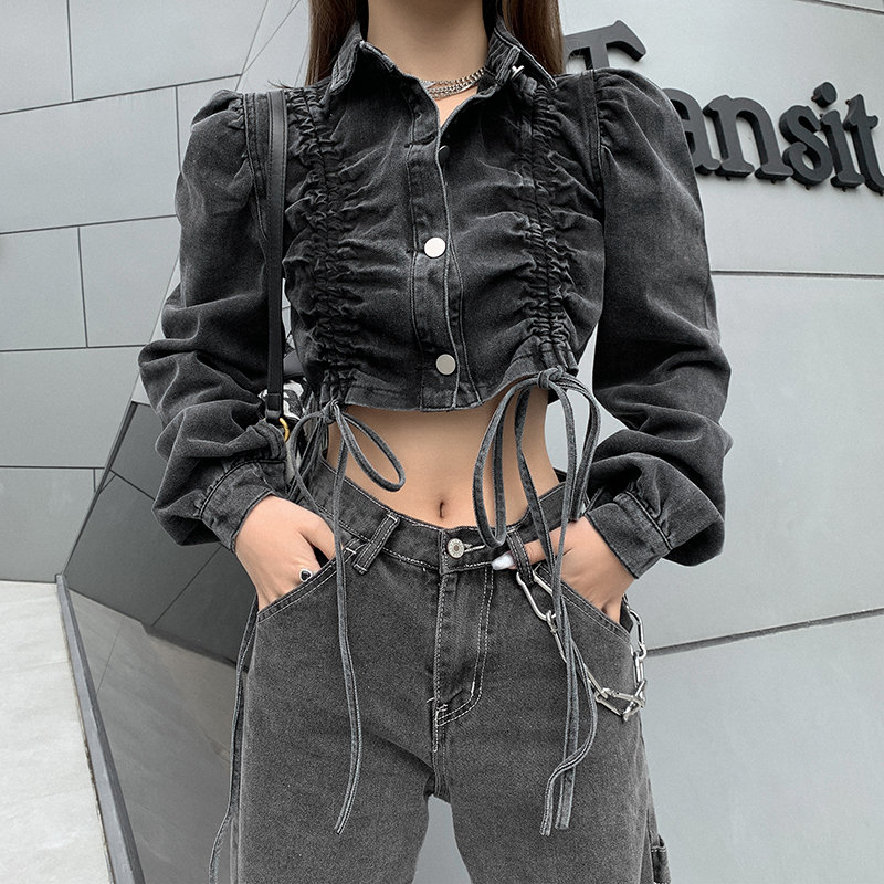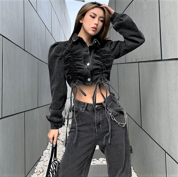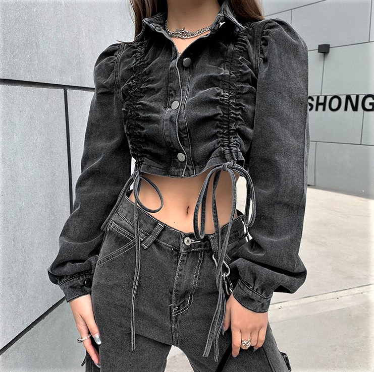 Stunning Punk Ruffle Puffy Shoulder Drawstring Ruched Jean Washed Jacket Unique Rave