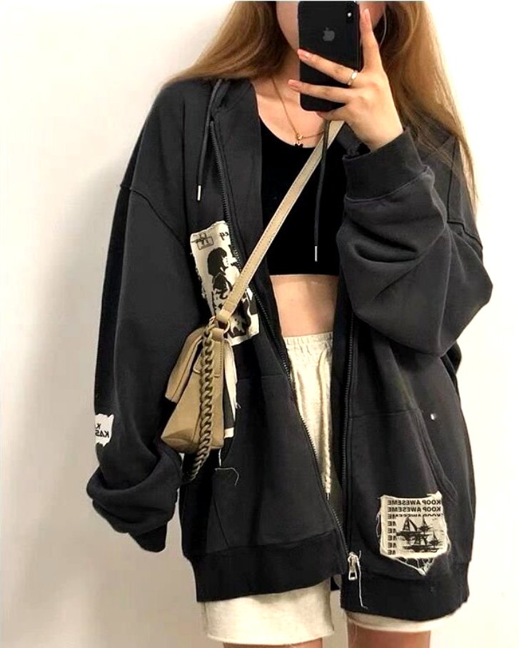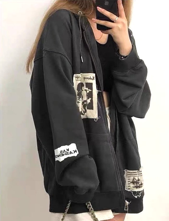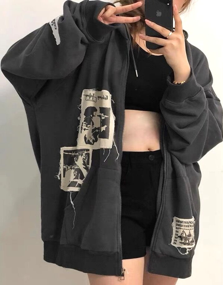 Unique Punk Appliques Print Patchwork Zipper Drawstring Hoodie Oversize Jacket Streetwear