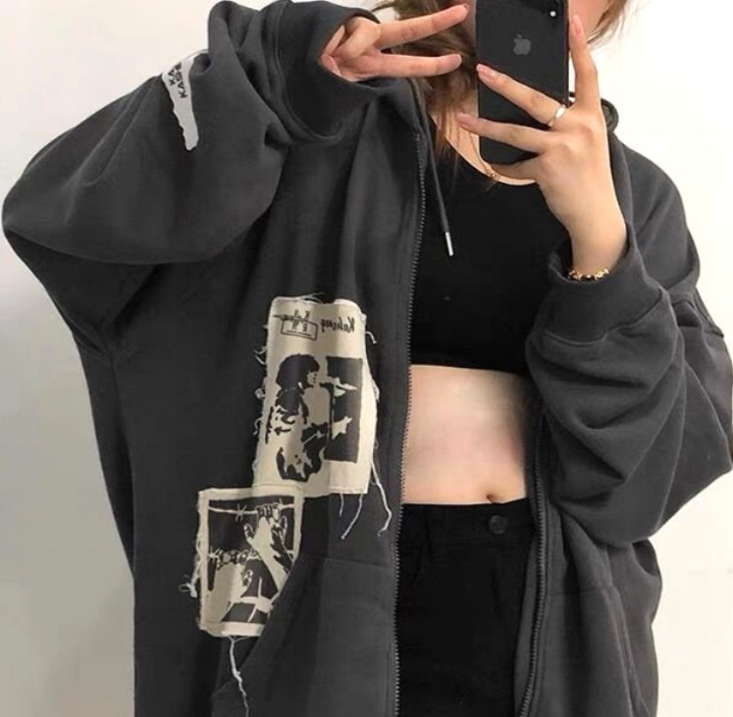 Unique Punk Distressed Appliques Print Patchwork Zipper Drawstring Hoodie Oversize Jacket Streetwear Y2K 90s Amazing.