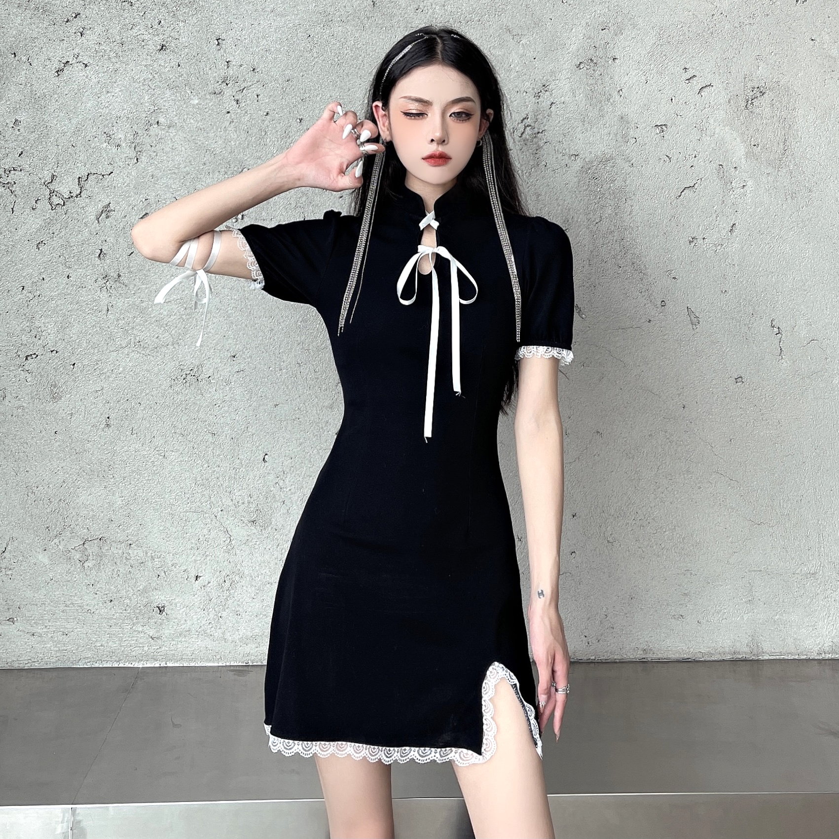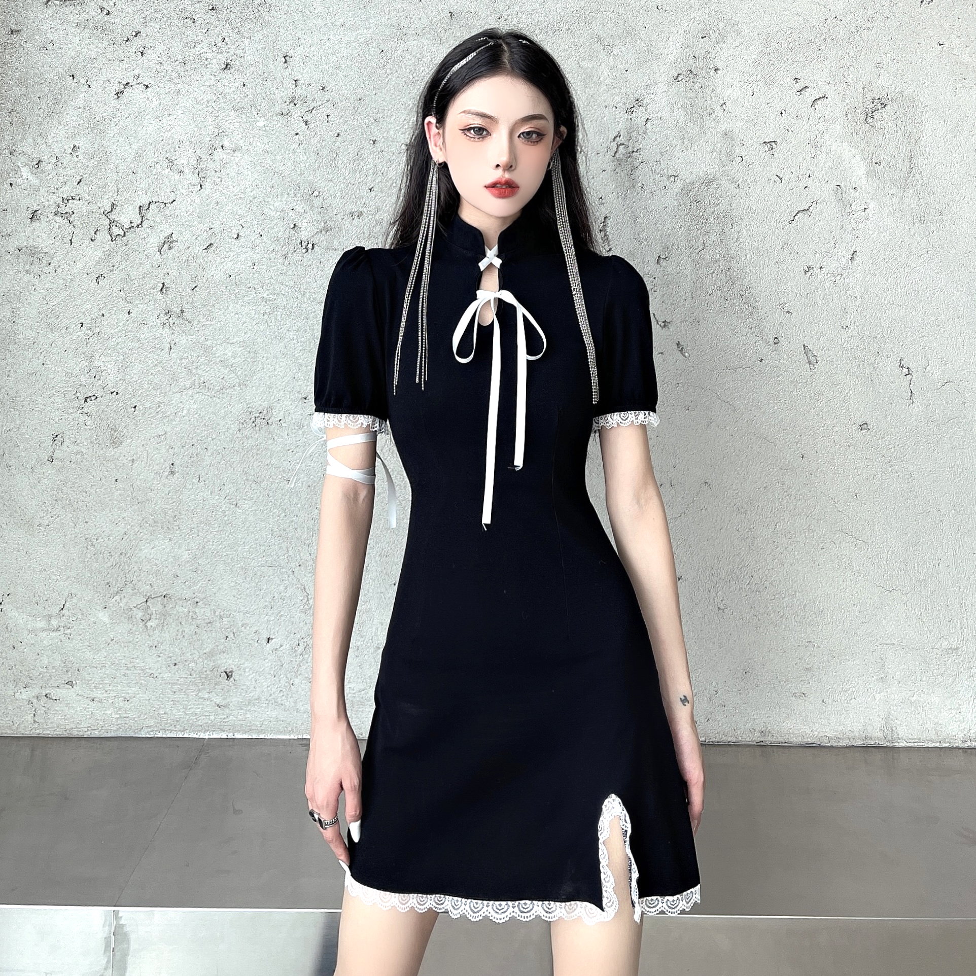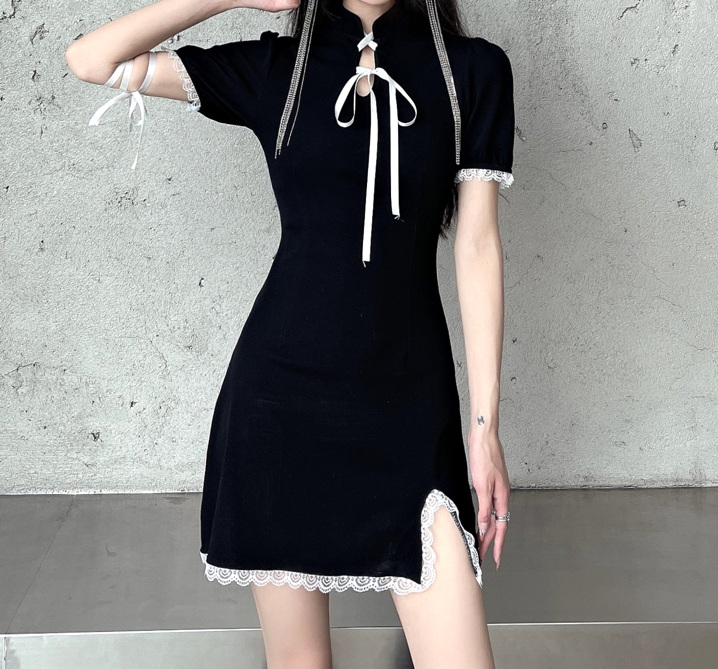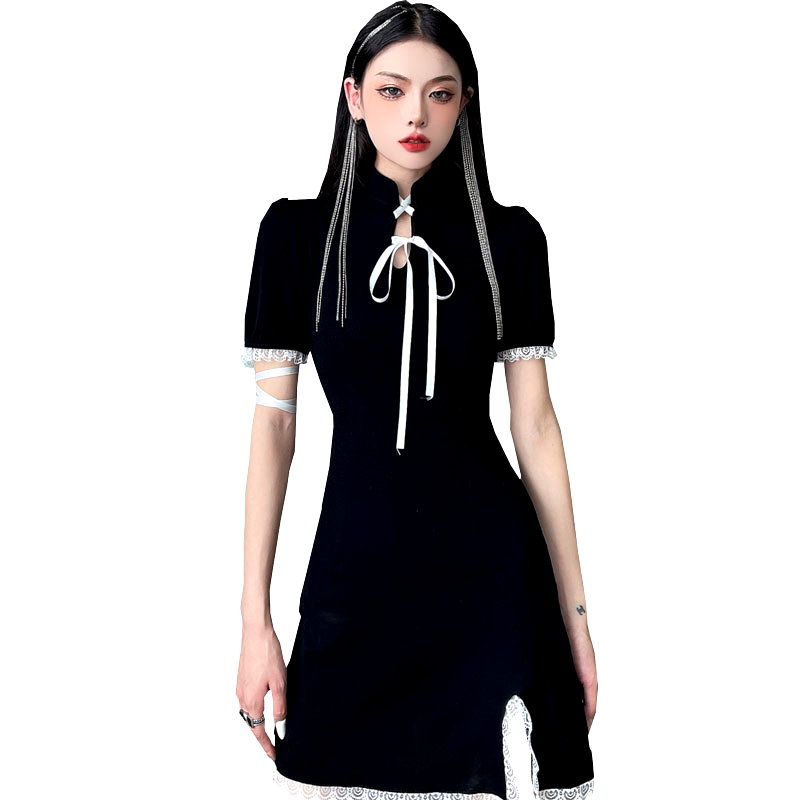 Punk Gothic Lace Strap Bow Knot Bodycon Mini Split Dress 90s Y2K Streetwear Party Amazing