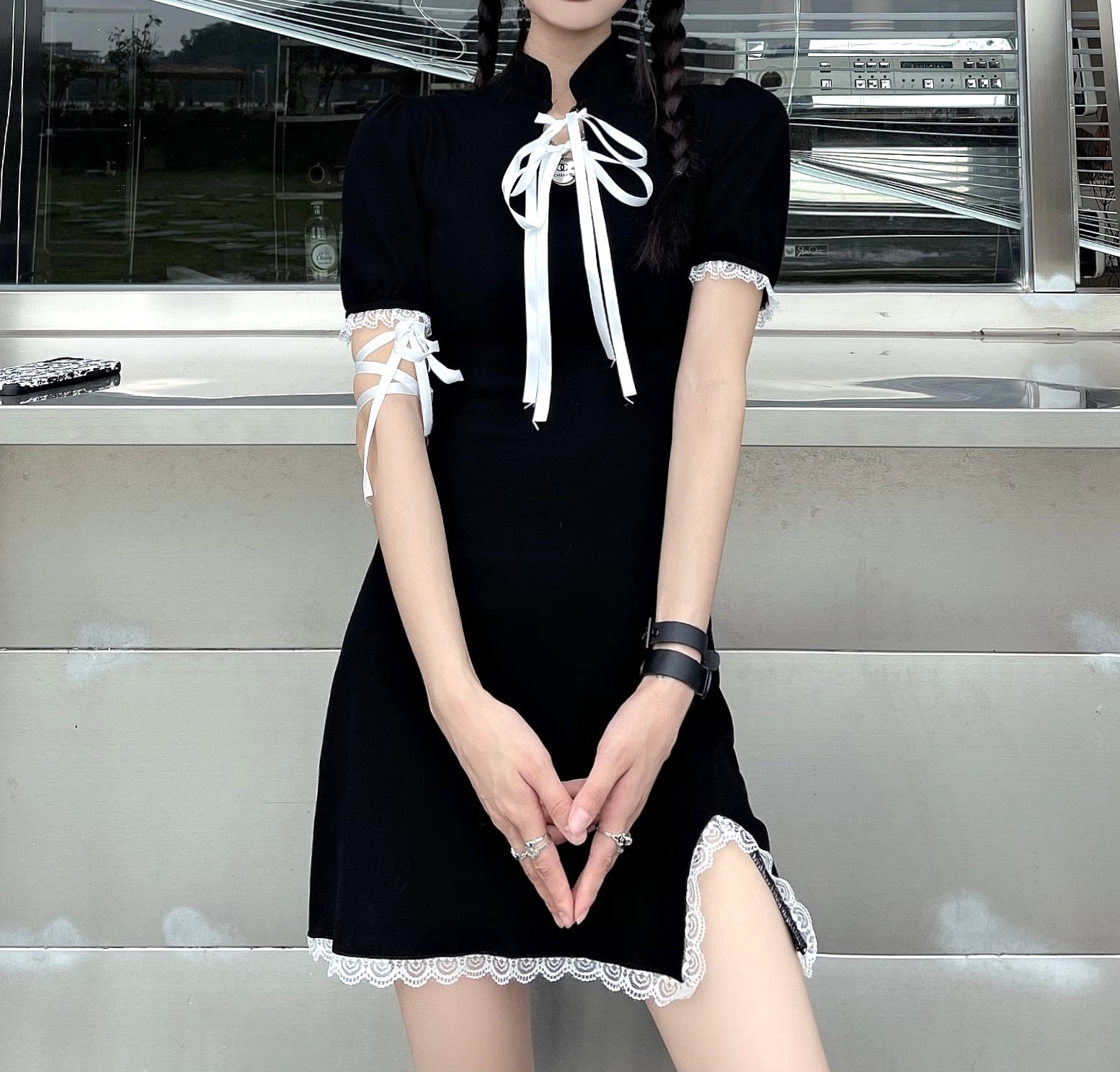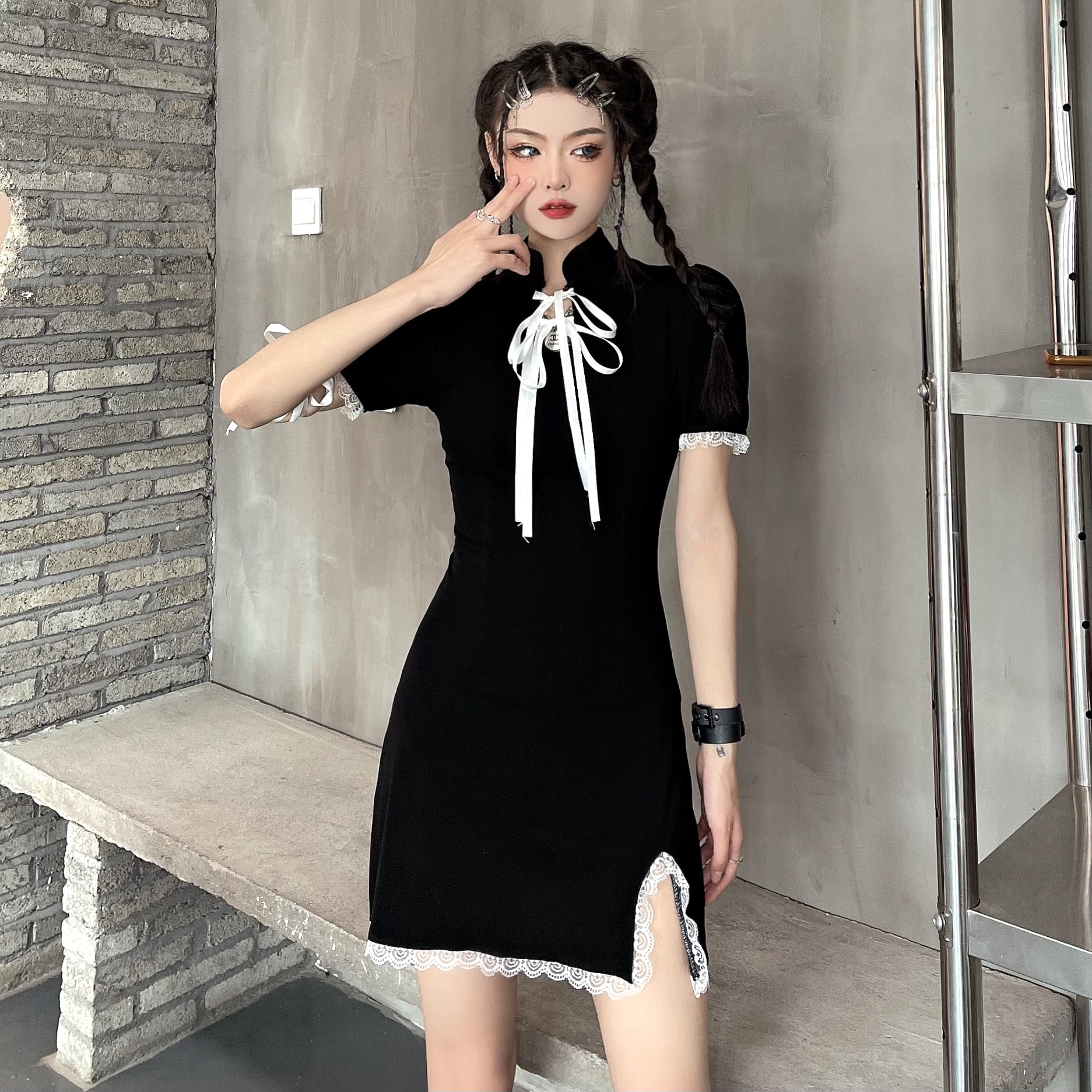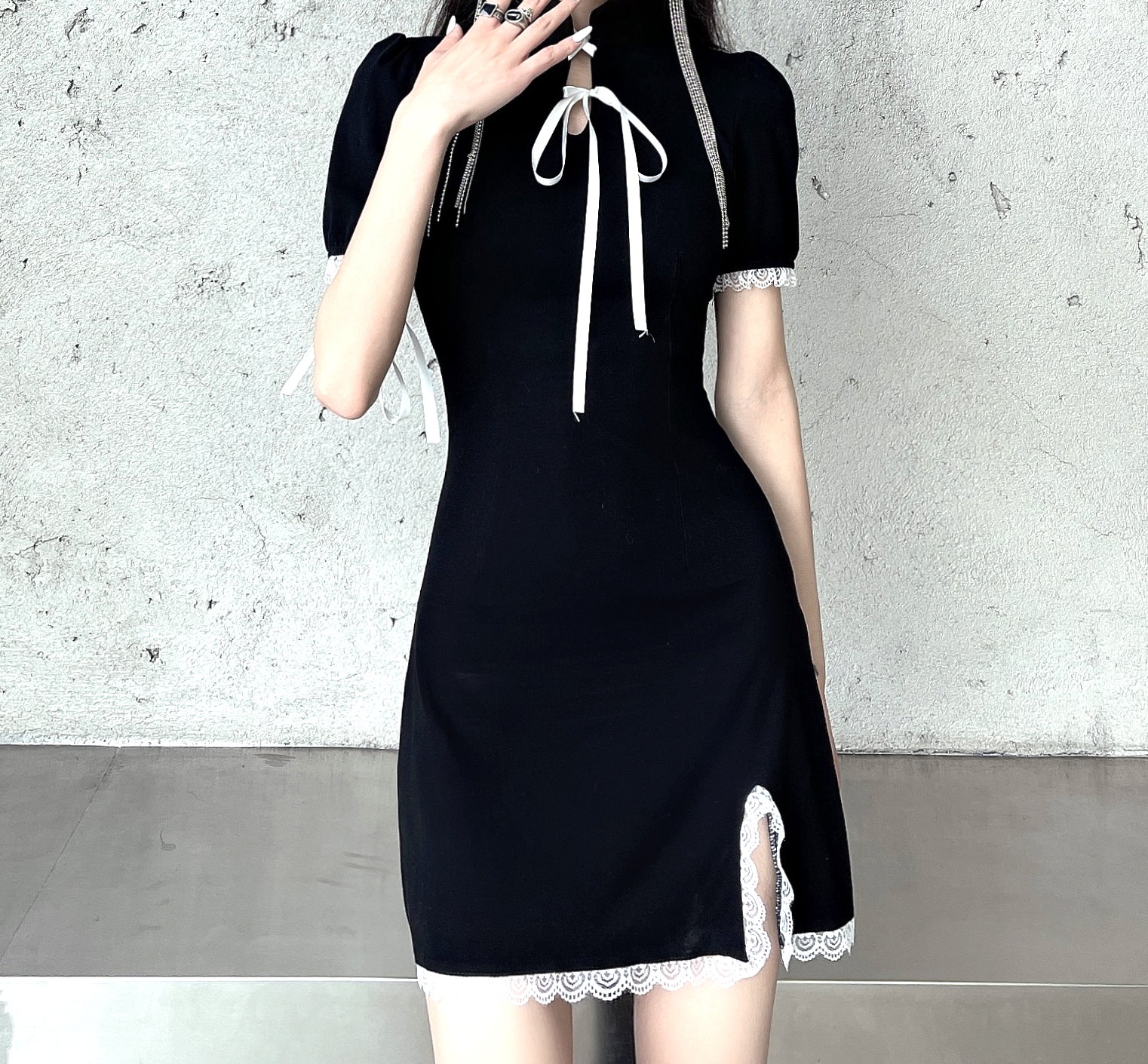 Punk Gothic Lace Strap Bow Knot Bodycon Mini Split Dress 90s Y2K Streetwear Party Amazing