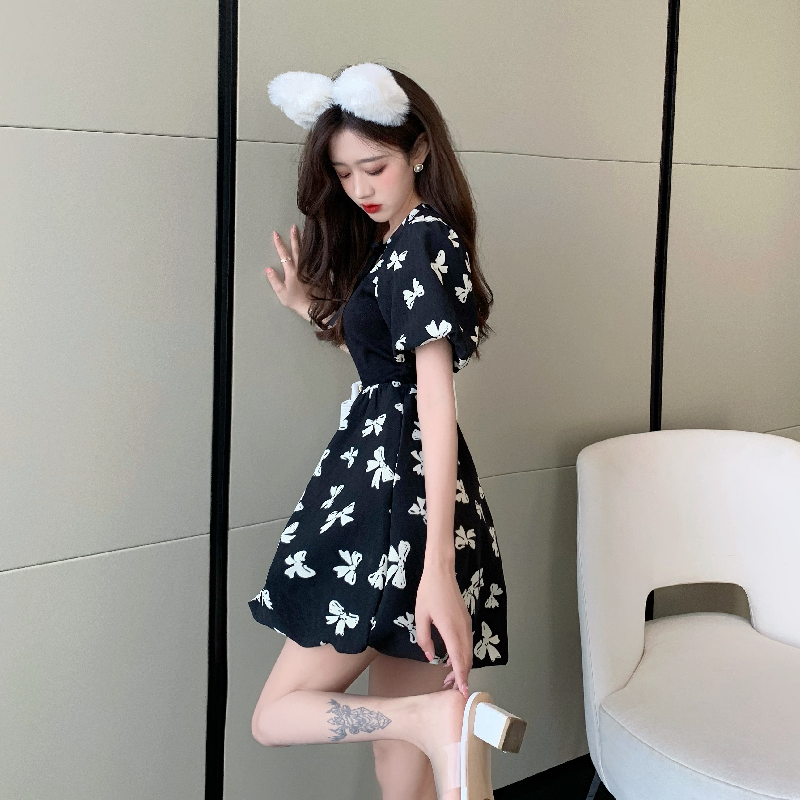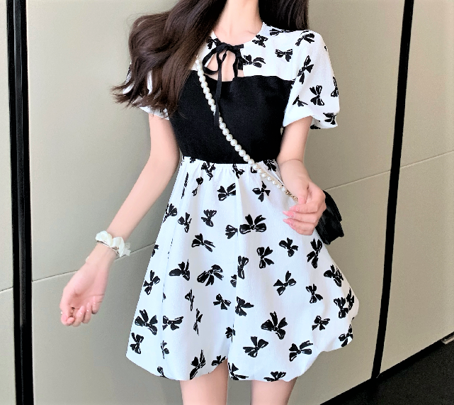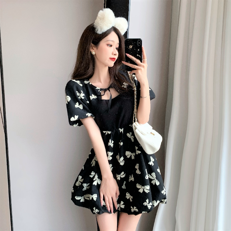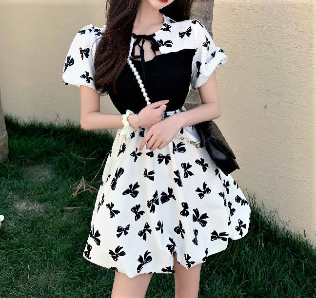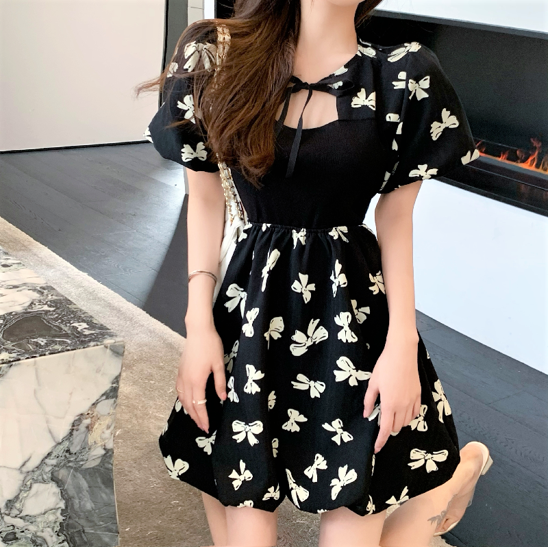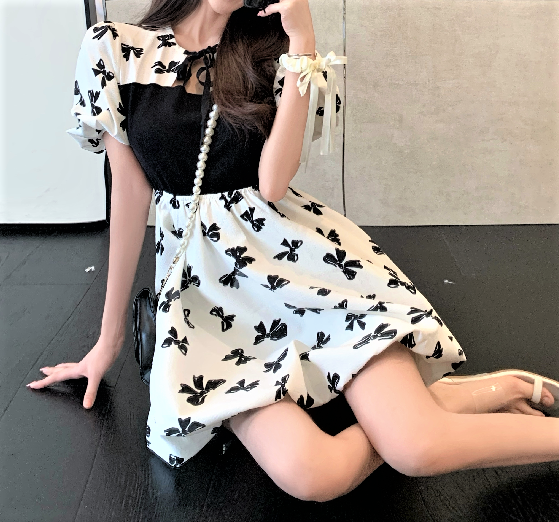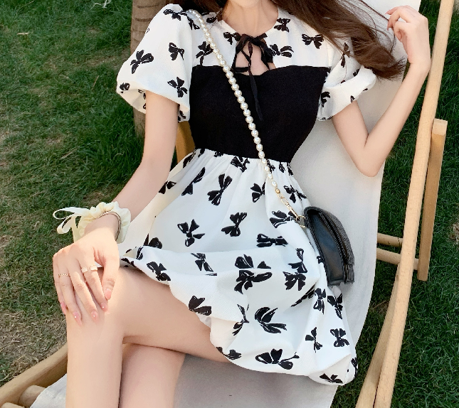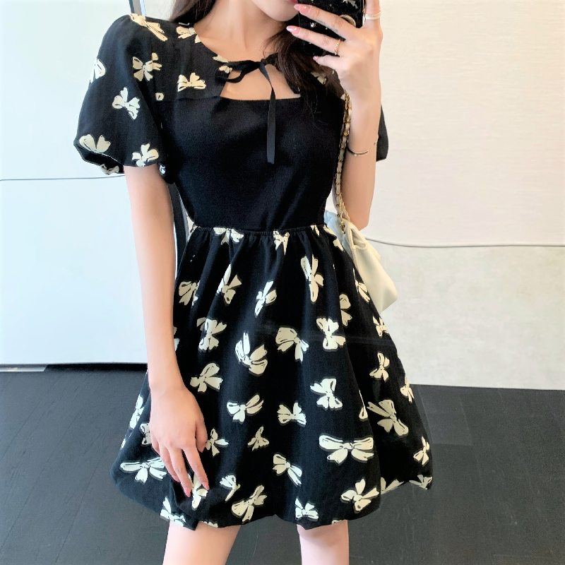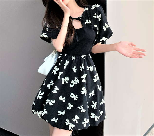 Gothic Puffy Drawstring Details Short Sleeves Butterfly Knot Prints A Line Dress 90s Y2K Party Nightclub Dating Occasion Amazing