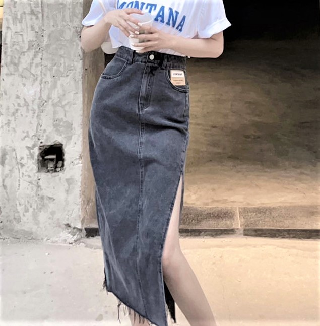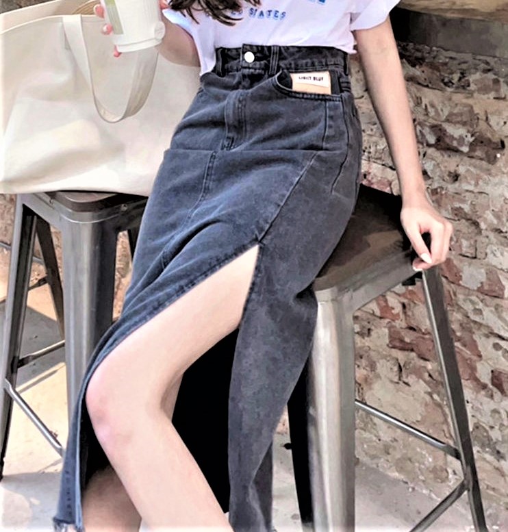 Retro Vintage Ripped Hem High Waist Wash Demin Pencil High Slit Skirt