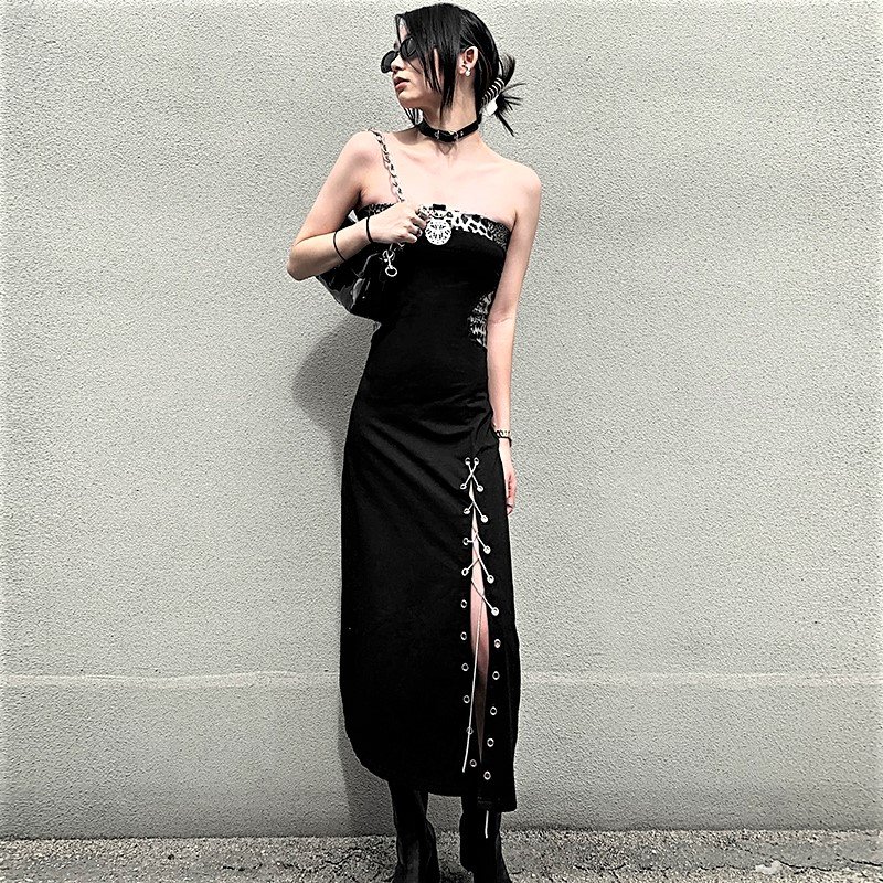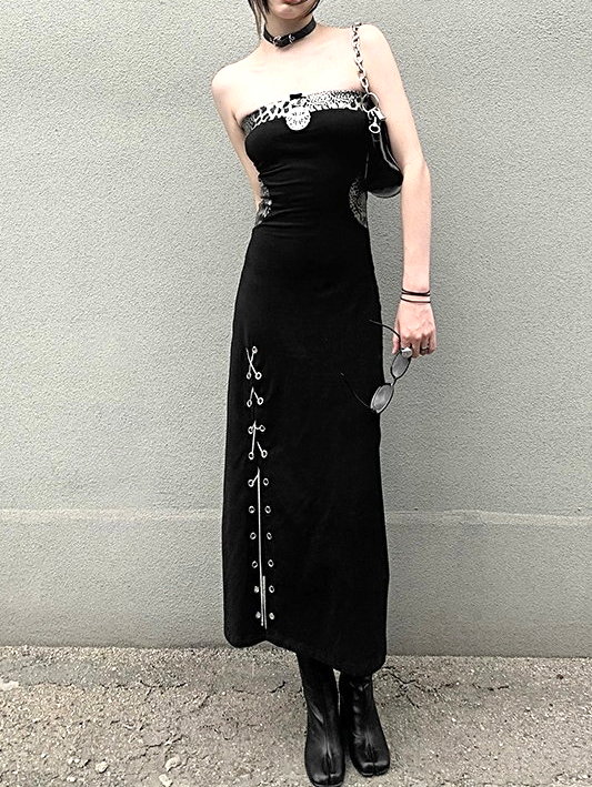 Perfect Vintage Milan Stylish Push Up Bustier Neckline Off Shoulder High Slit Metal Eyelet With Chain Across Trim Detail Vogue Bodycon Maxi Dress 90s Y2K Cocktail Party Occasion Anniversary Evening~Wow~Sooo Bling