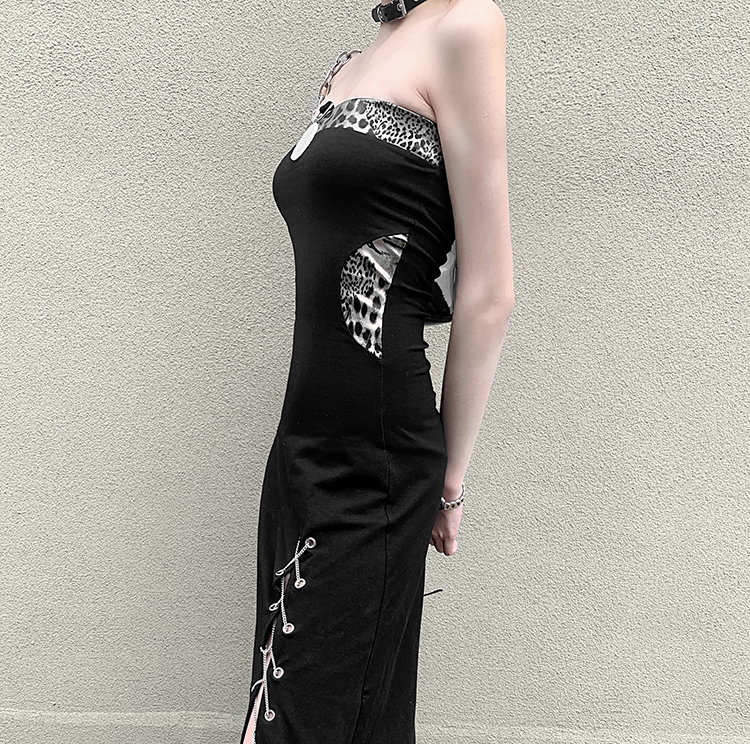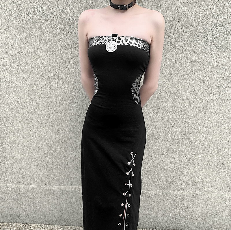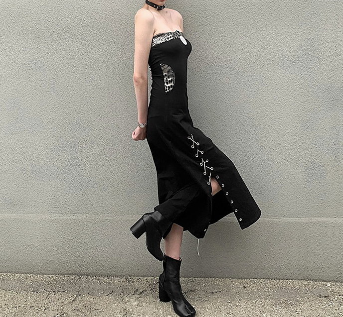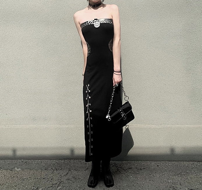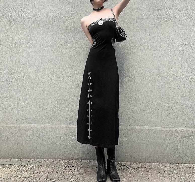 Perfect Vintage Milan Stylish Push Up Bustier Neckline Off Shoulder High Slit Metal Eyelet With Chain Across Trim Detail Vogue Bodycon Maxi Dress