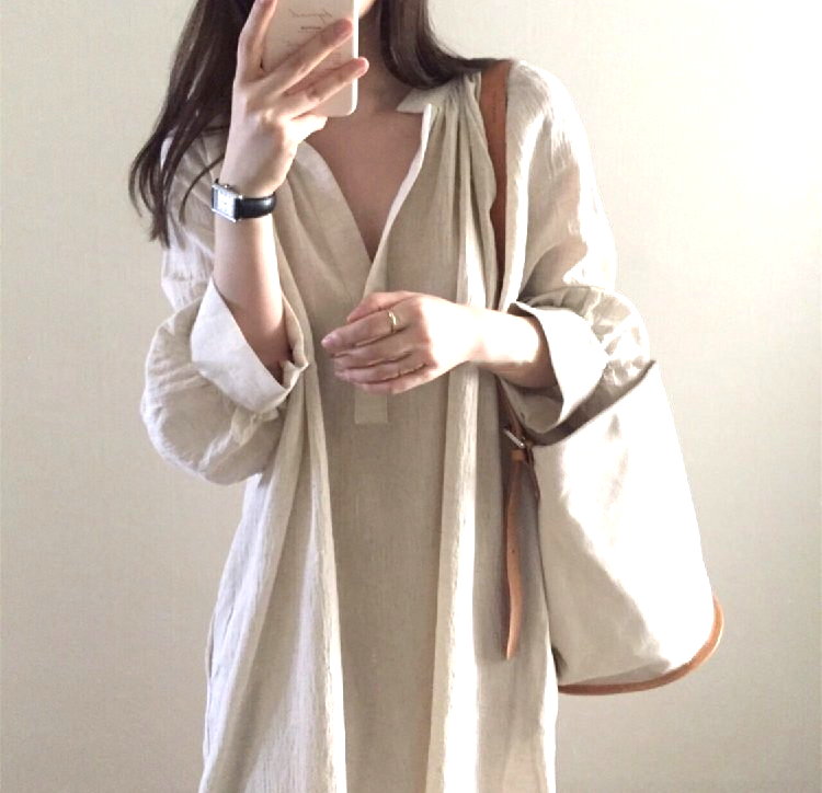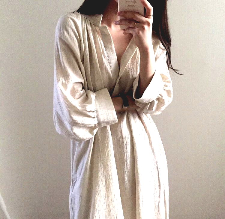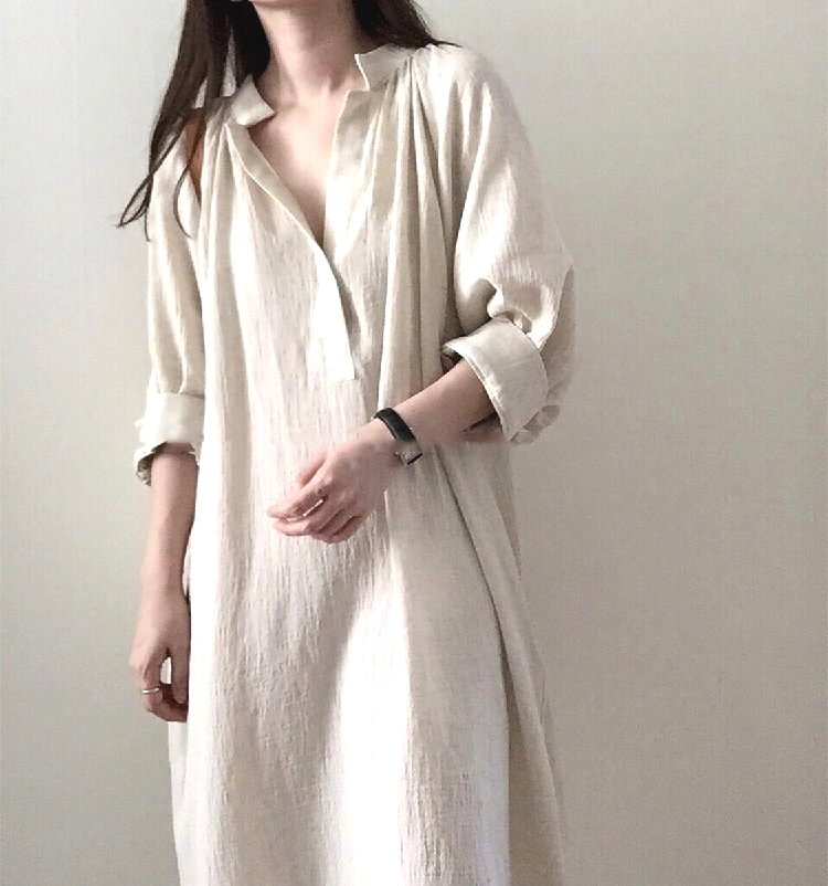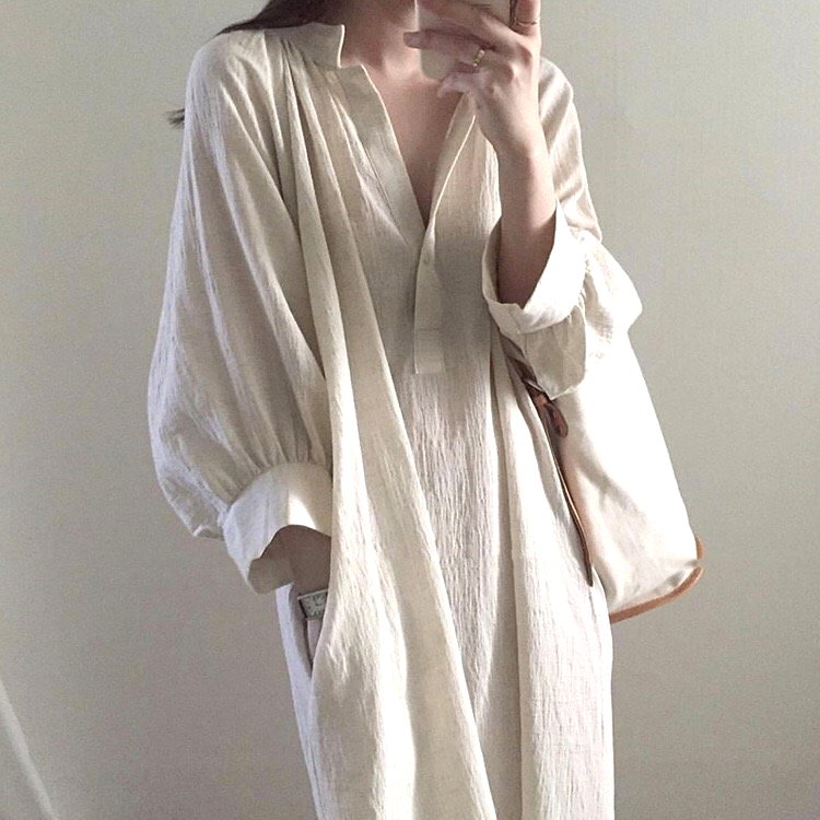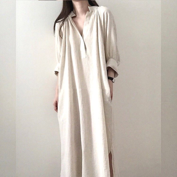 Simple Crinkle Linen Cotton Puffy Lantern Sleeve Side Slit Comfy Loose Fit Maxi Dress Casual Coolest 90s Y2K Amazing