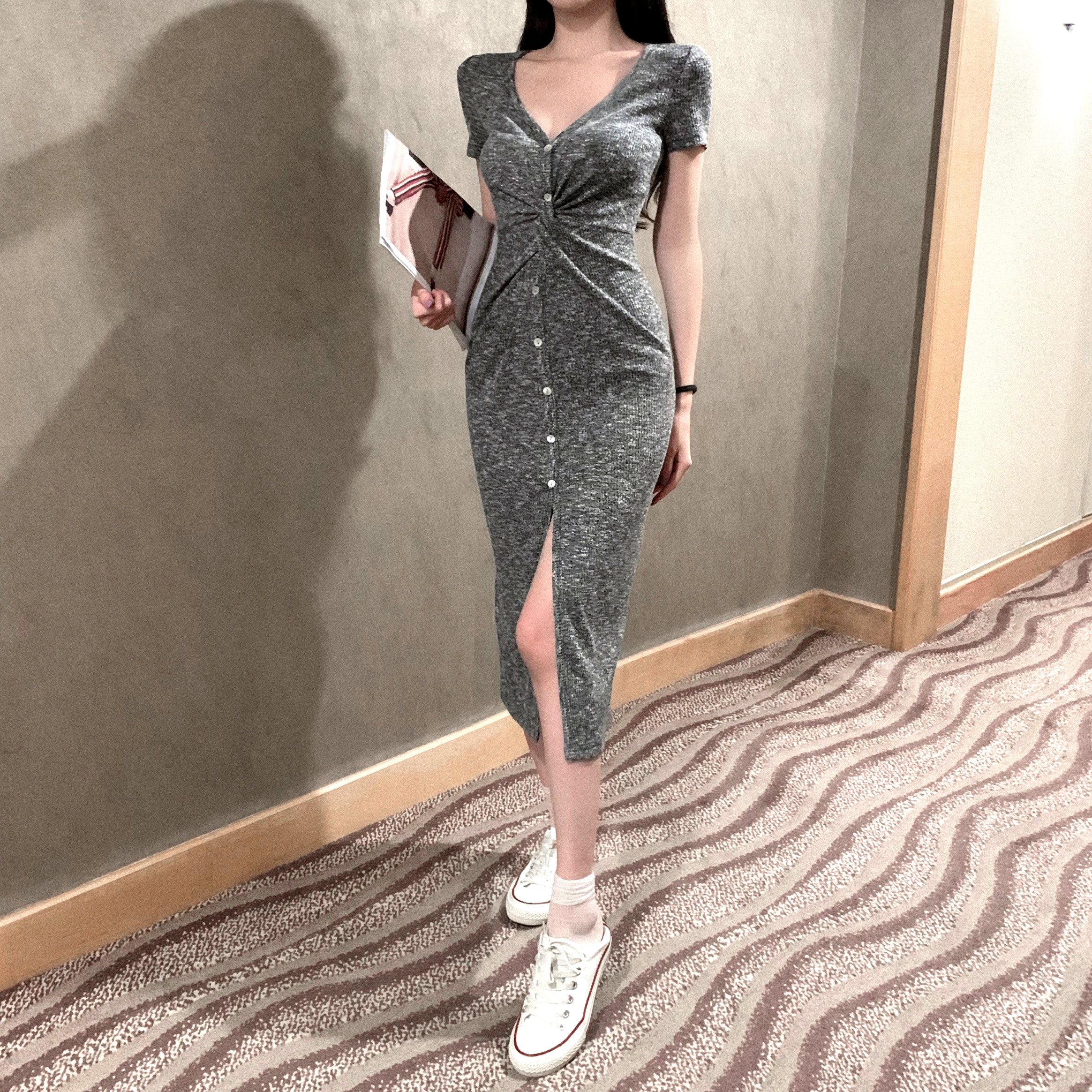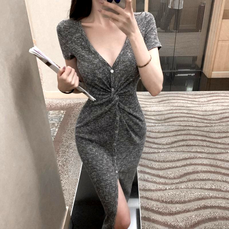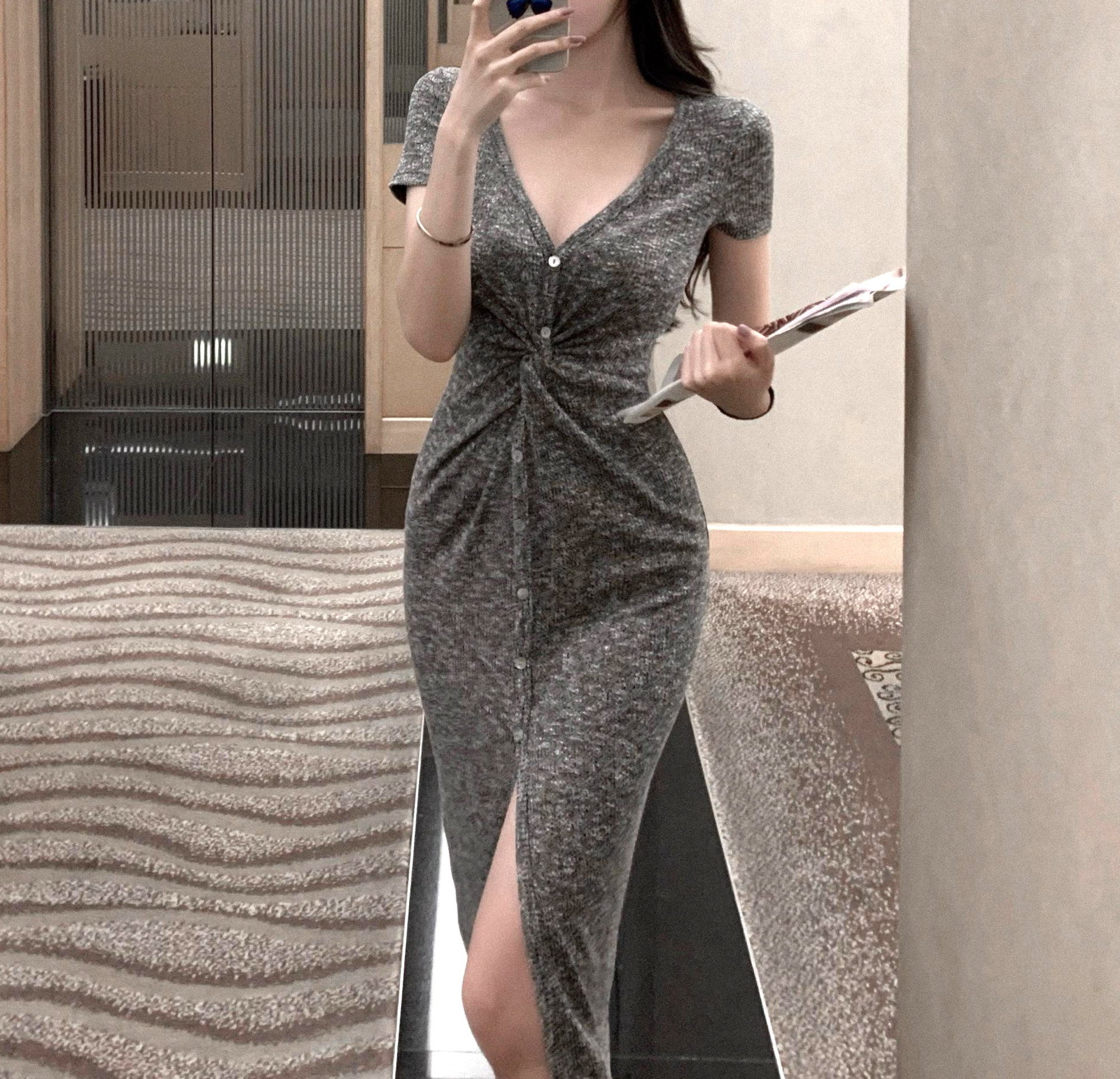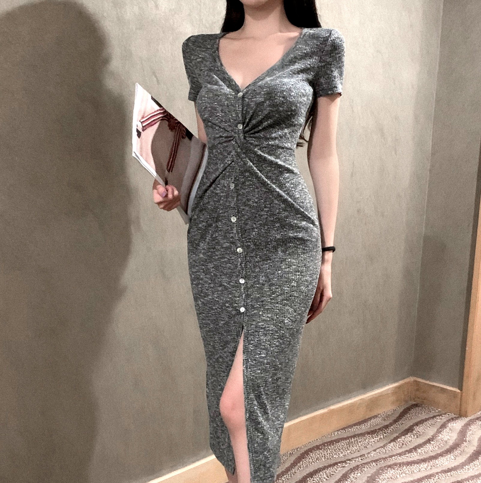 Vintage French Elegant Deep V-Neck Twisted Ruffle Bustier Full Buttons Opening High Split Slinky Dress