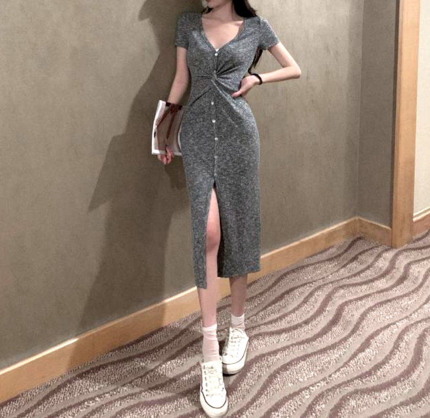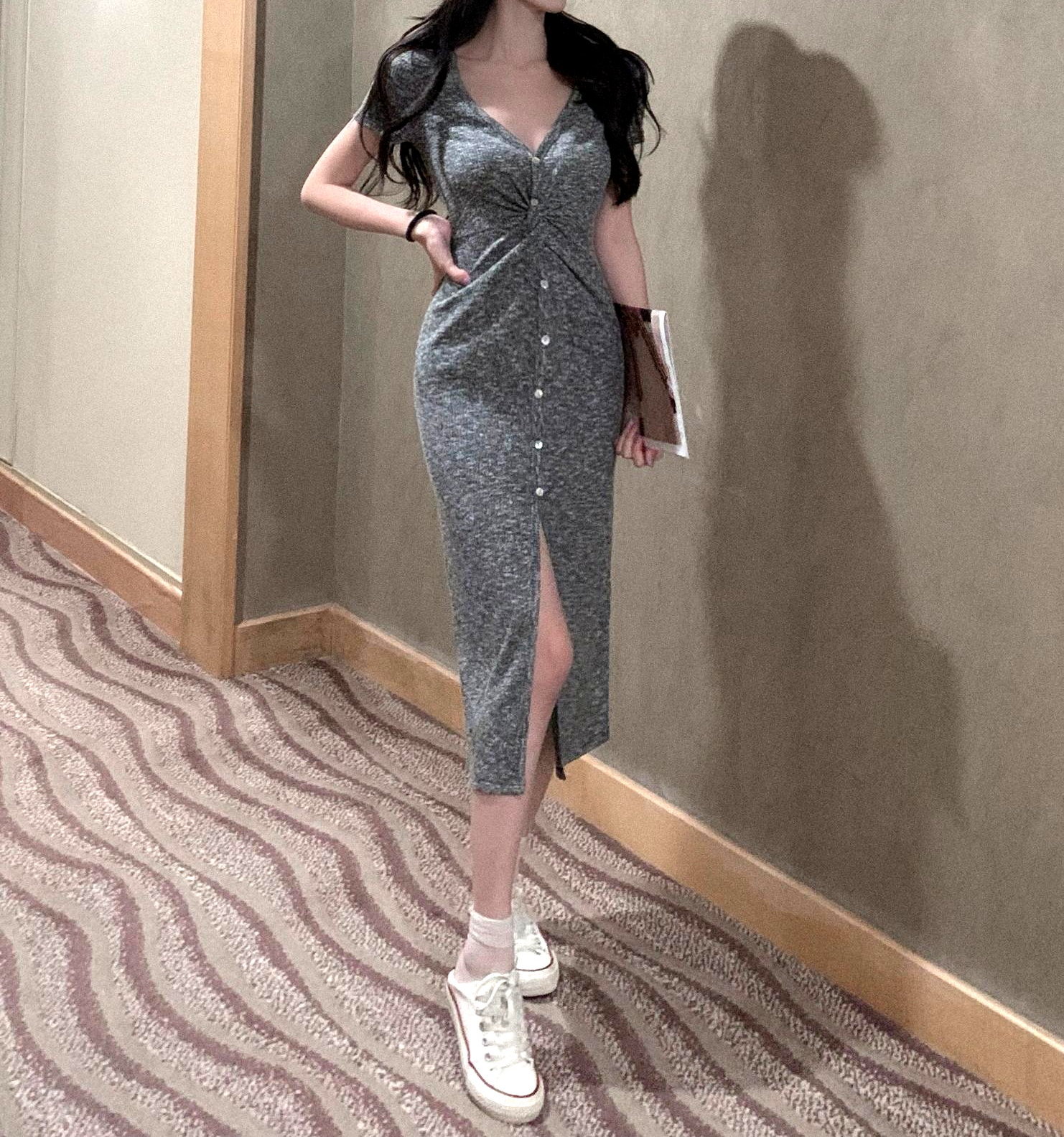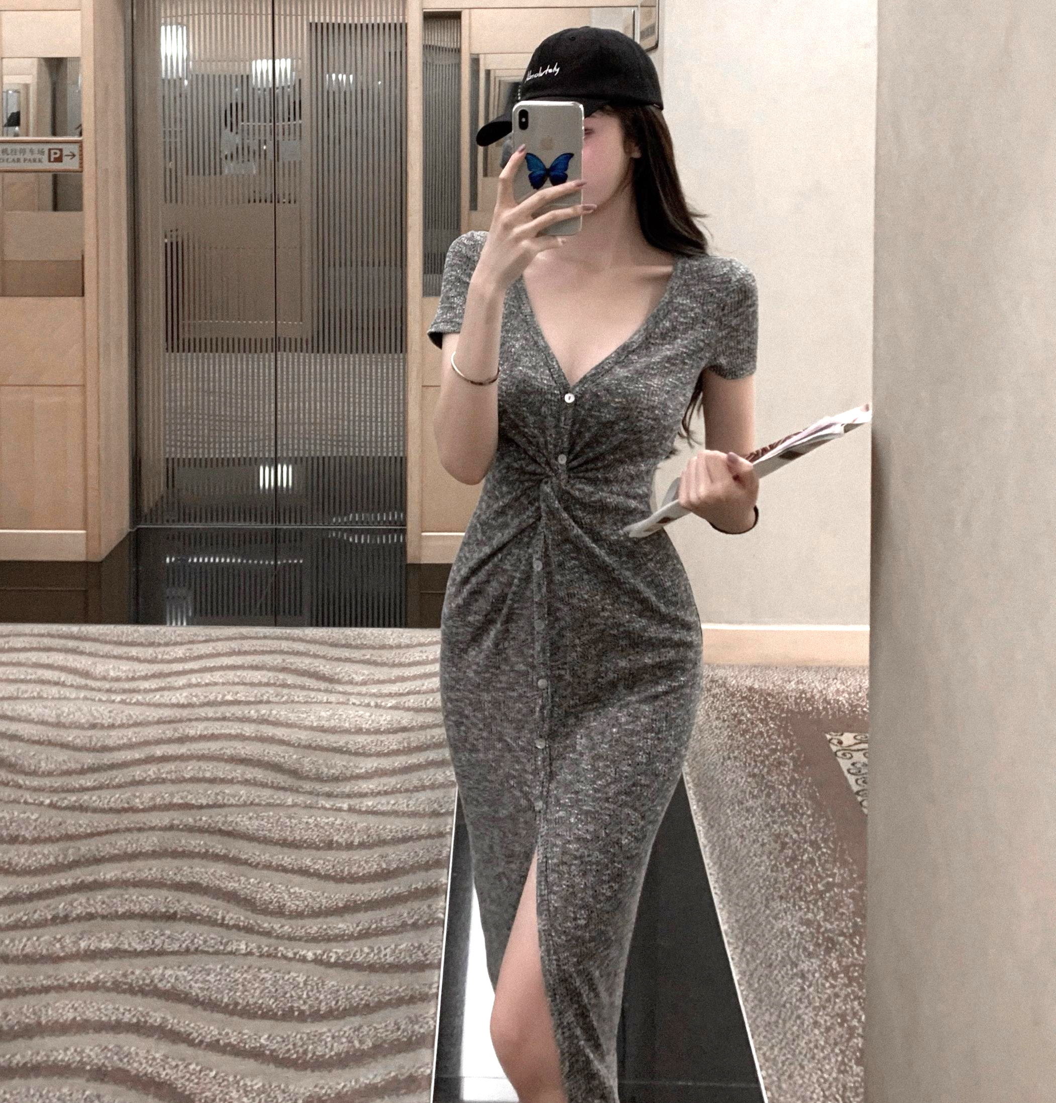 Vintage French Elegant Deep V-Neck Twisted Ruffle Bustier Full Buttons Opening High Split Slinky Dress