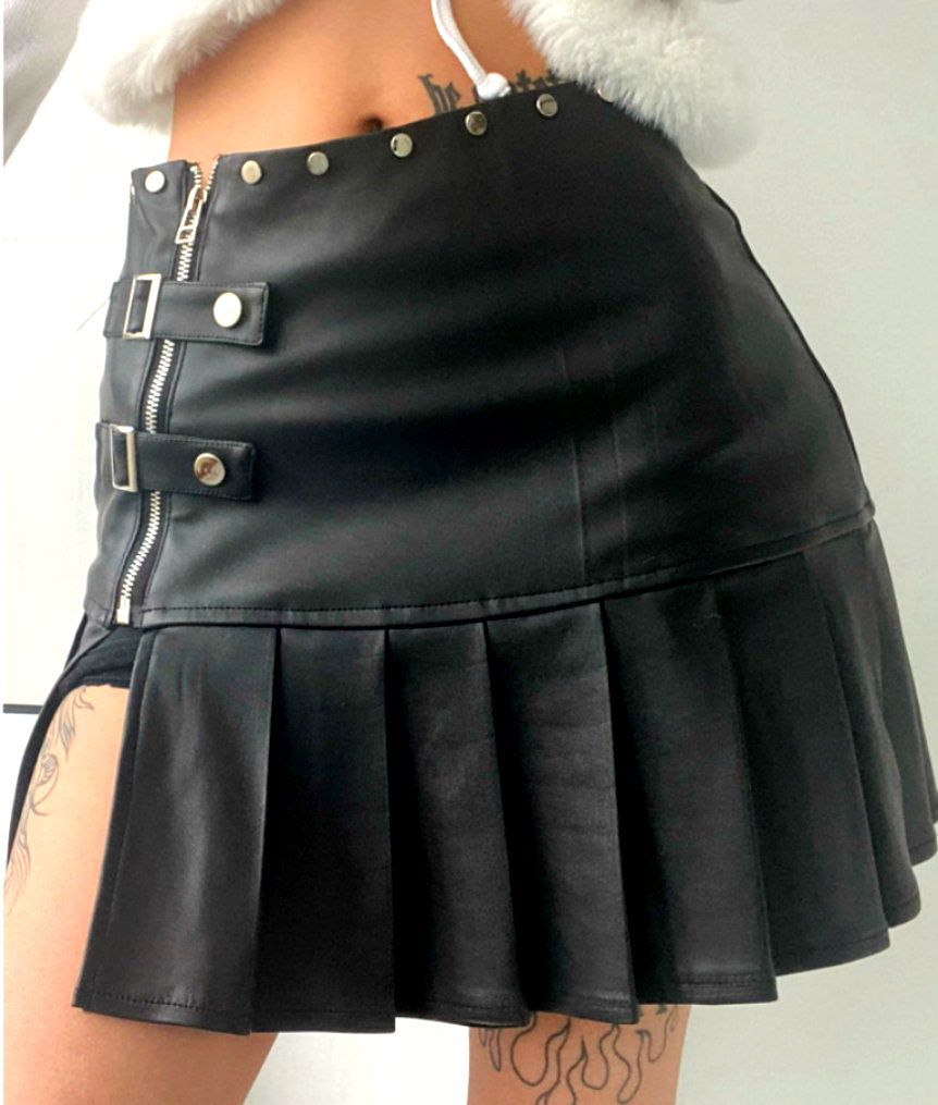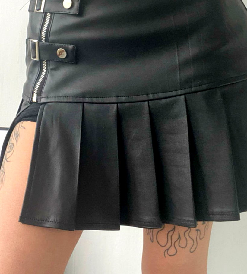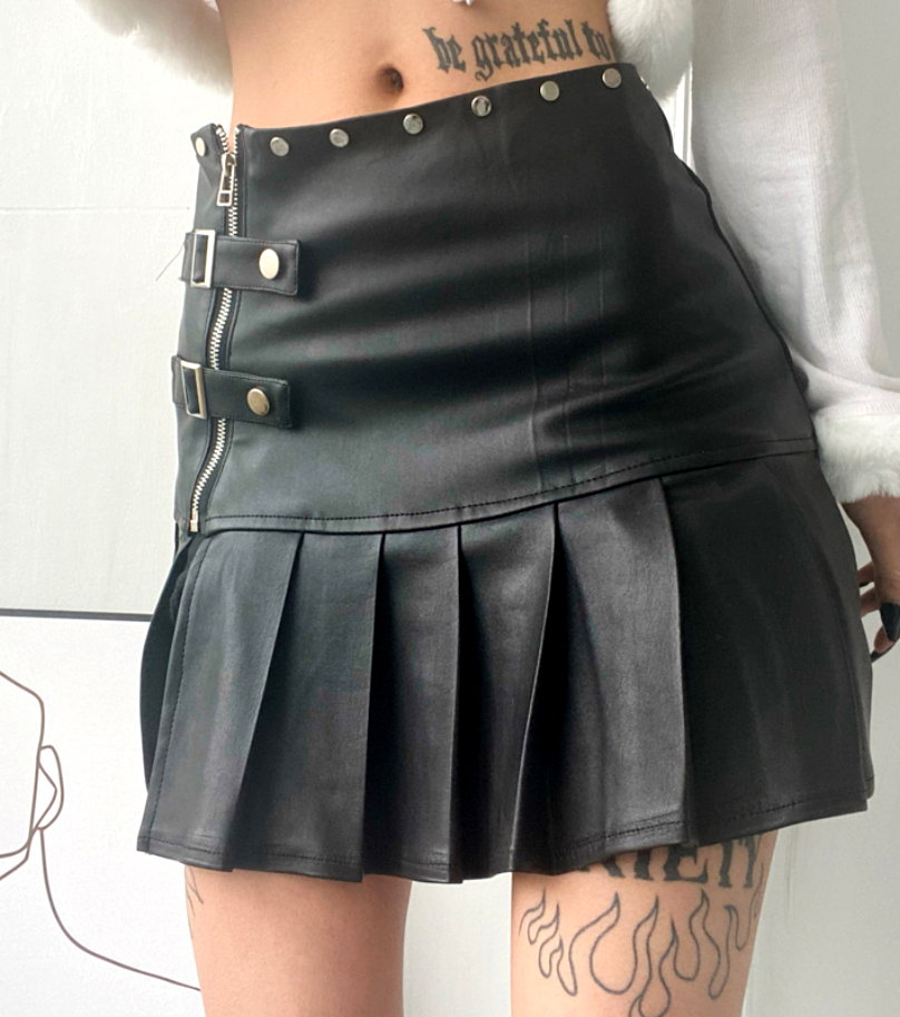 Sexy Punk Faux Leather Side Slit Buckle Strap Zipper Pleated Mini Skirt Y2K