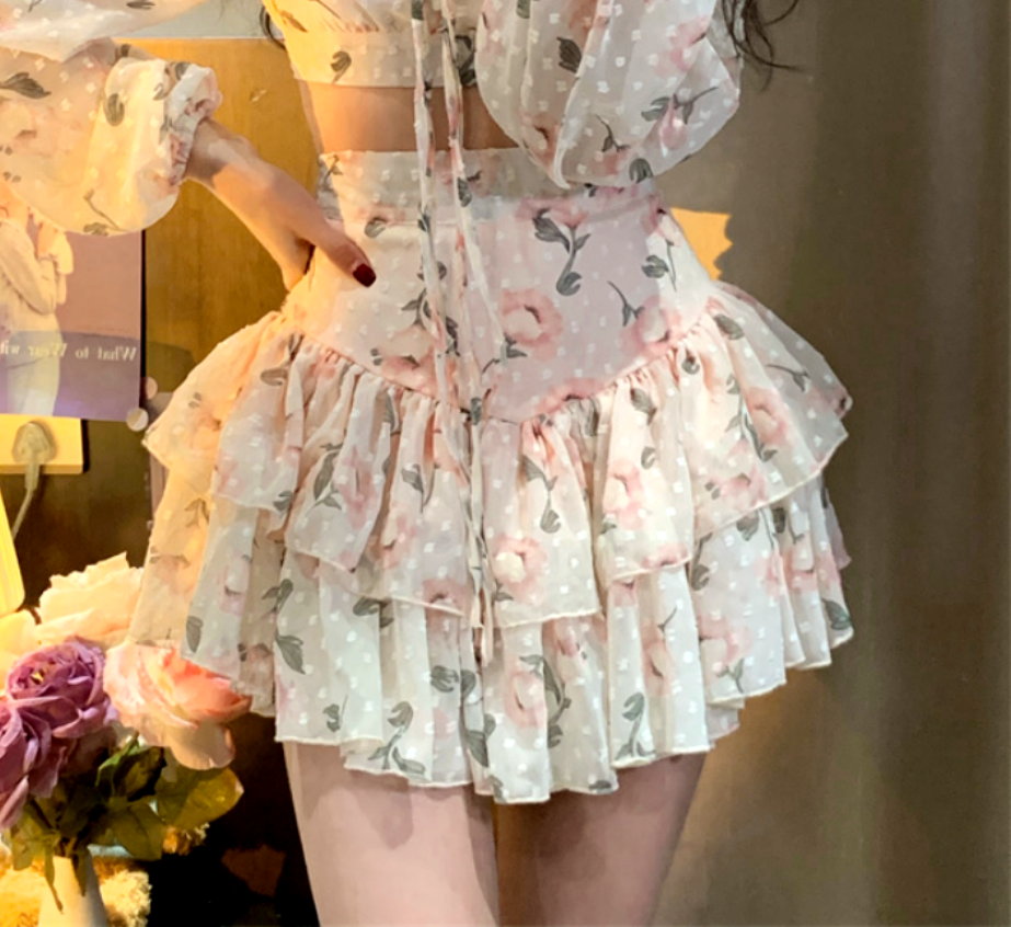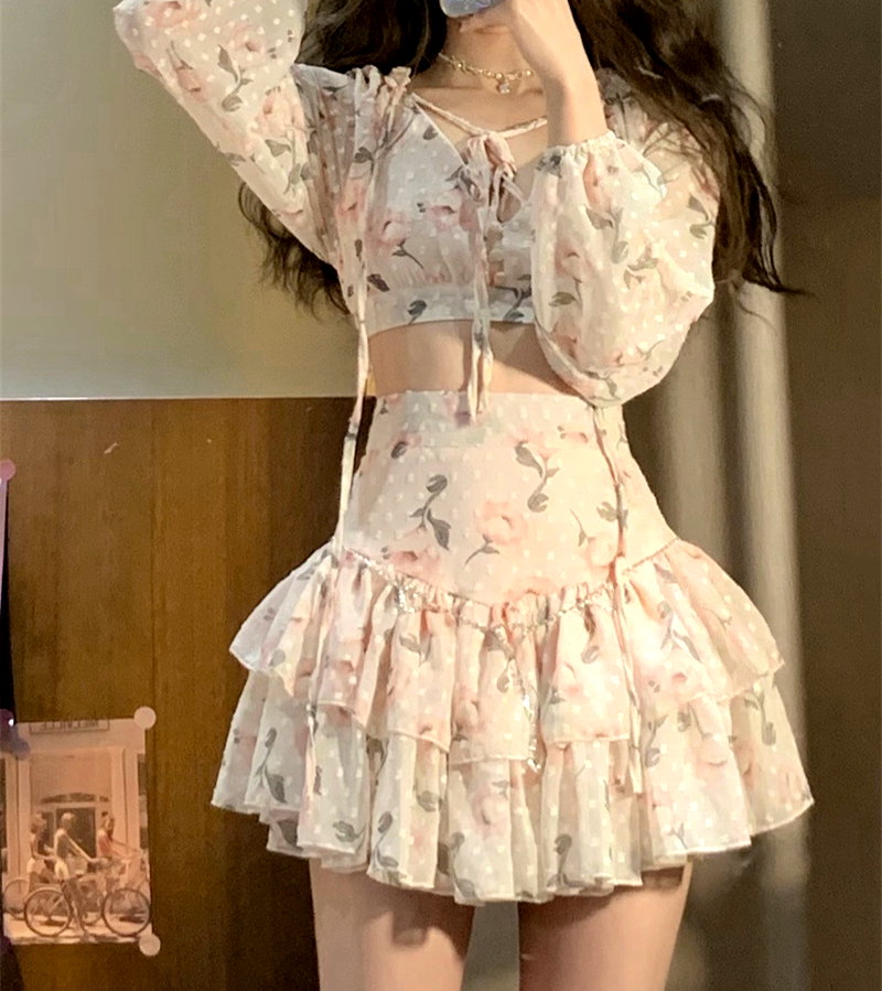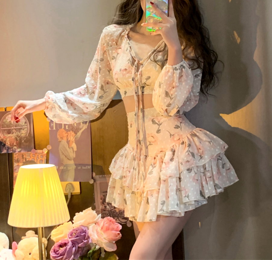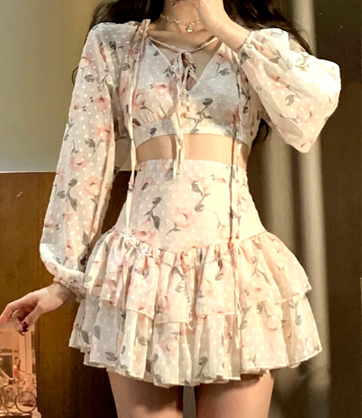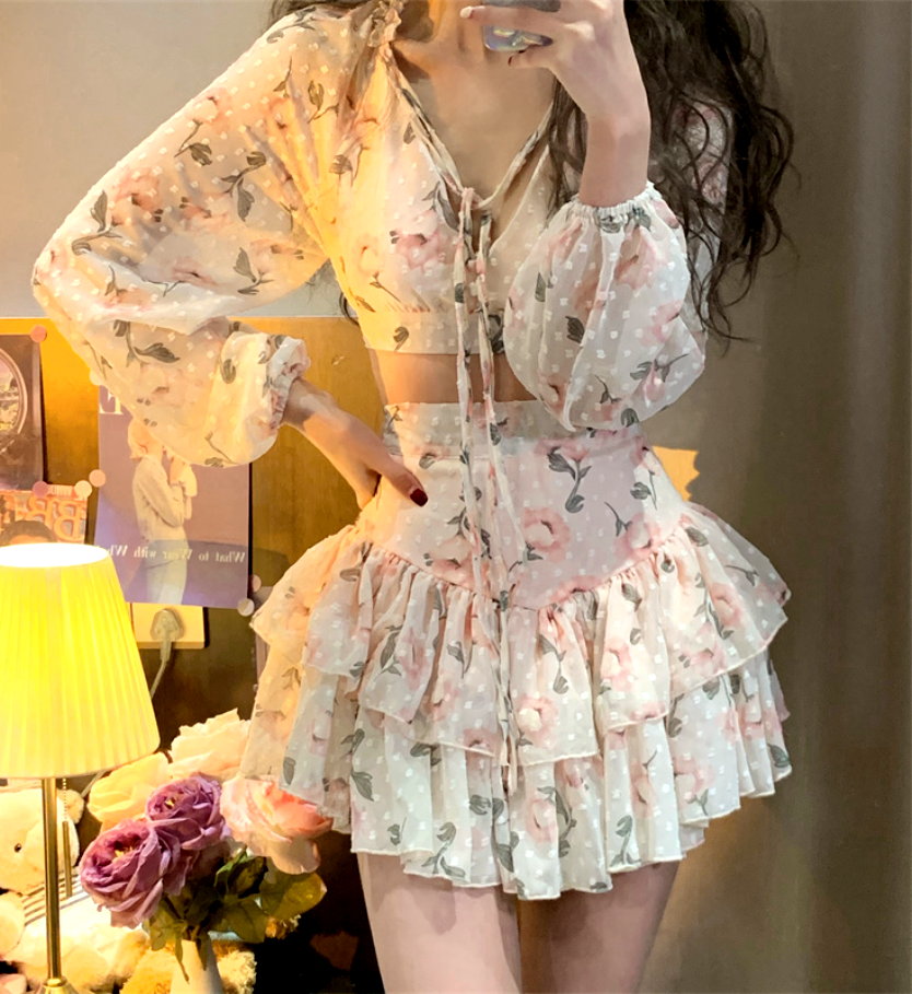 Sexy Gothic Chiffon Floral V-neck Drawstring Tie Lantern Puffy Sleeve Tops + Sexy Ruched Ruffle Layered High Waist Mini Skirt