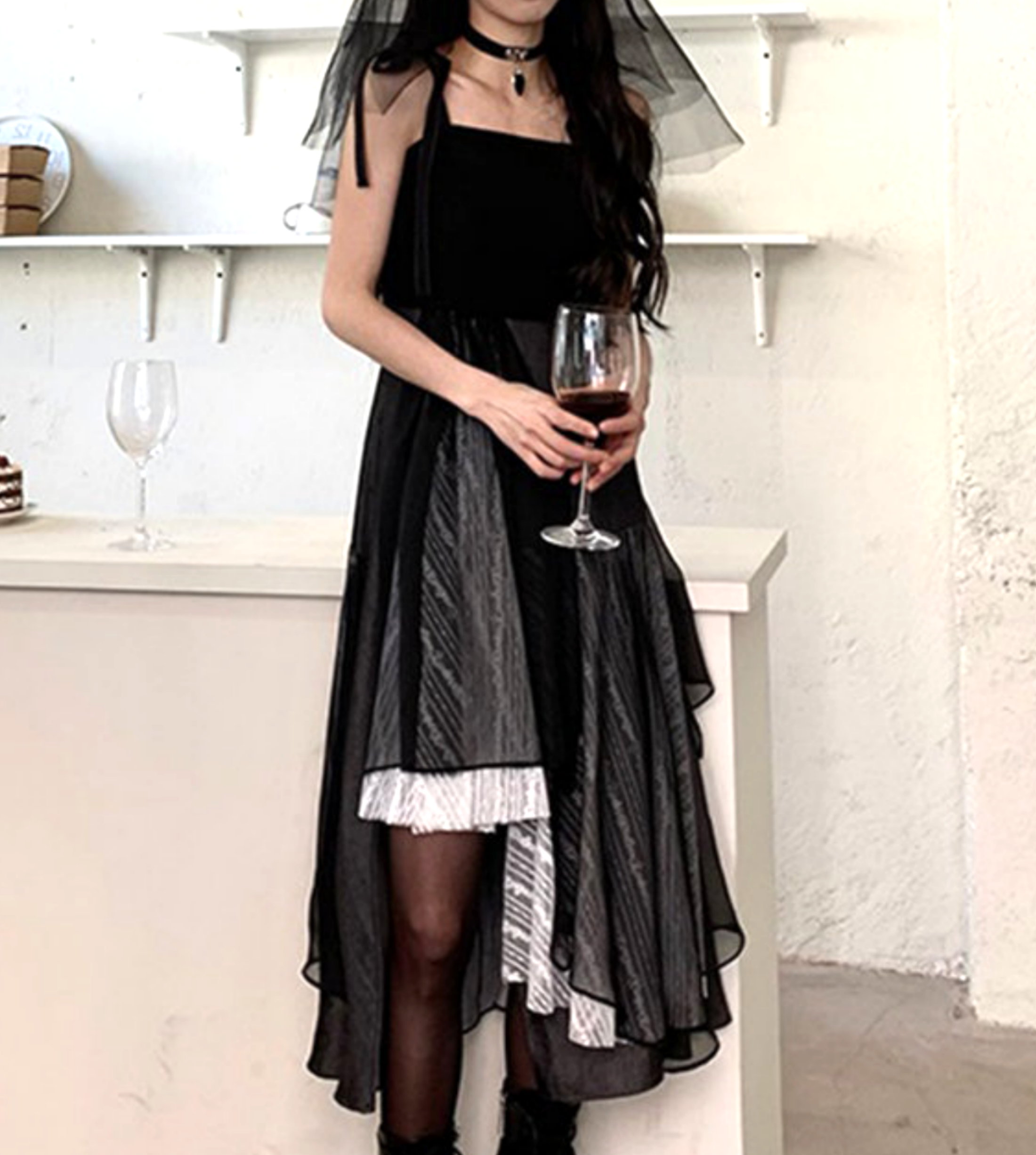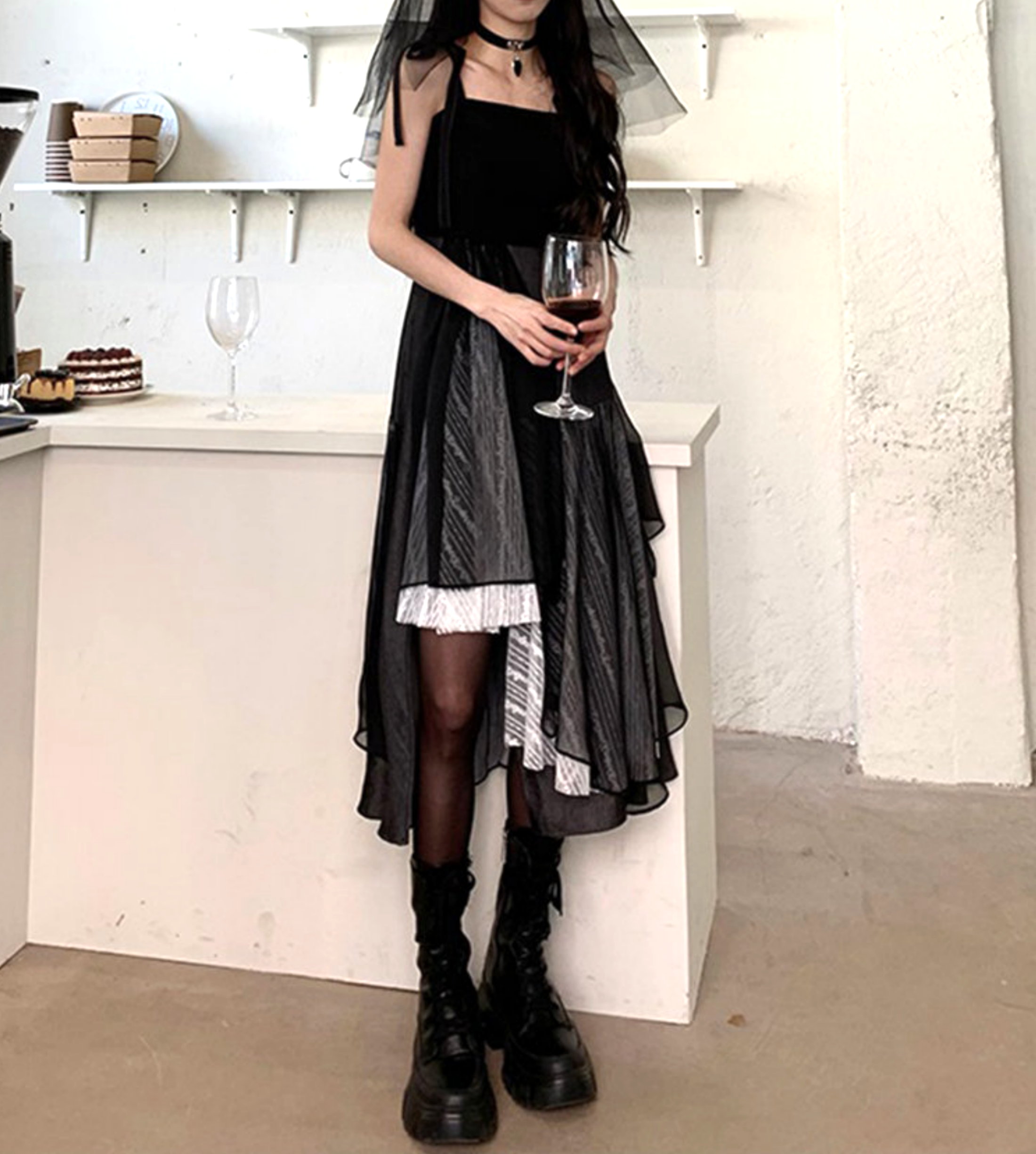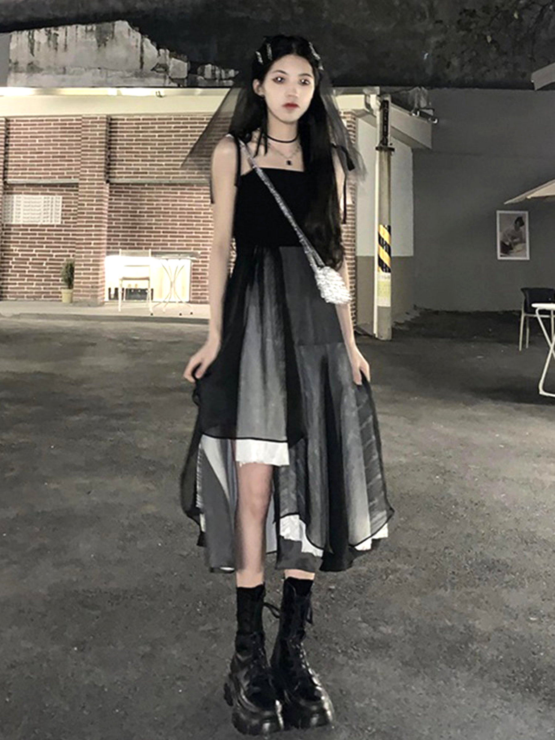 Black Gothic Aysmmetric Layers Lace Patchwork Punk Ruffle Dress Y2K 90s Streetwear Party Nightclub Dance Amazing