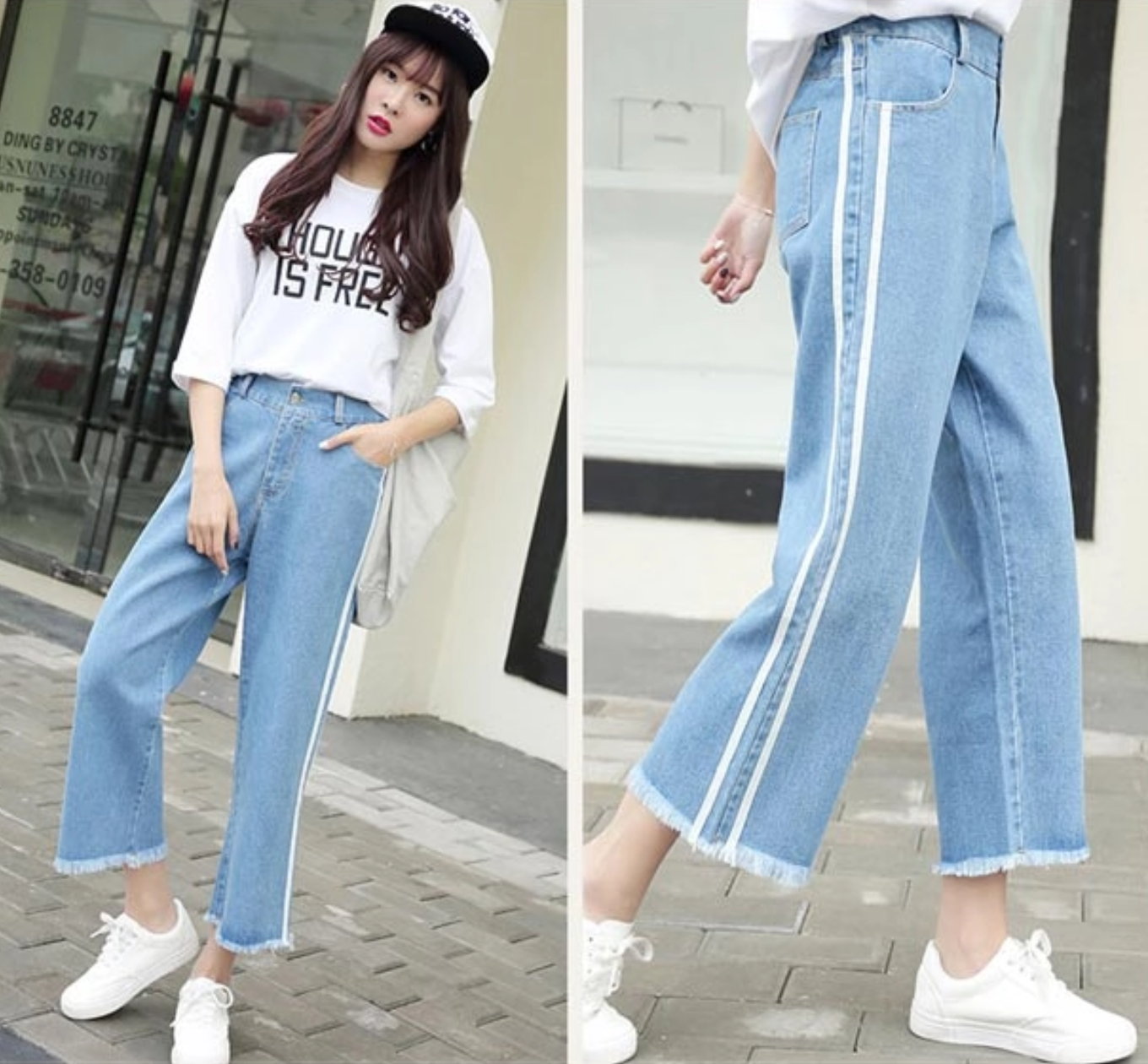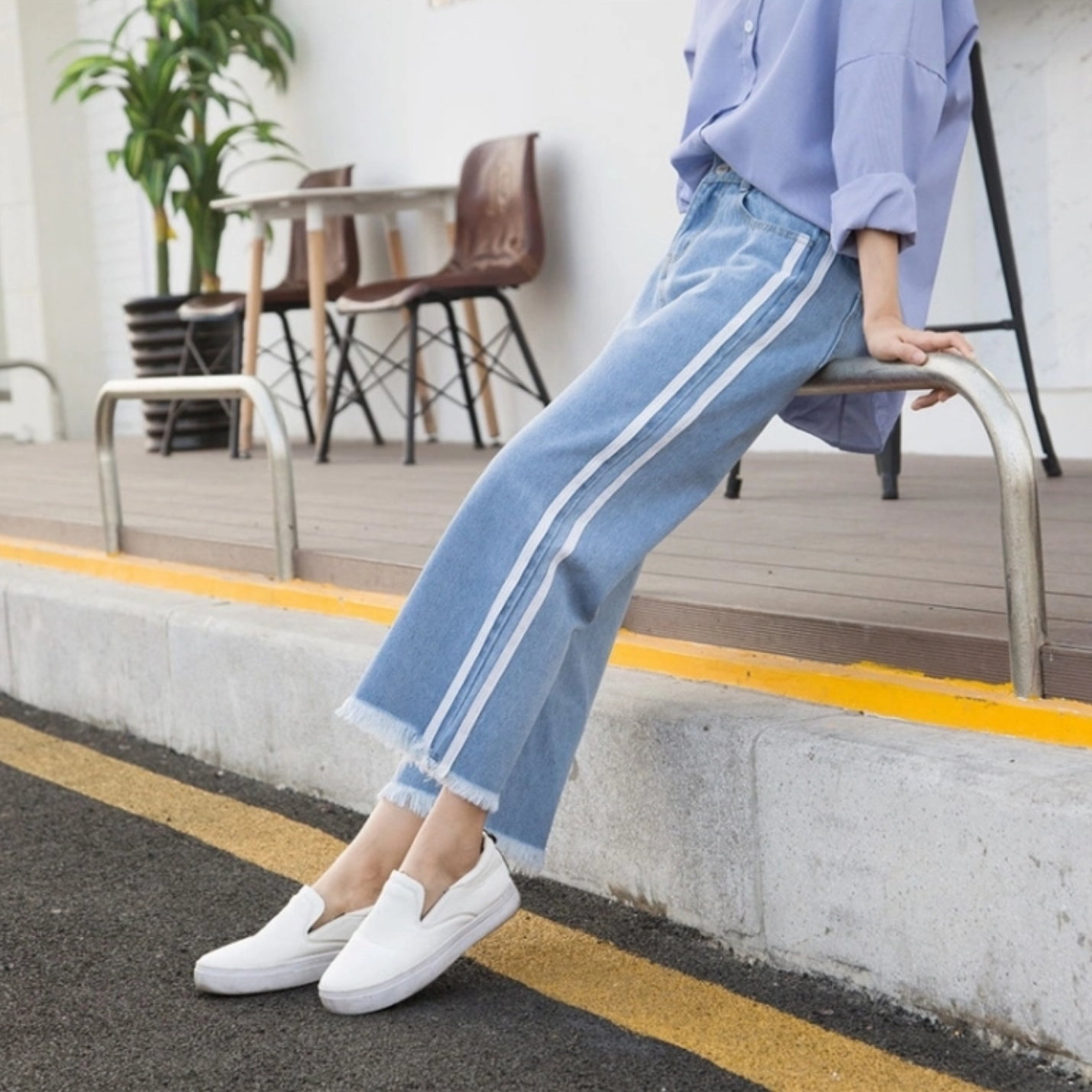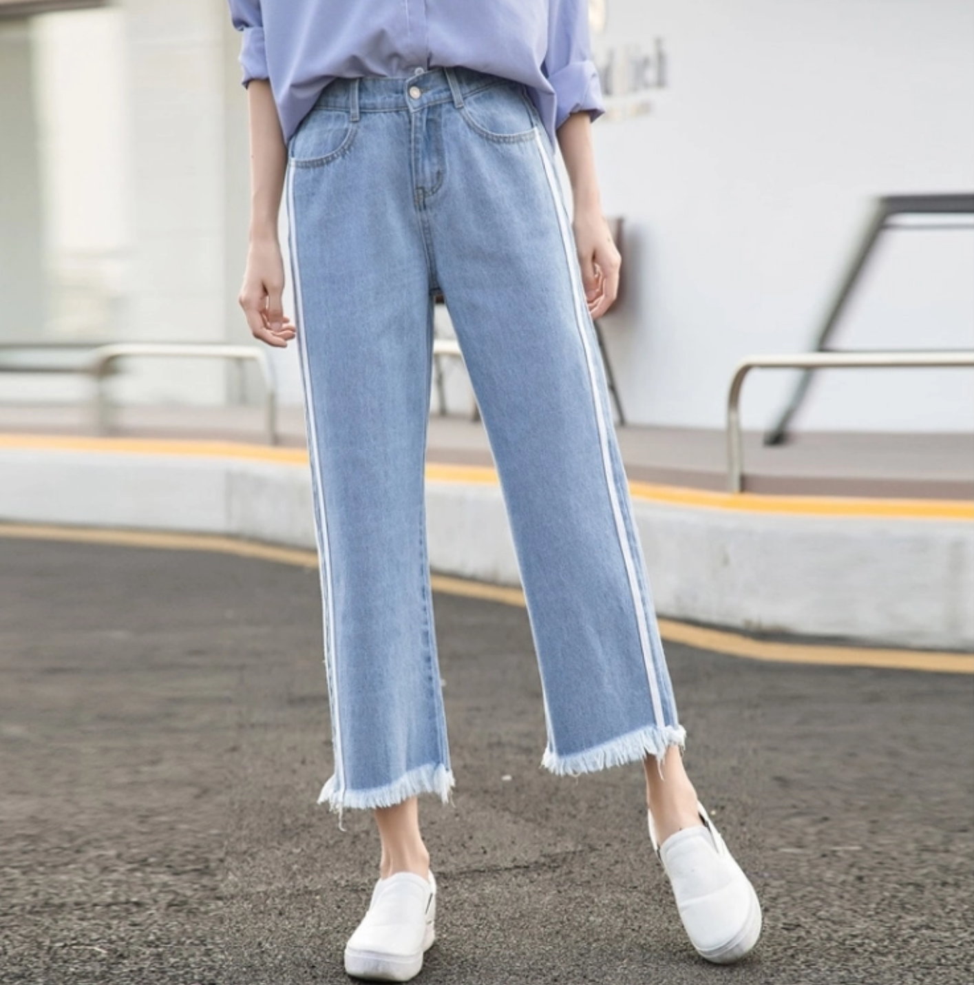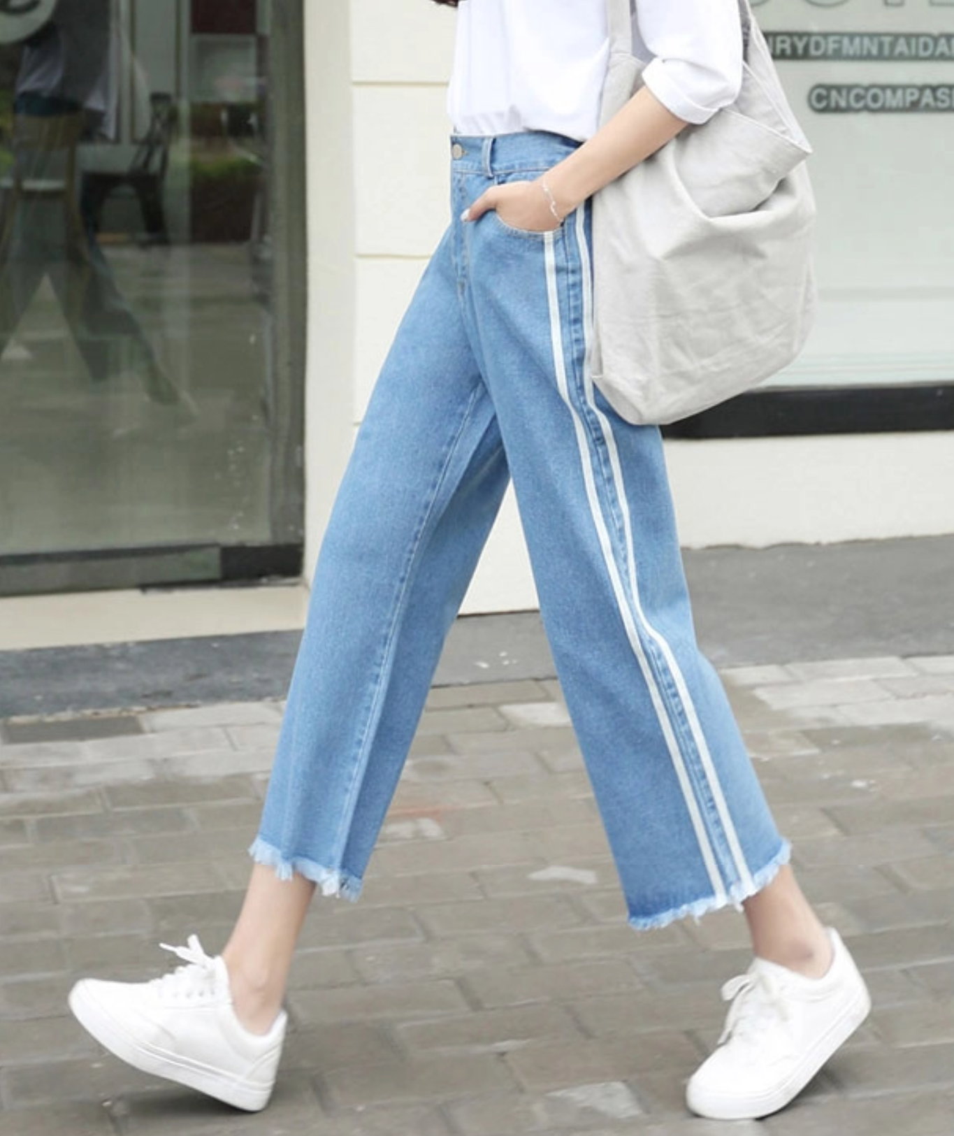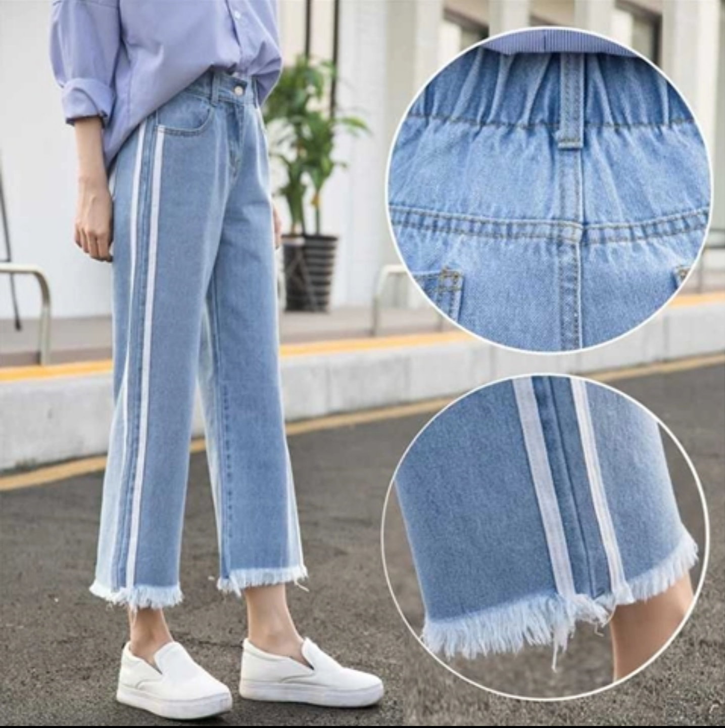 Fashion High Waist Elastic Wide Leg Side Stripe Loose Tassel Pants Women Washed Jean Trousers