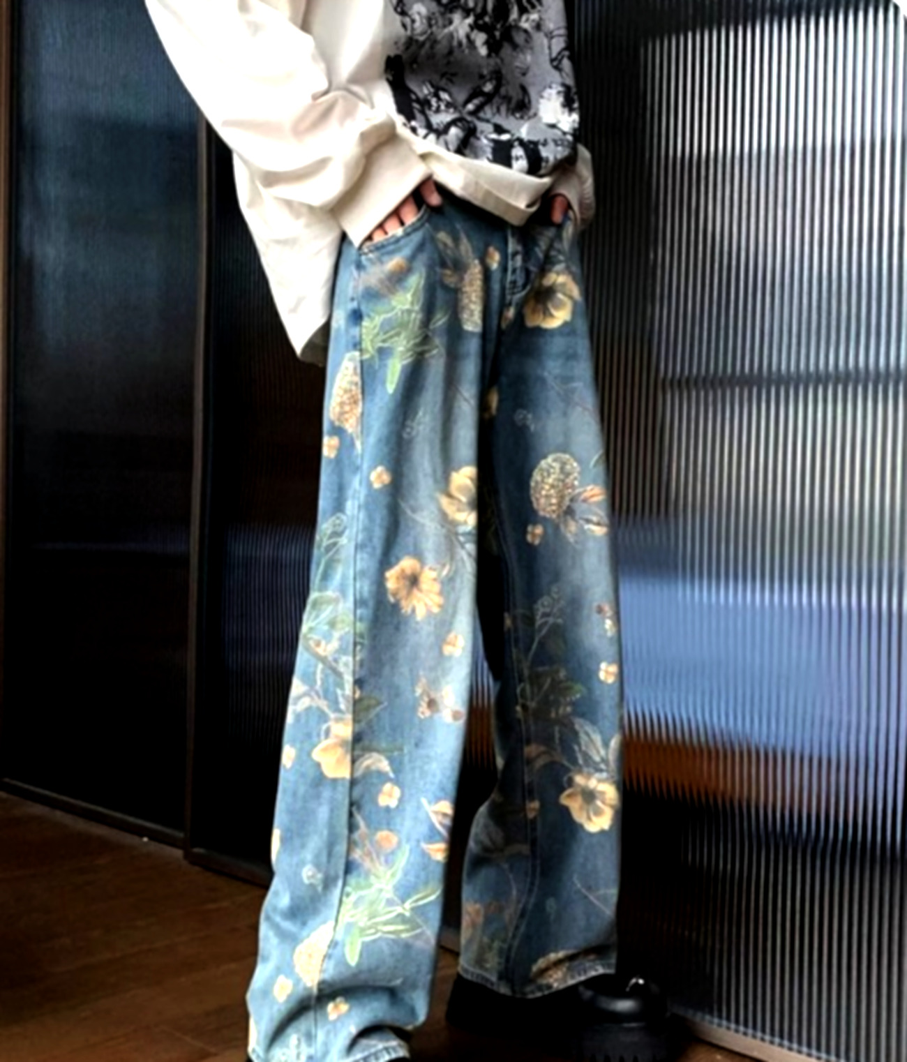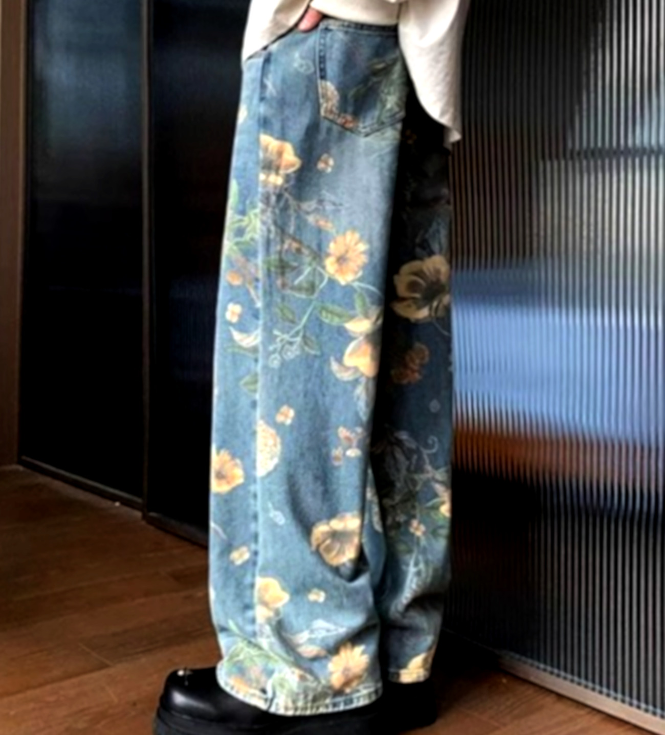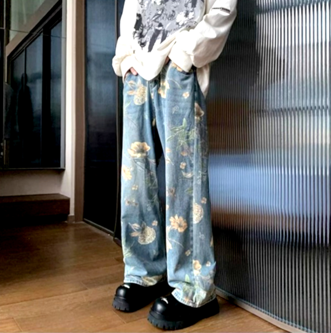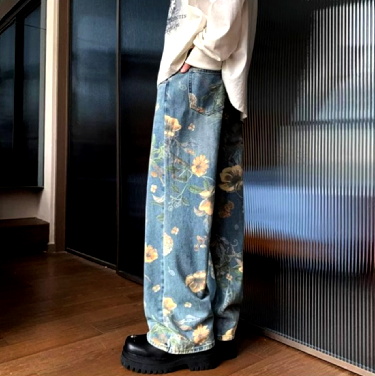 Stunning Punk Floral Print Oversize Wide-leg Washed Jeans For Men, Women Y2K Streetwear Amazing
