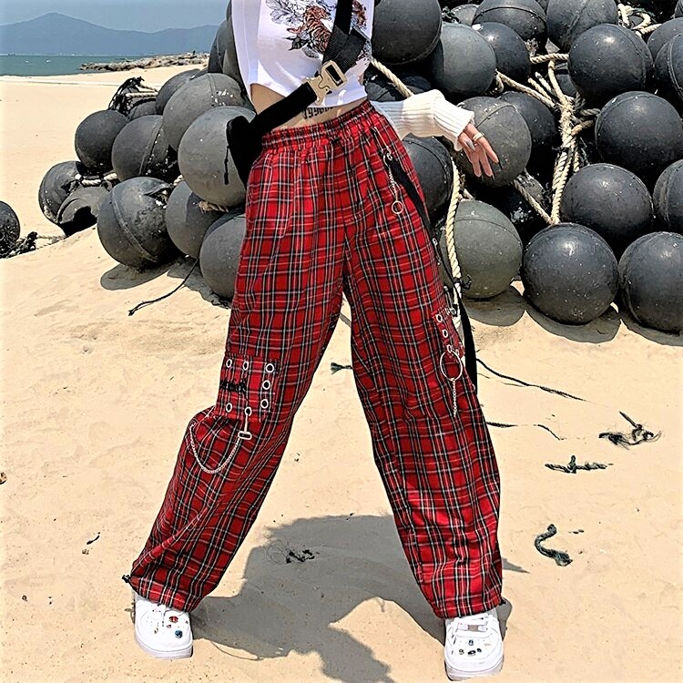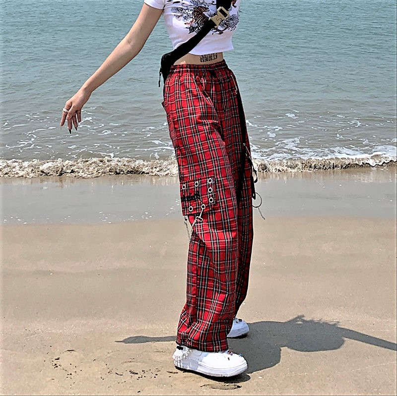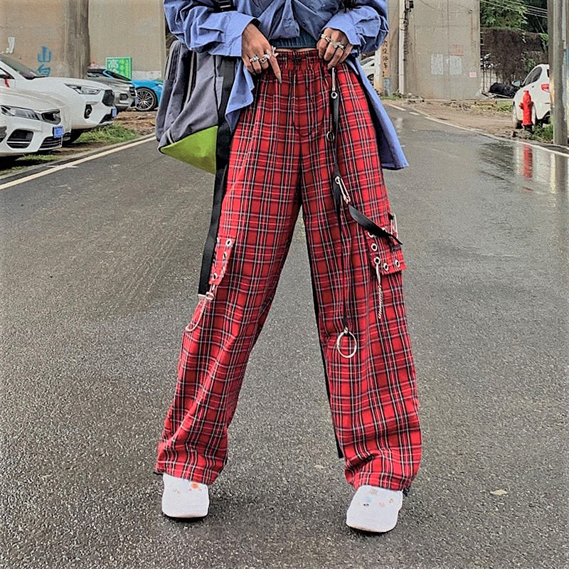Vintage Punk England Plaid Straps Embellish Harajuku Cargo Trousers Streetwear Rave Awesome