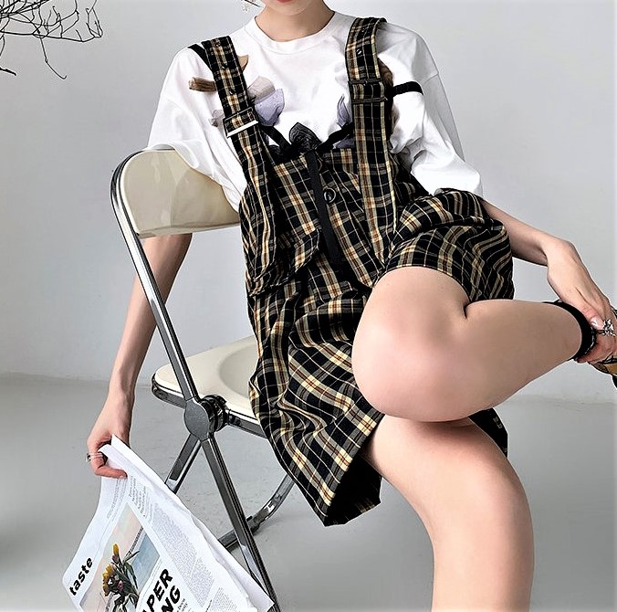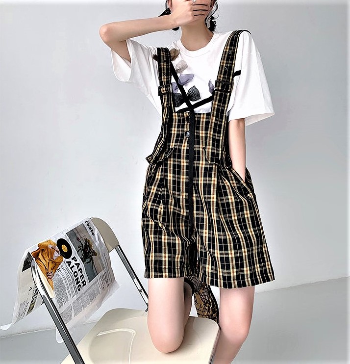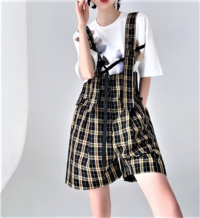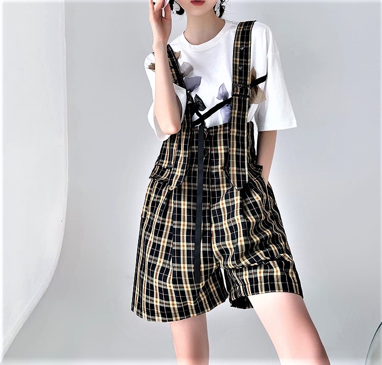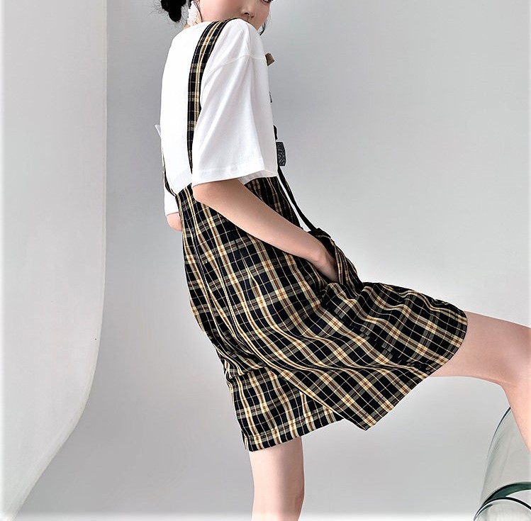Vintage Retro England Baggy Cargo Suspender Checked Pants Wide Sling Straps Perfect Flattering Hippie Shorts 90s Y2K Party Nightclub Dating Occasion Amazing