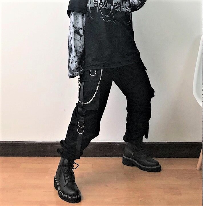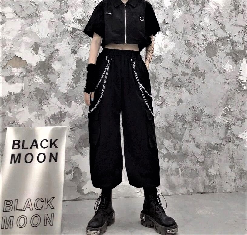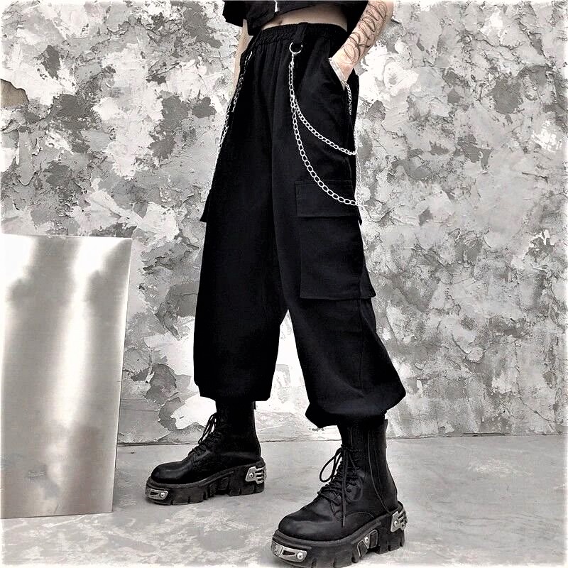 Punk Cargo Pockets Harajuku Metal Chain Detail Drawstring Bottom Hippie Women Loose Trousers