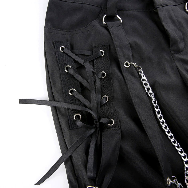 Unique Punk Side Zippers Flare Leg Buckle Chain Eyelets Cross String Details Low Waist Trousers