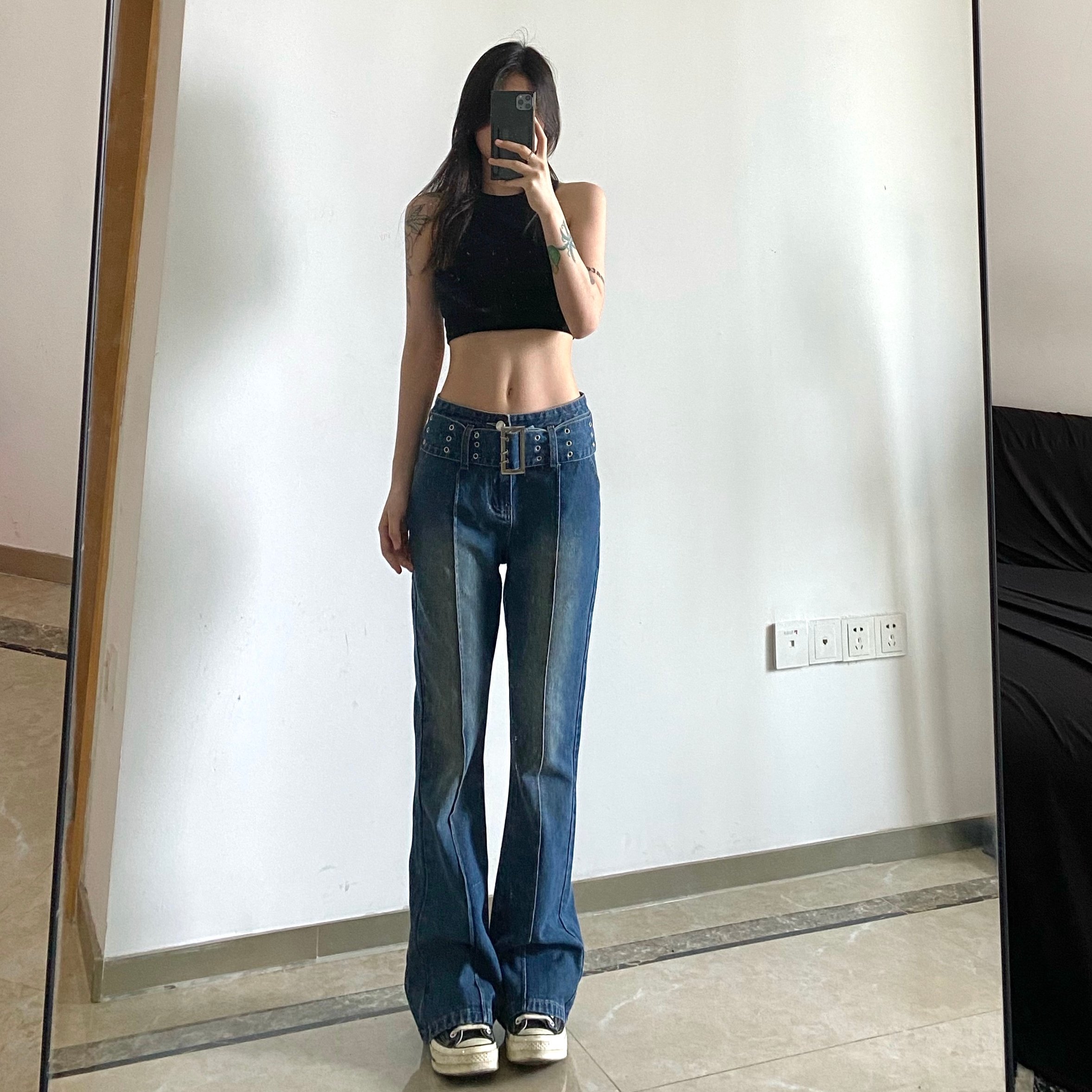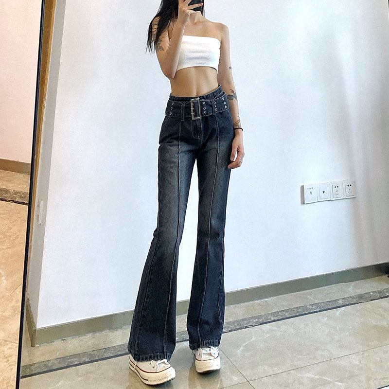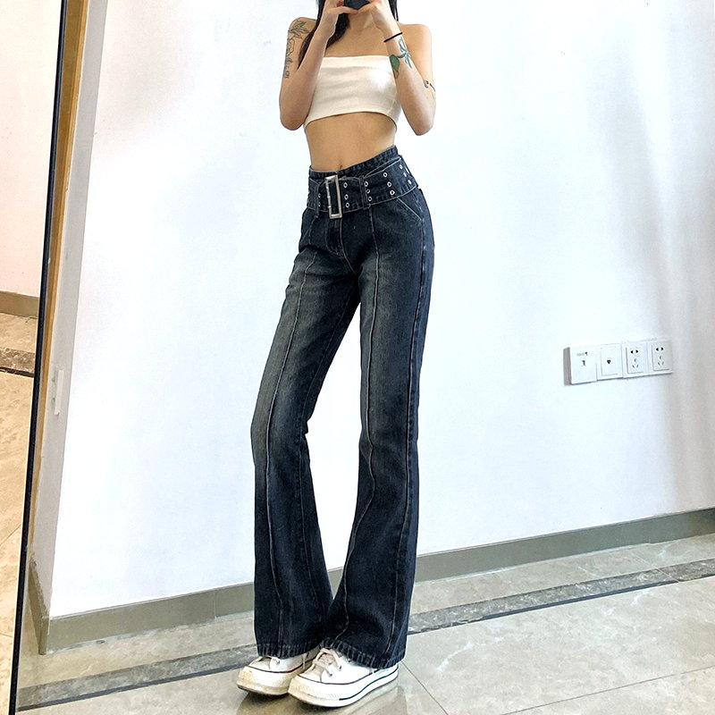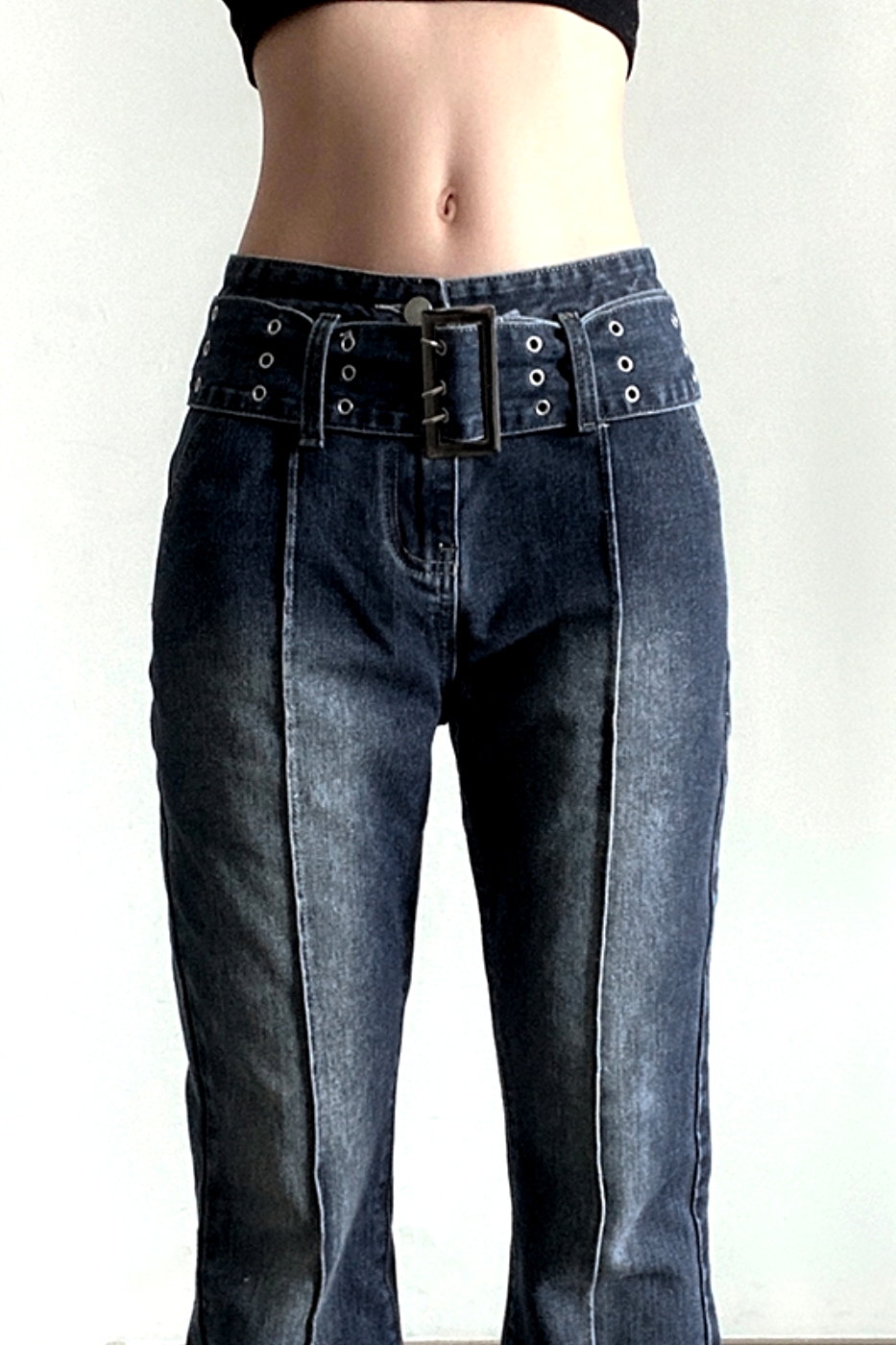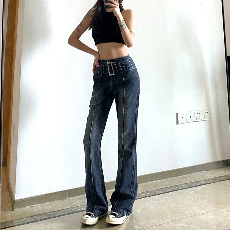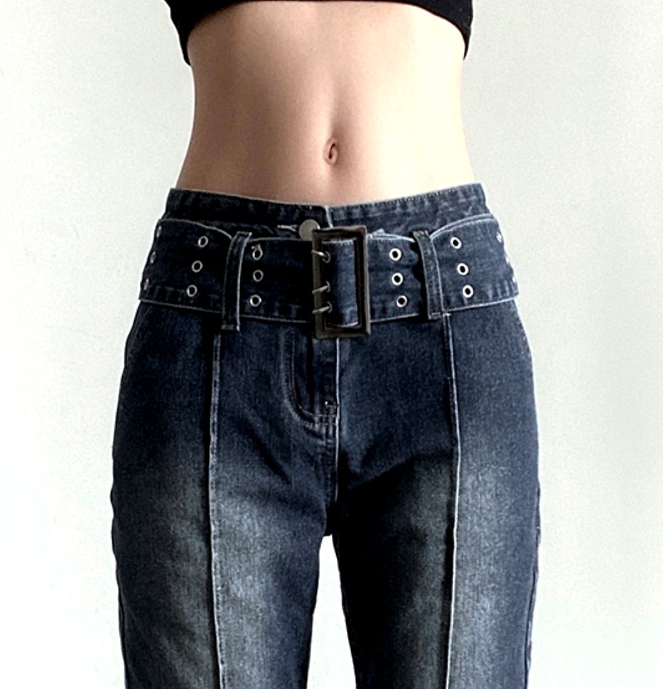Retro Punk Big Buckle Wide Belt Classic Belt Loop Contrast Stripe Stitching Flattering Flare Trousers Y2K 90s Party Barclub Highstreet Amazing