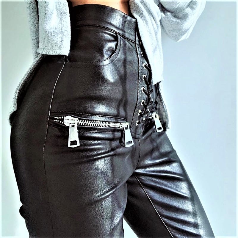Retro Sandy Olivia Grease Style Faux Leather Metal Eyelets Cross Lace-up Zippers Elastic Slinky Straight Trousers Y2K 90s Streetwear Party Amazing
