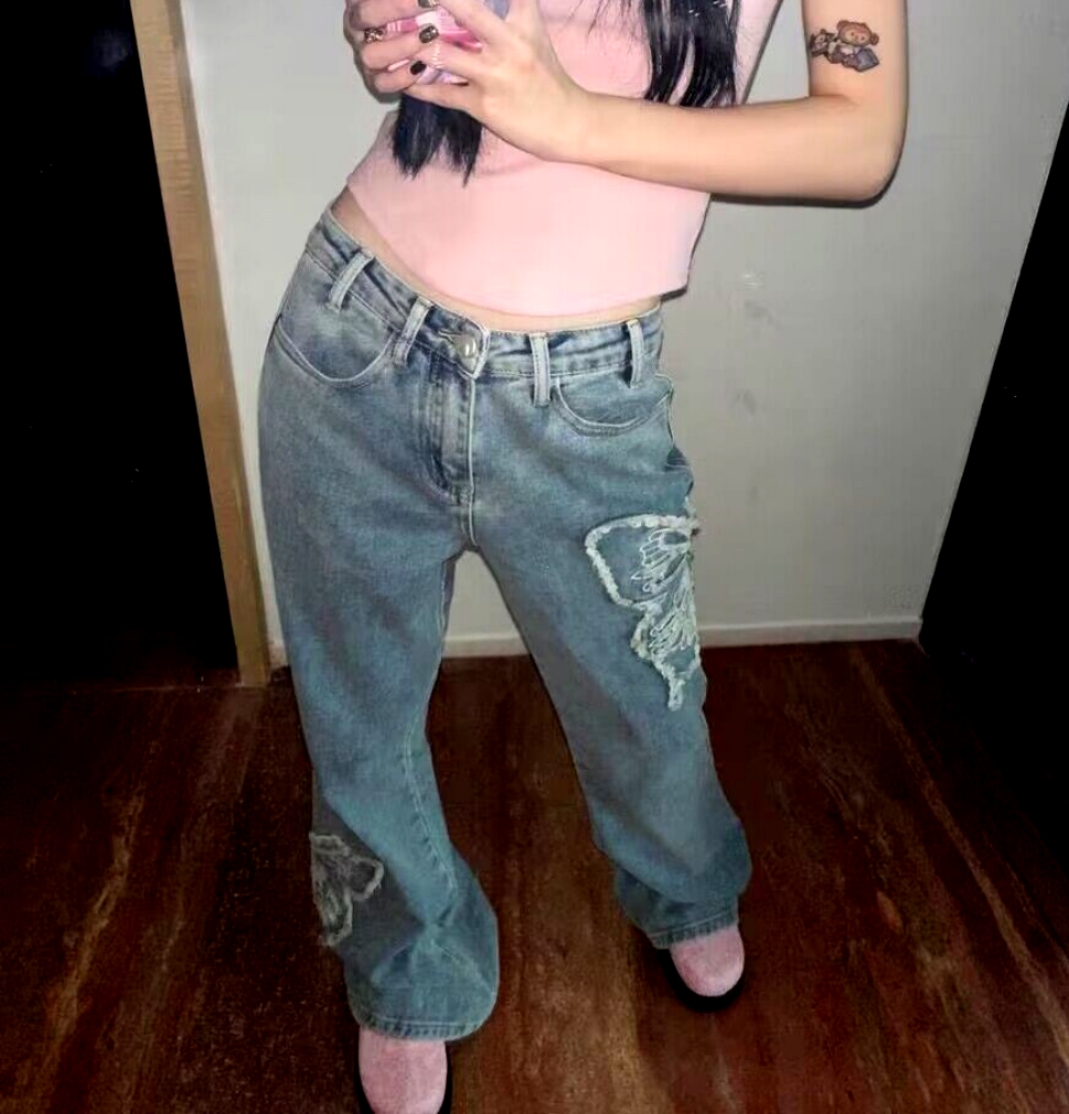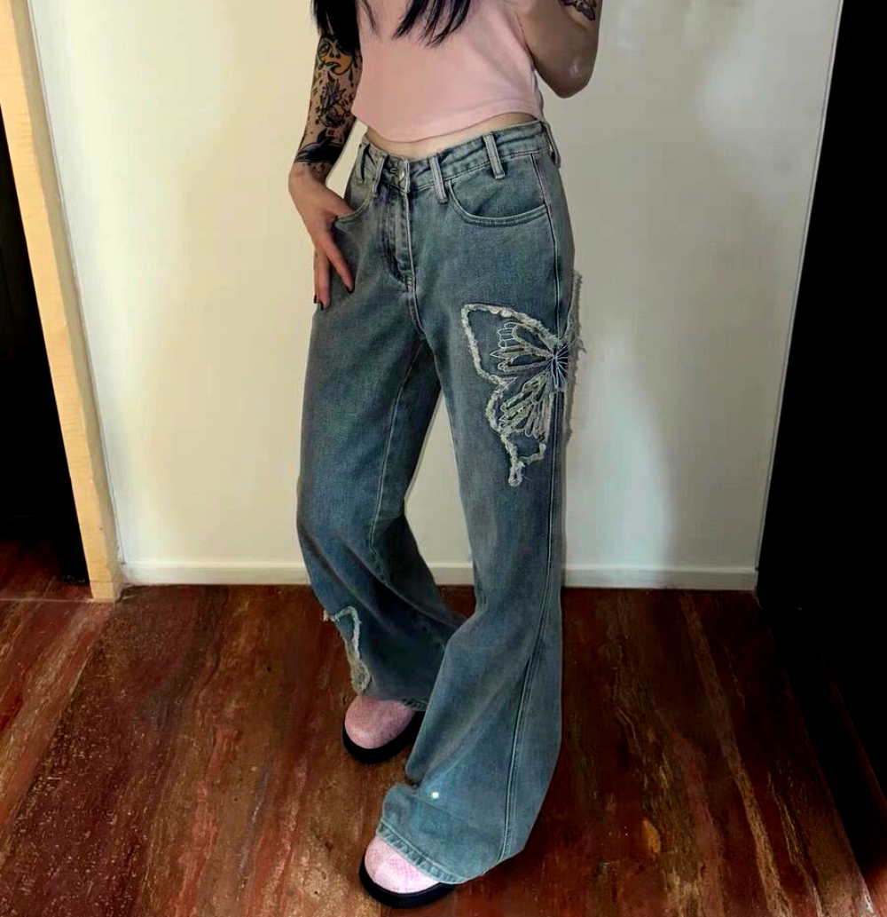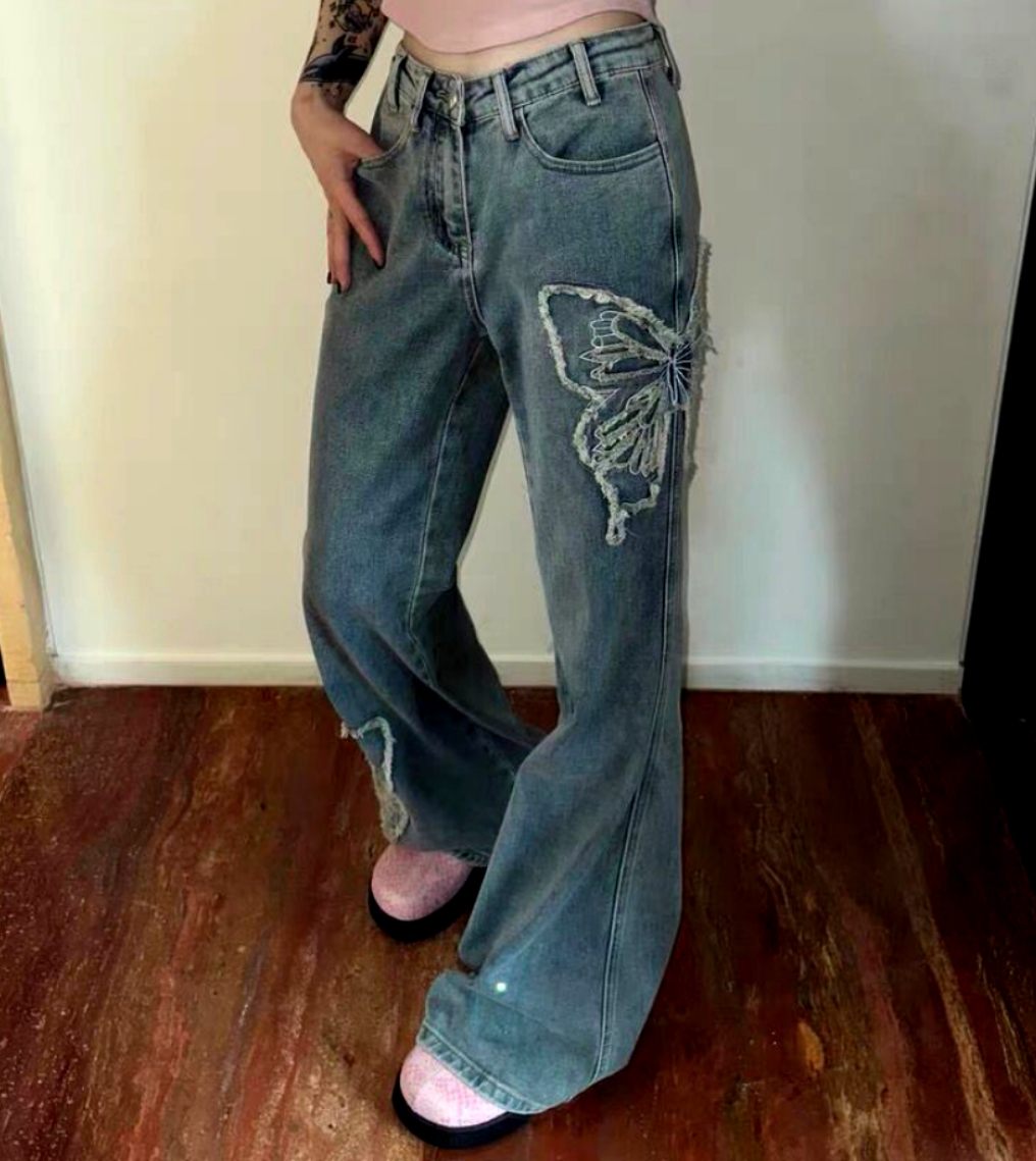 Stunning Punk Grunge Washed Big Butterfly Embroidery Flare Trousers Party Streetwear Amazing