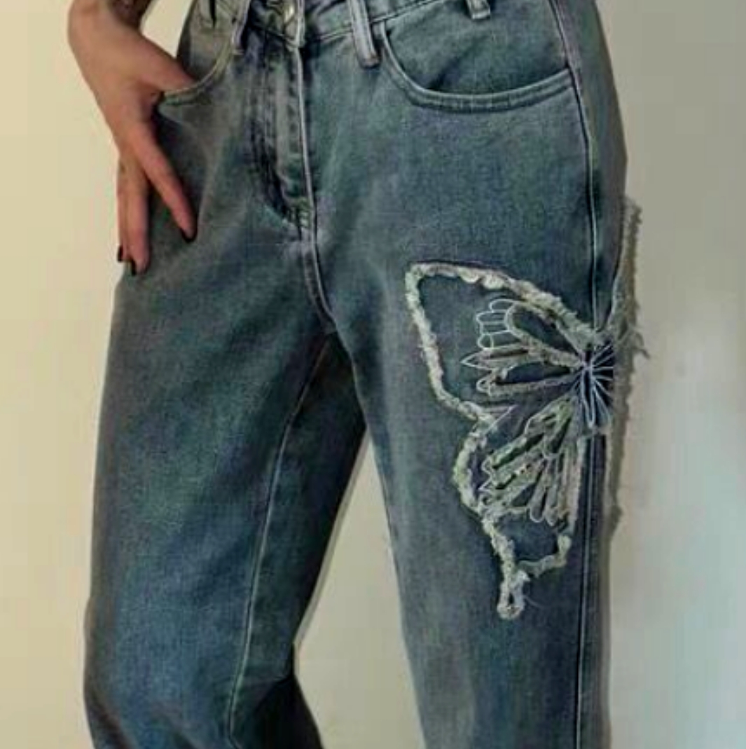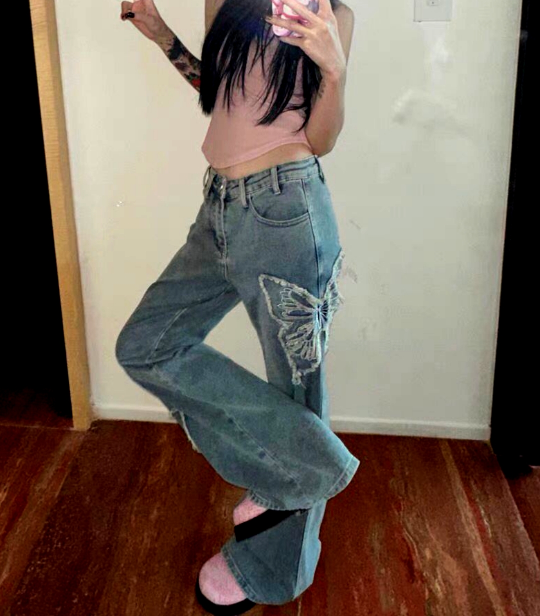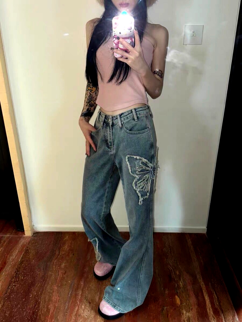 Stunning Punk Grunge Washed Big Butterfly Embroidery Flare Trousers Party Streetwear Amazing