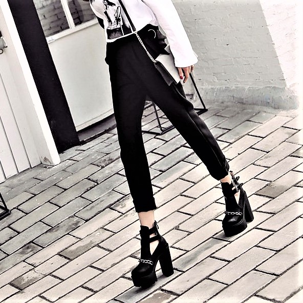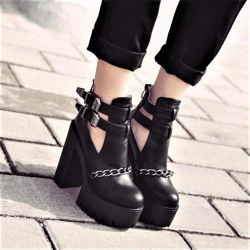 Goth Women Chain Detailing Ankle Buckle Straps Leather Thick Platform High Block Heel Flattering Sandal Shoes