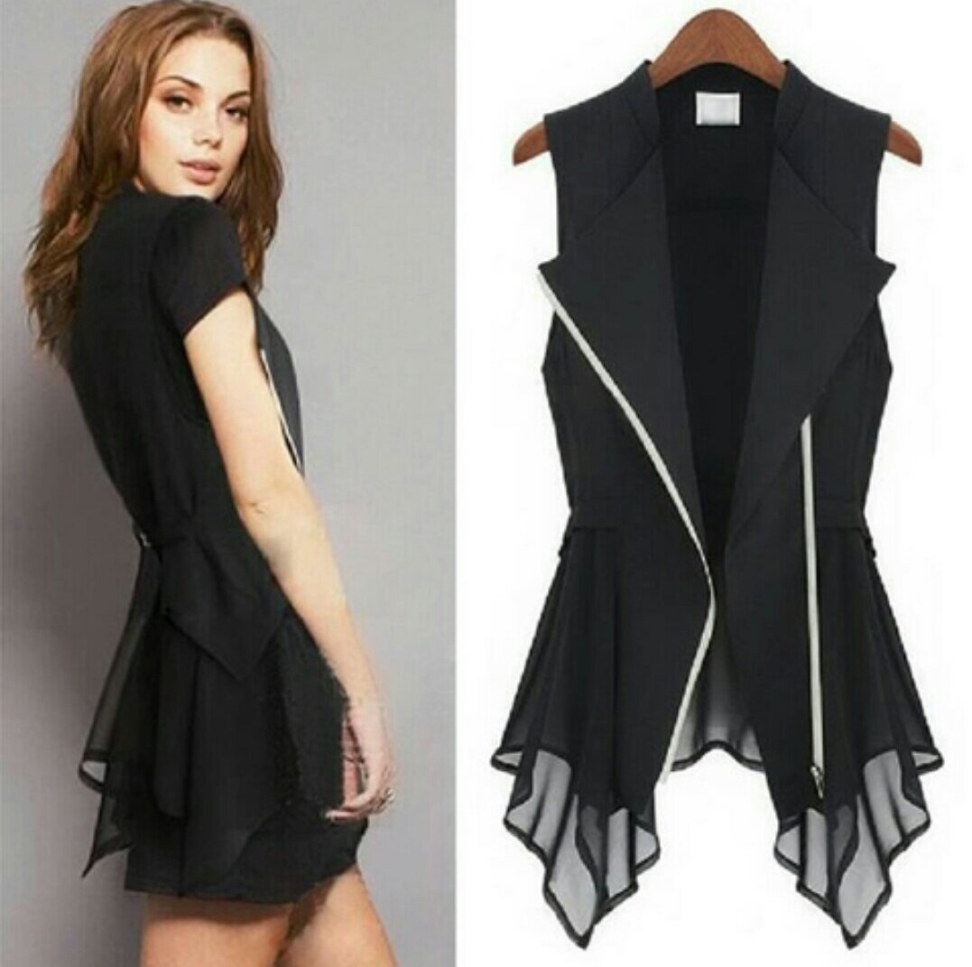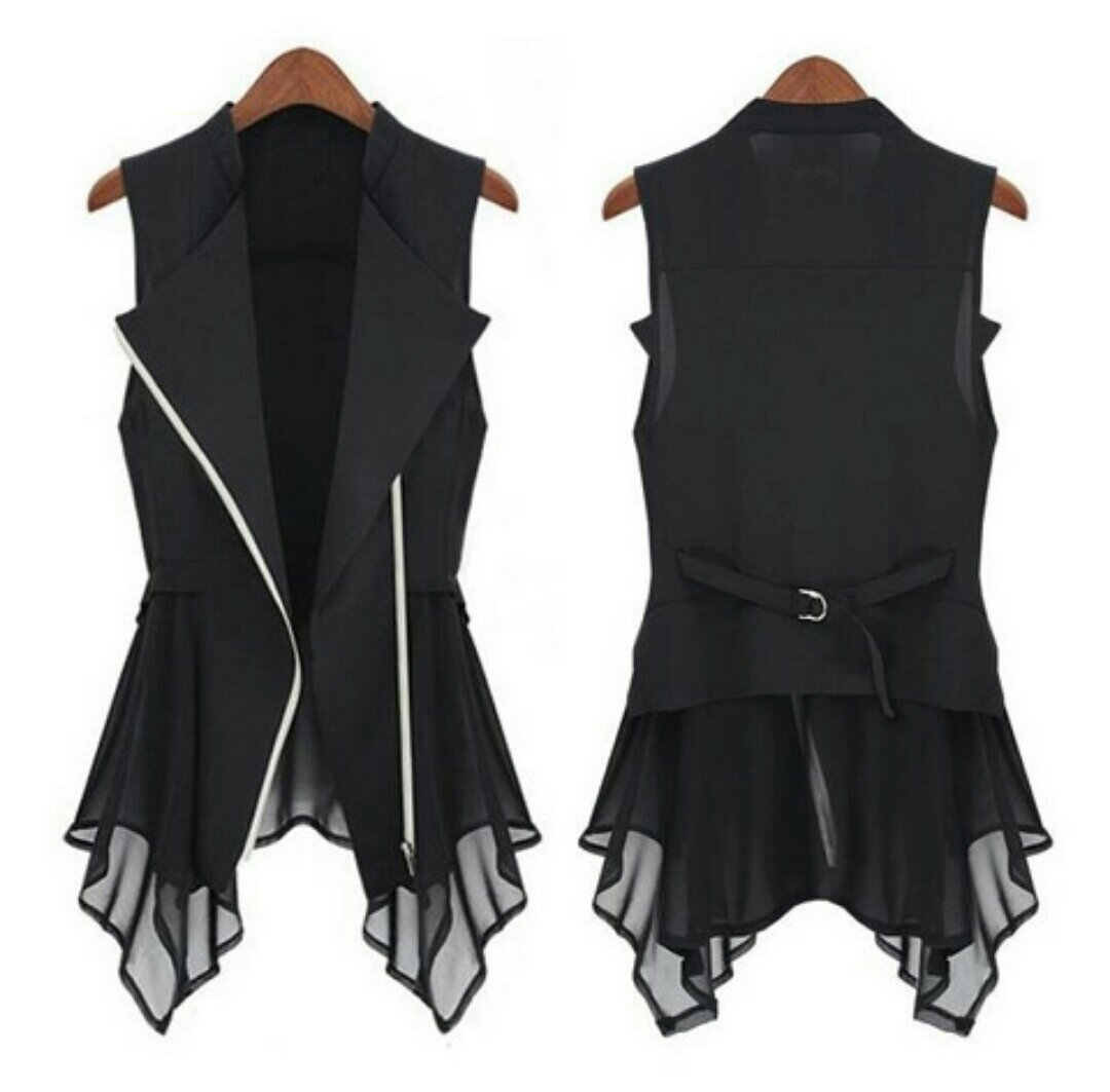 Sexy Women Chiffon Thin Sleeveless Soft Outerwear Zipper Closure Irregular Flounce Buckle Strap Back Fashion Jacket