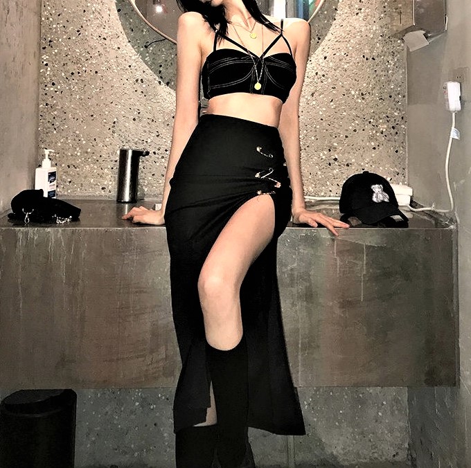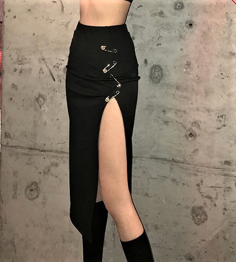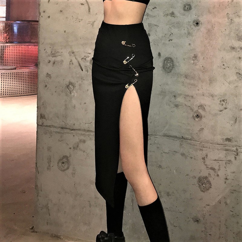 Punk Sexy High Waist Side Split Metal Clasps High Street Long Skirts 90s Y2K Party Nightclub Event Hottest Amazing