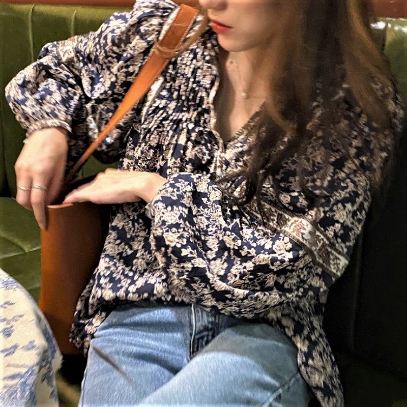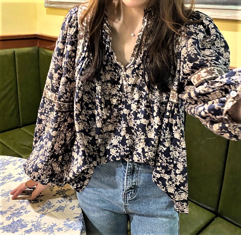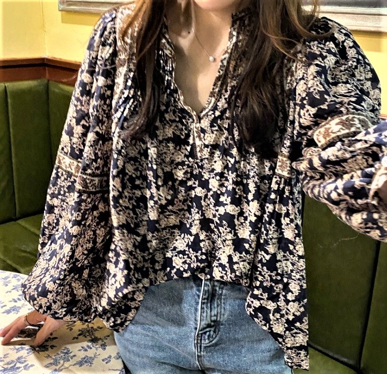Vintage French Puffy Ruffle Paisley Floral Lantern Sleeves Flattering Retro Ruched Blouse