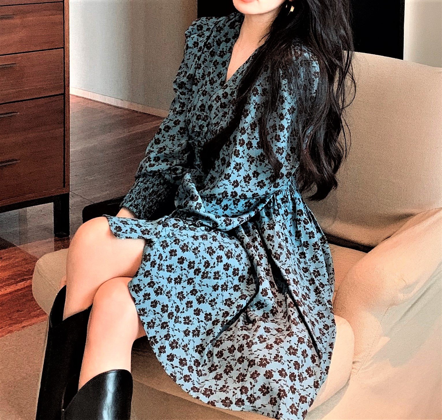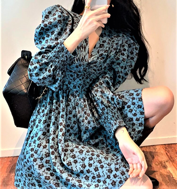 Unique Vintage French Chiffon Ruffle Floral Puffy Sleeve Ruched Dress