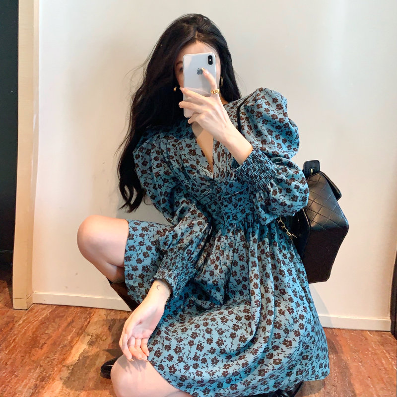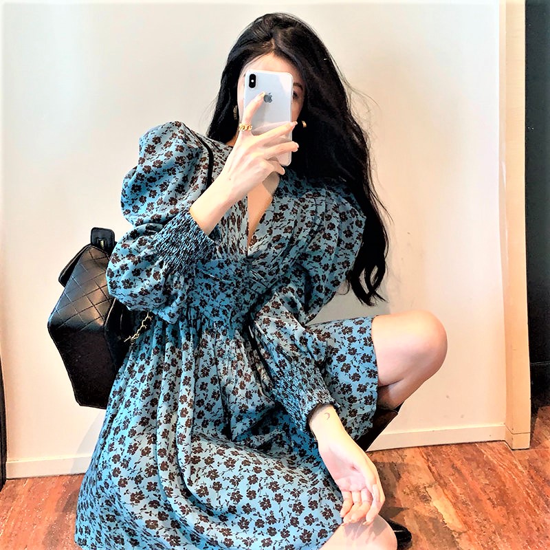 Unique Vintage French Chiffon Ruffle Floral Puffy Sleeve Ruched Dress 90s Y2K Party Nightclub Dating Occasion Amazing