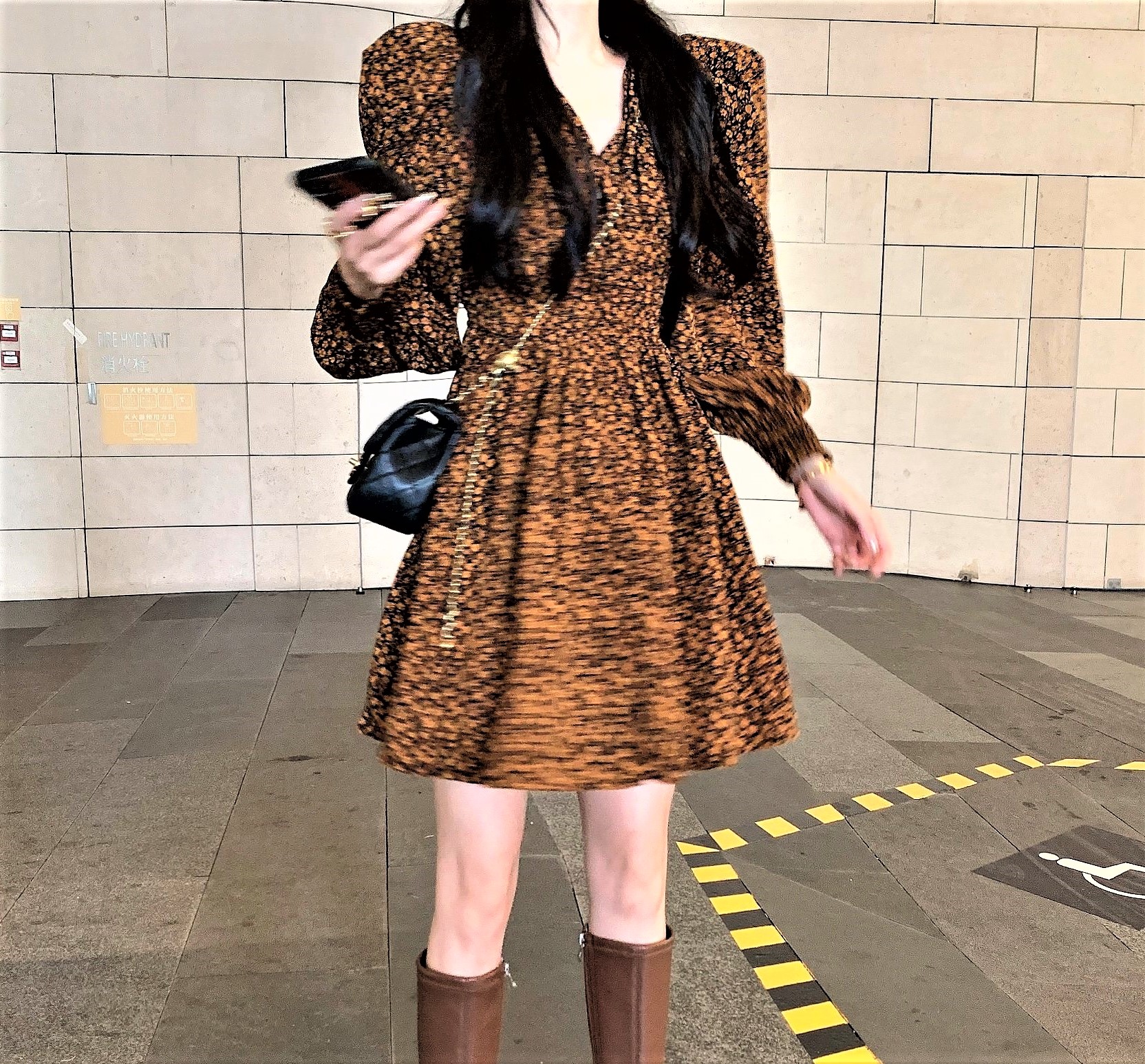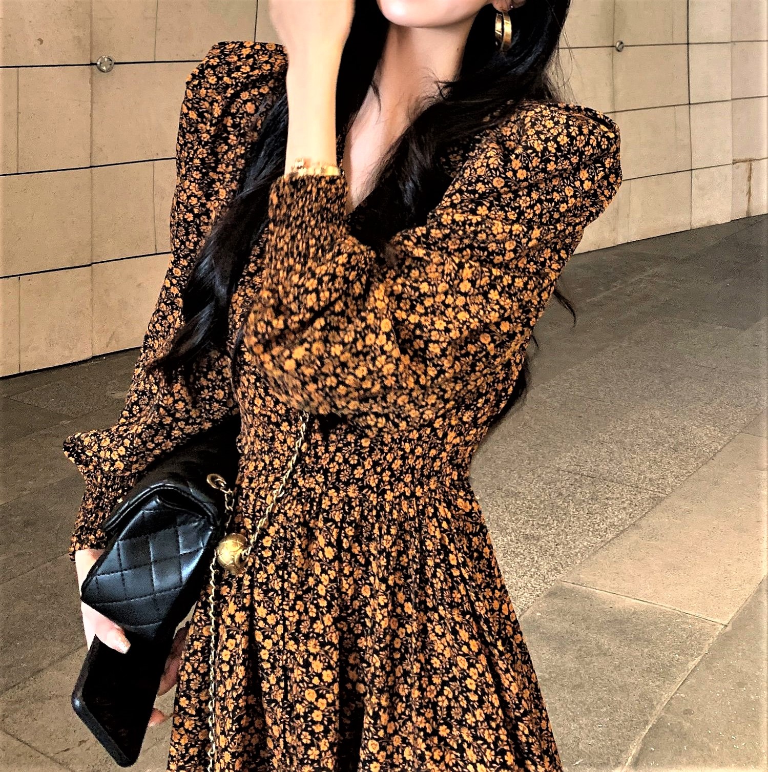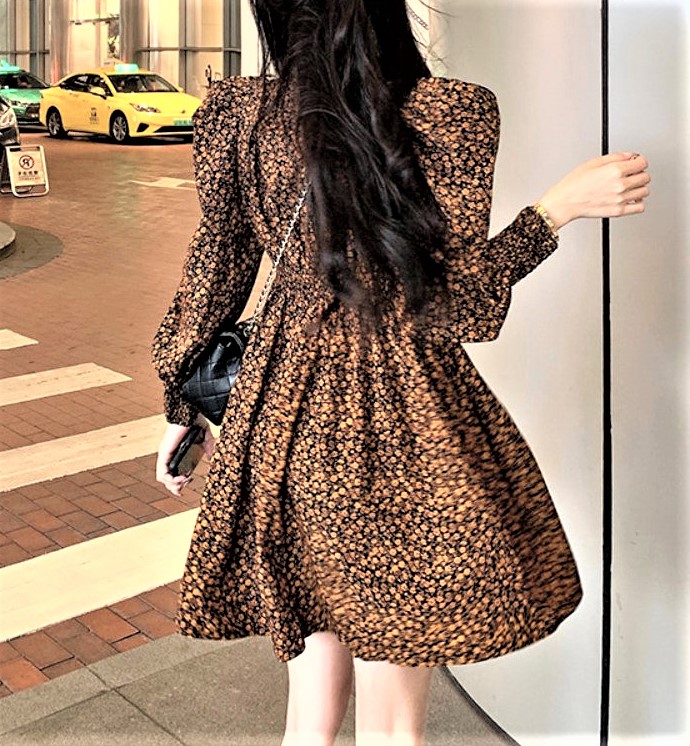 Vintage French Chiffon Ruffle Floral Puffy Sleeve Ruched Dress