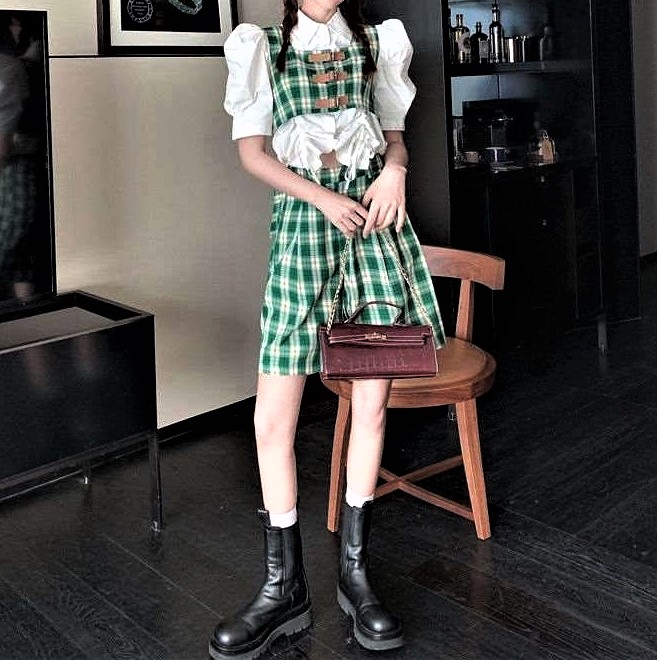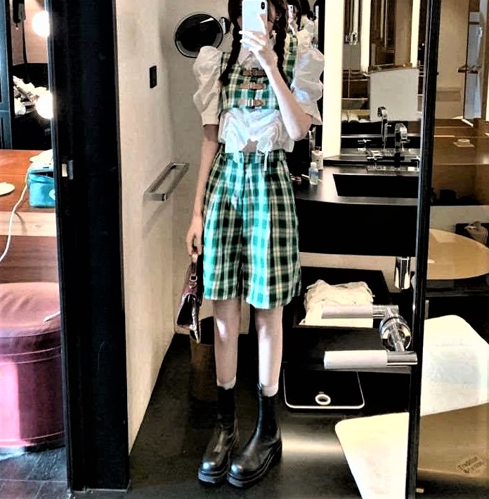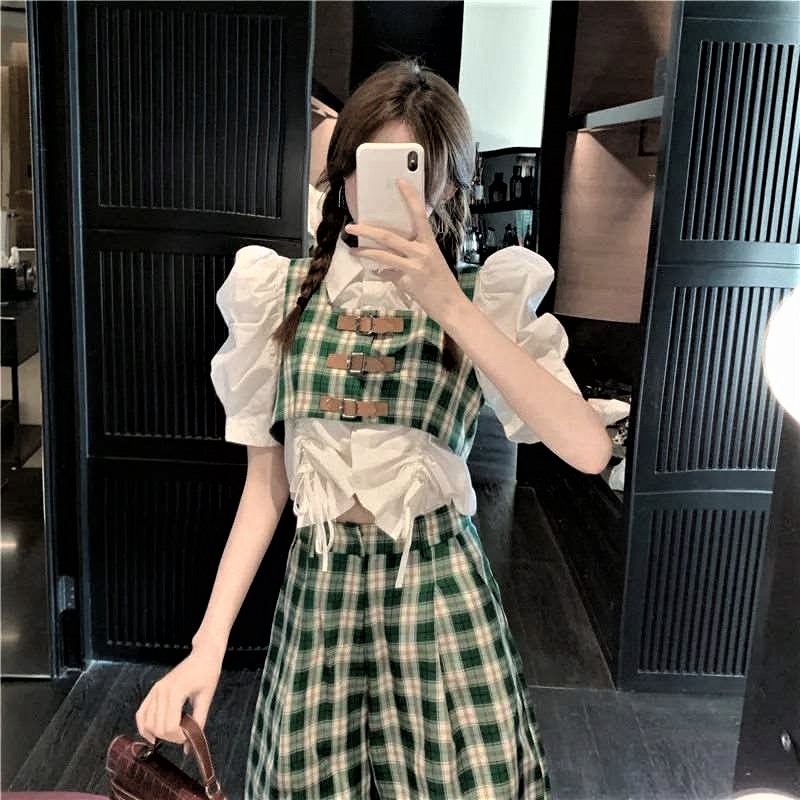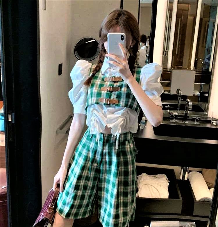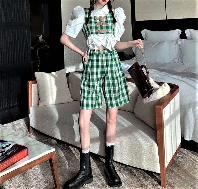 Vintage England Checked Buckle Straps Front Detailing Trims Butterfly Tie Big Knot Backless Top Baggy Checked Loose Shorts Pants