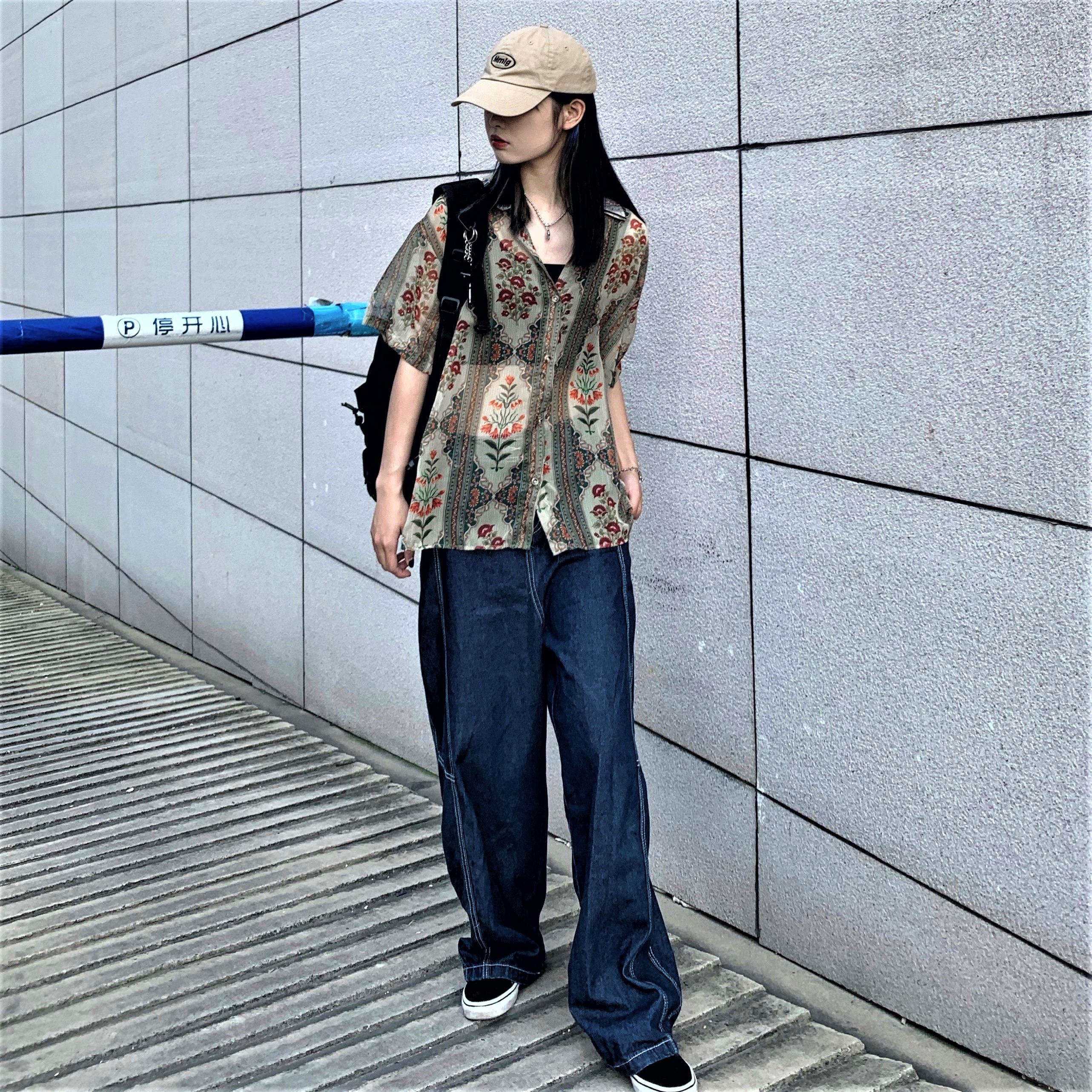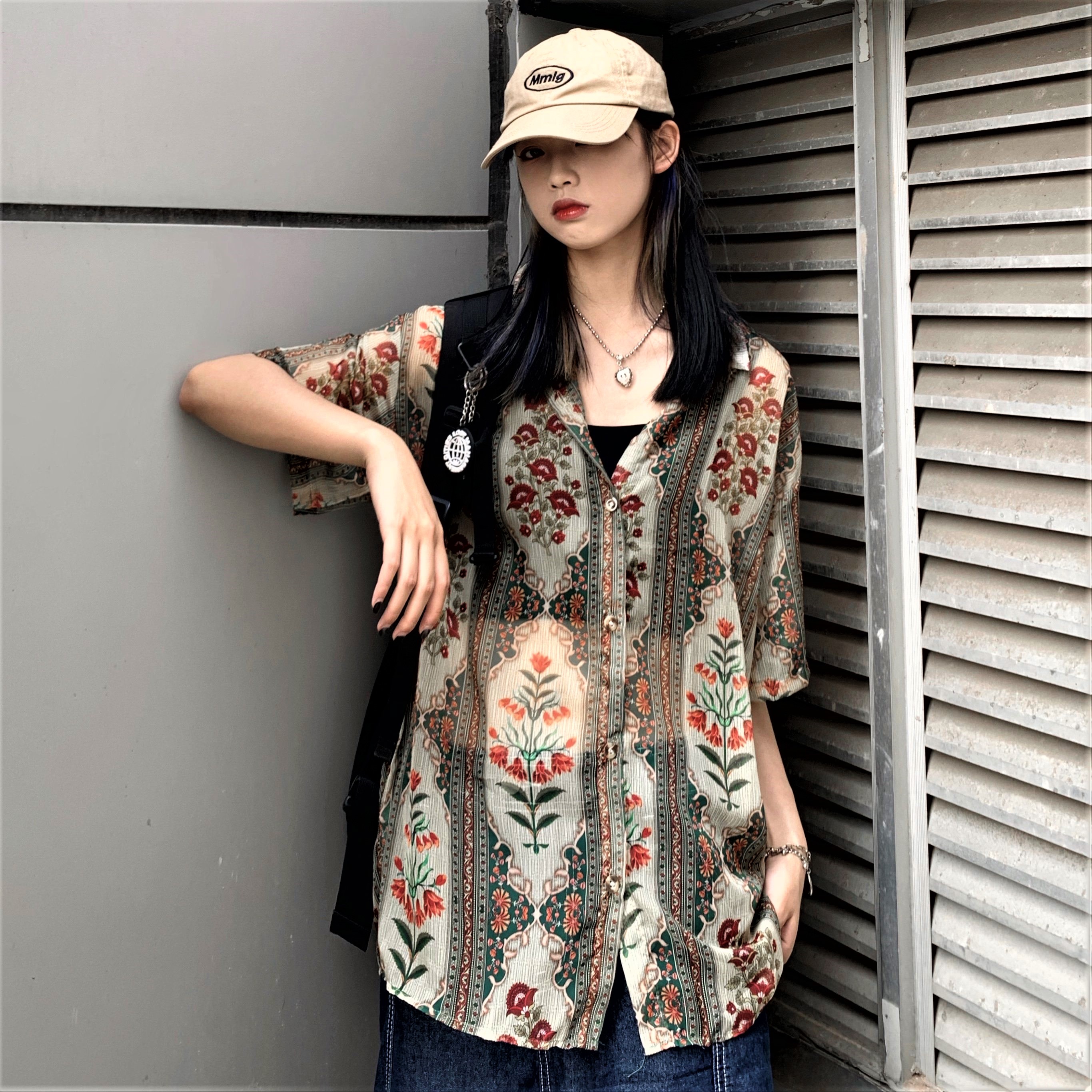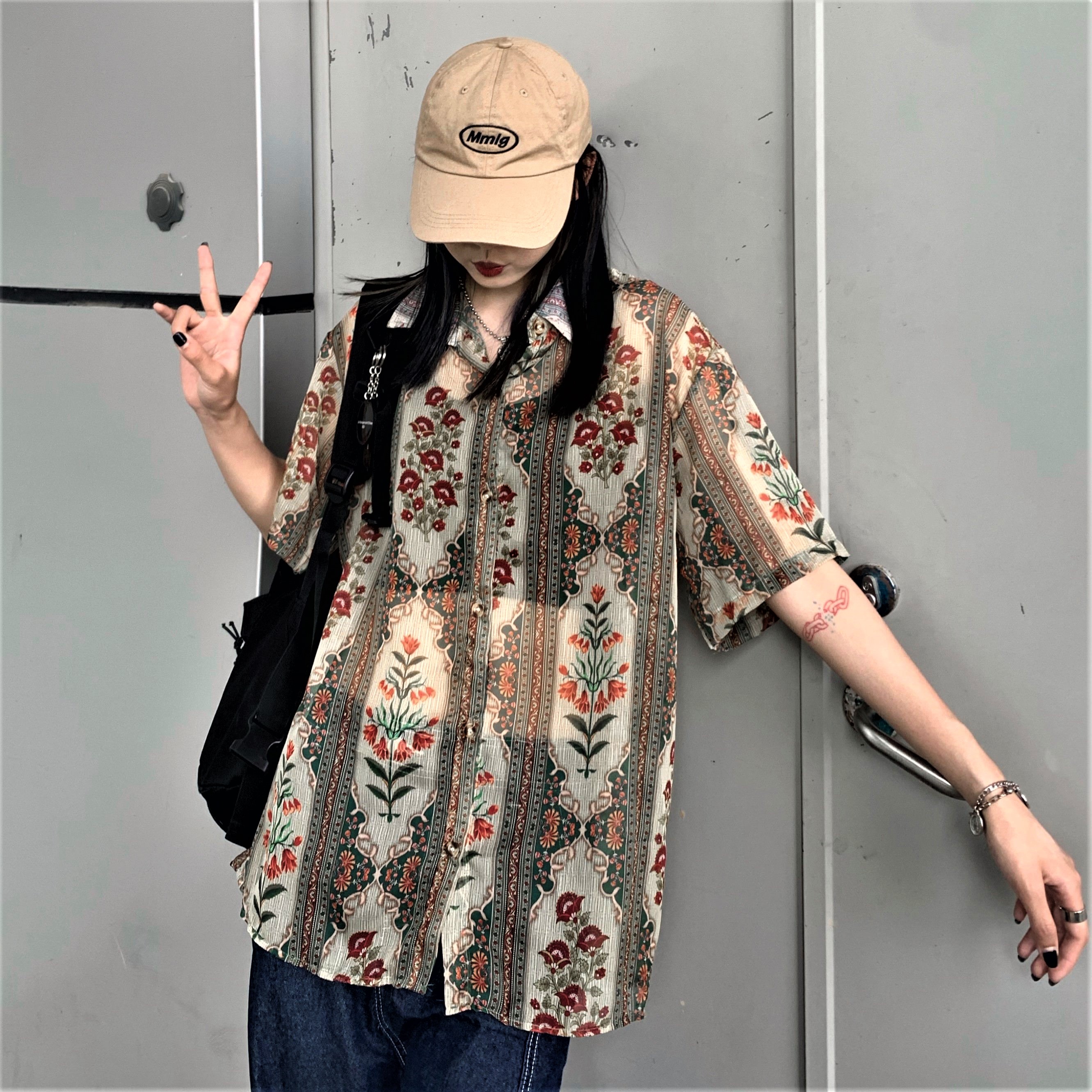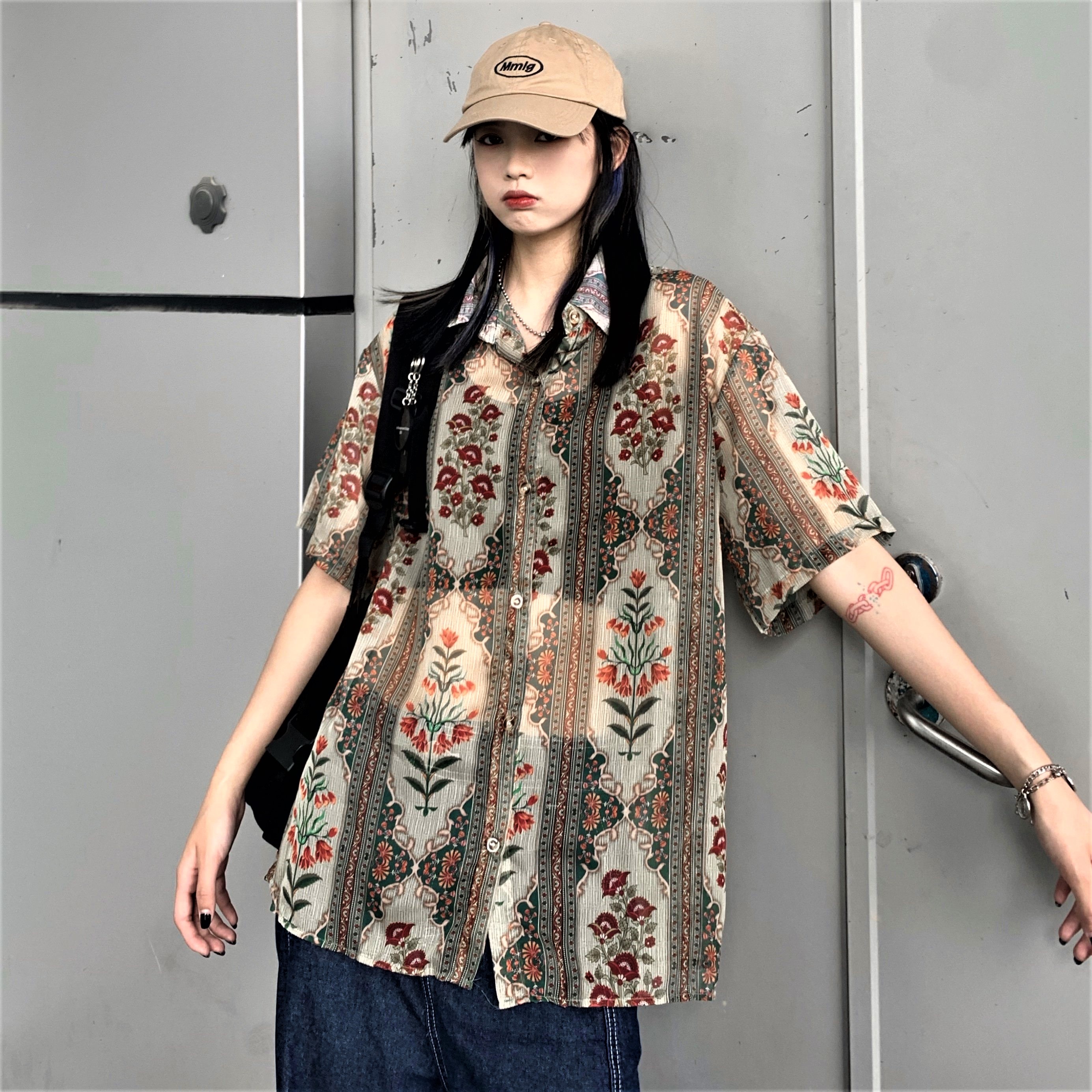Vintage Retro French Paisley Floral Mesh Short Sleeves Collar Buttoning Closure Flattering Loose Blouse 90s Y2K Party Nightclub Dating Occasion Amazing